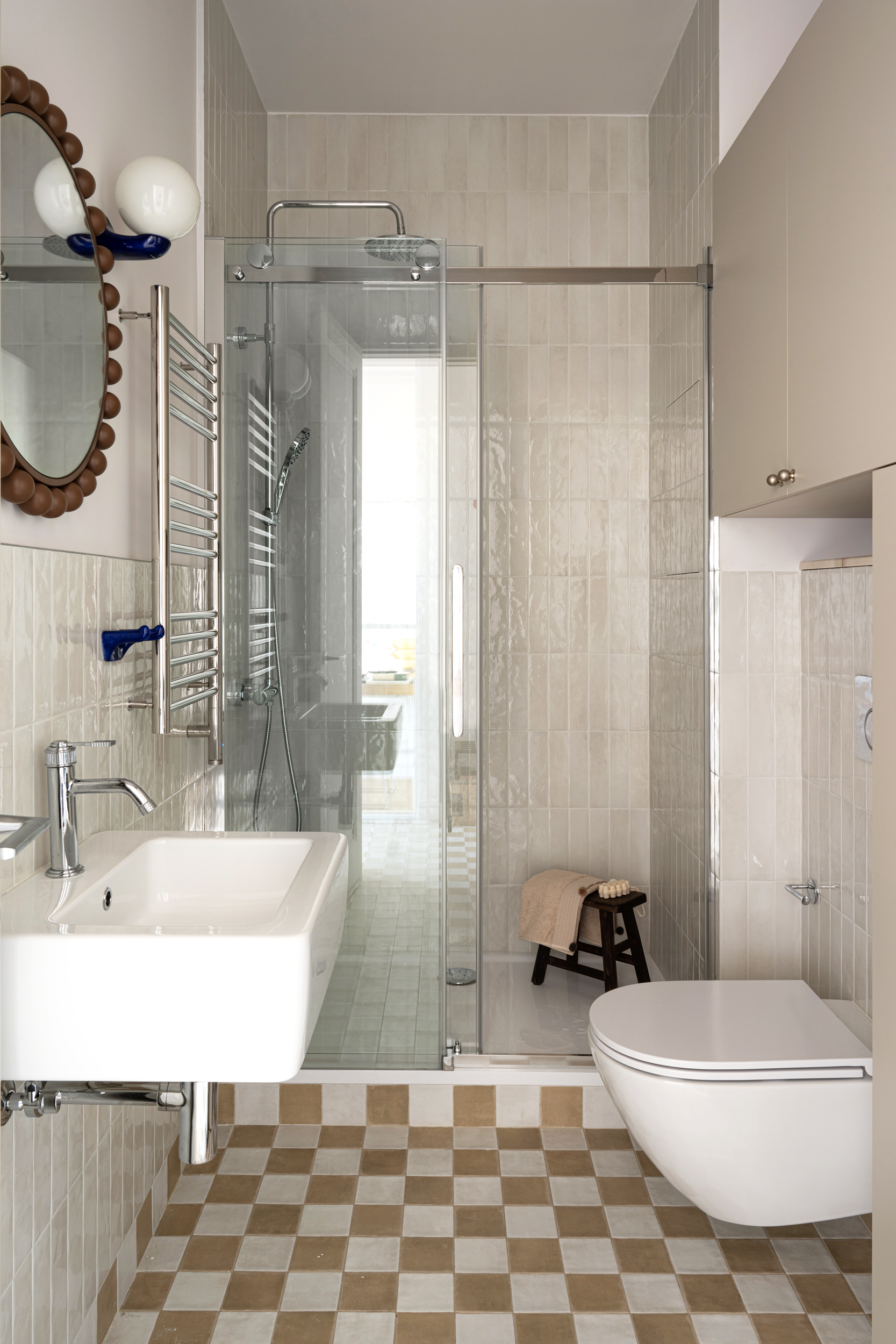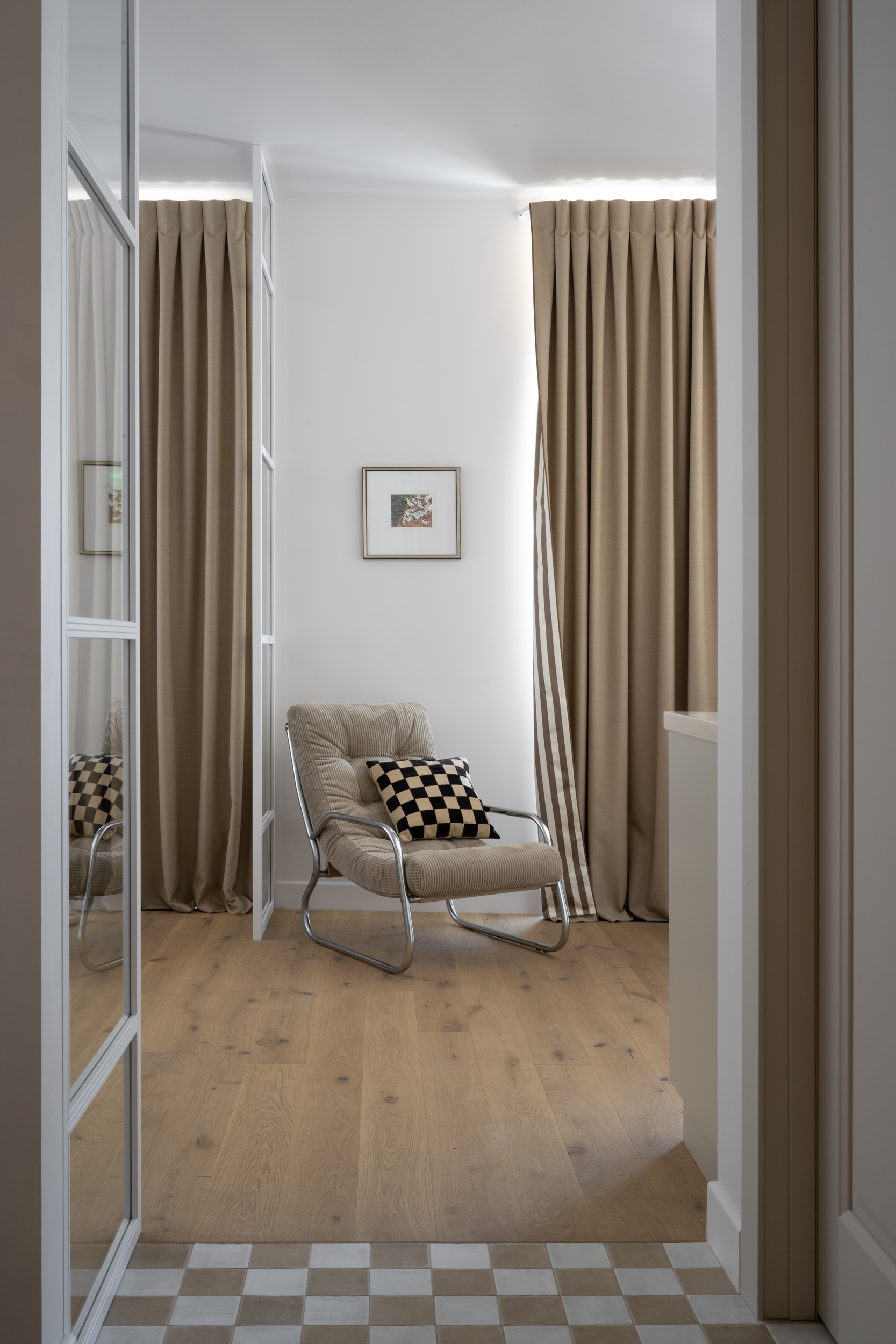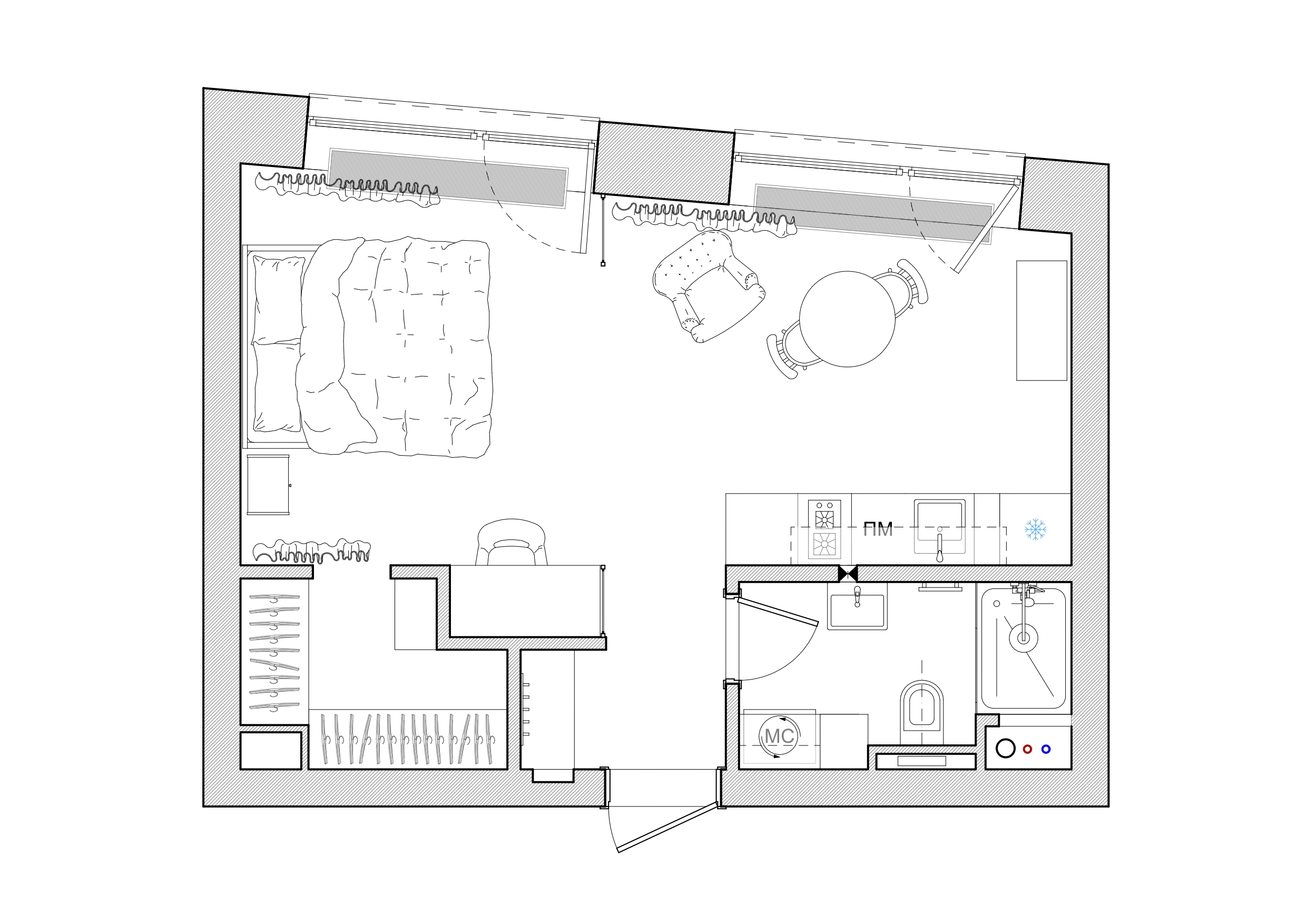Планировка застройщика оказалась достаточно удобной: студия была разделена на две равные части, что определило расположение функциональных зон. Дизайнер лишь немного уменьшил гардеробную и перенес вход в спальню, чтобы освободить место в прихожей. Главное достоинство квартиры – большие окна, которые наполняют пространство светом и стирают грань между интерьером и окружающим пейзажем. Чтобы усилить этот эффект, стены покрасили в белый цвет. На пол в основной комнате положили техническую доску теплого оттенка, а в зале и санузле использовали небольшую плитку с шахматным рисунком.