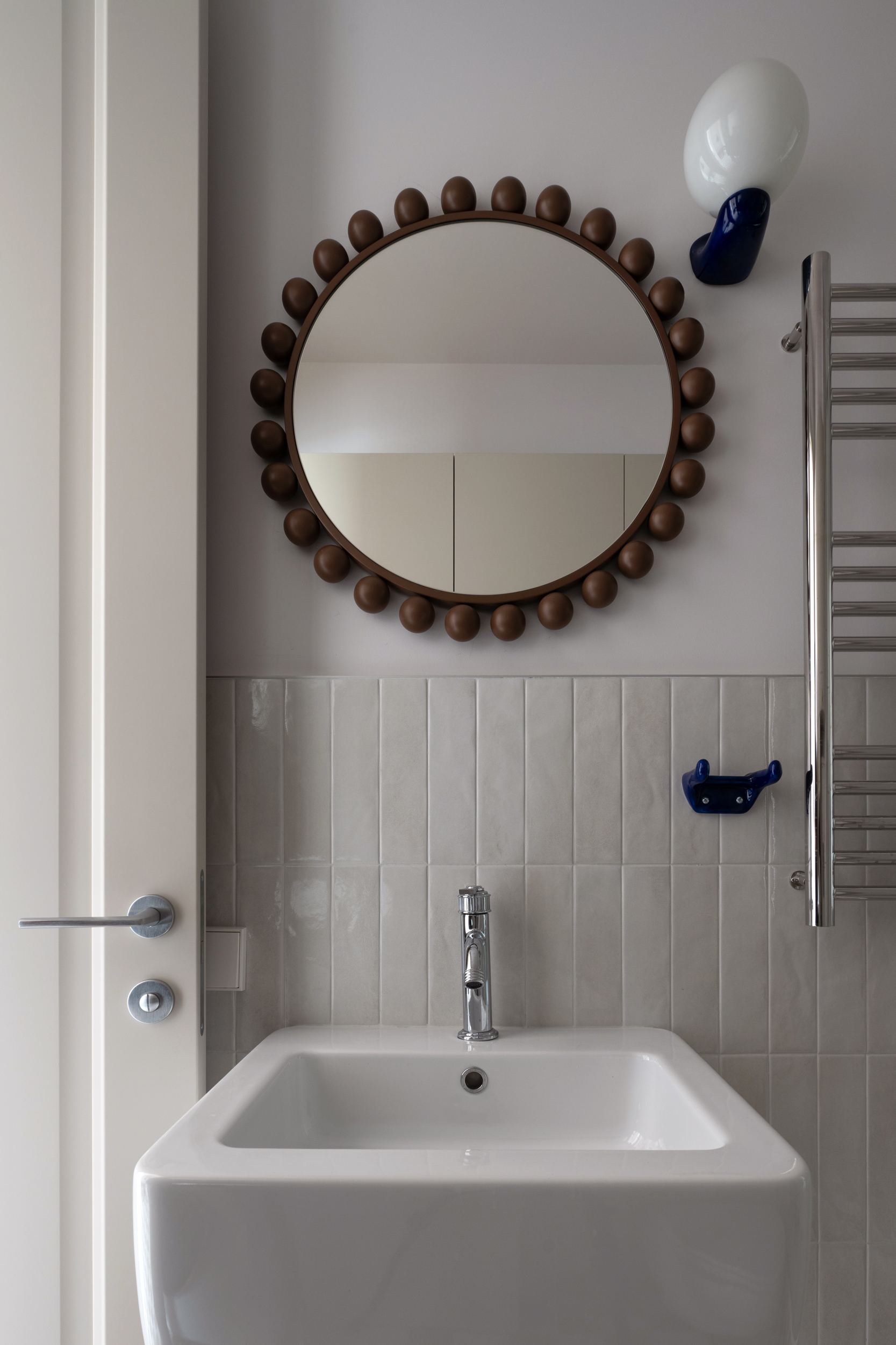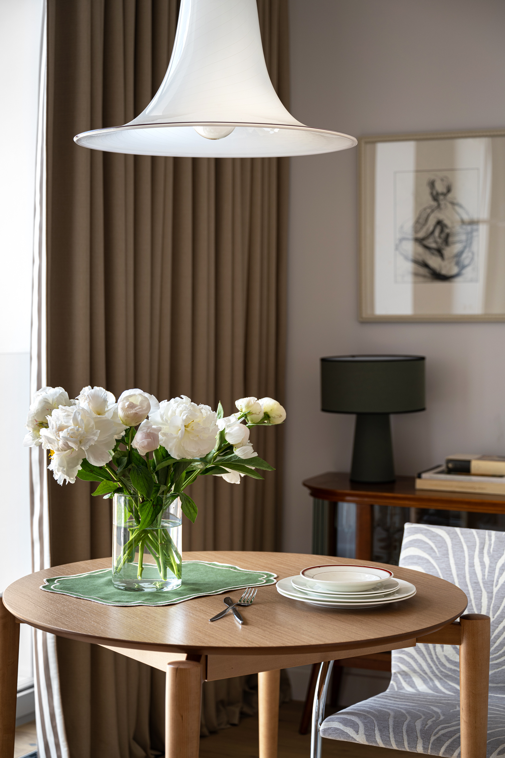 Отправной точкой проекта стал подвесной светильник, украсивший обеденную зону. «Гладкое матовое стекло и тонкая кайма винного цвета вдохновили на создание легкого, яркого интерьера с мелкими контрастными деталями», — говорит Надежда. — Так появились цветовые акценты в монохромной гамме: синие чемоданы и керамический крючок в ванной, красные крючки в прихожей, яркие настольные лампы, подушки и моя любимая деталь здесь — полосатая подкладка штор, которая видна только при движении текстильного полотна. »
