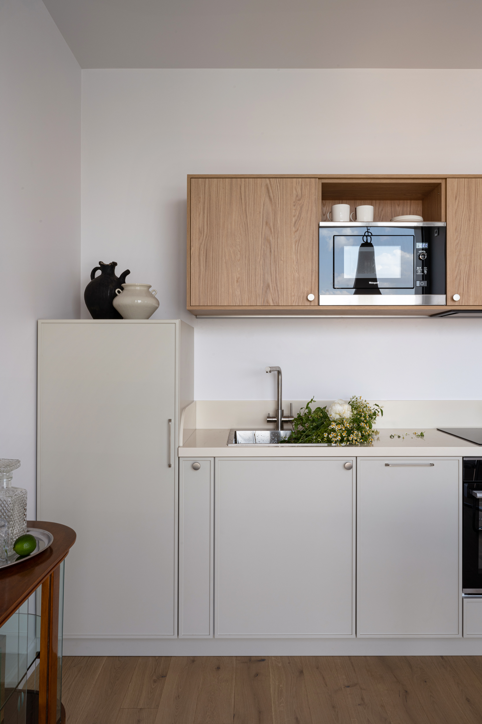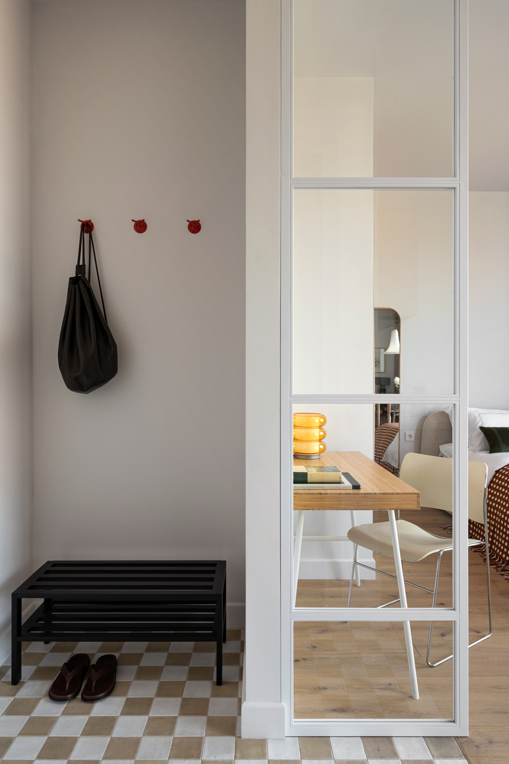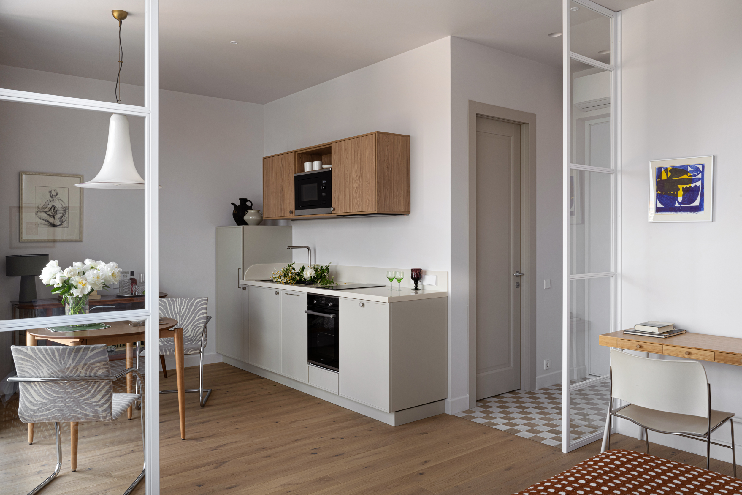 Работа с объектами на сдачу имеет свои особенности, обычно она предполагает небольшой бюджет, ограниченные условия и практические решения, в рамках которых необходимо создать интерьер, который будет выделяться среди сотен рекламных объявлений. В этой квартире площадью 34 кв. Метрам Надежды Комаровой пришлось создать «чистое» и универсальное пространство, рассчитанное на одного, максимум двух человек. «Мы просто хотели попросить, чтобы будущие жильцы интерьера наполнили его своими любимыми вещами», — говорит дизайнер.