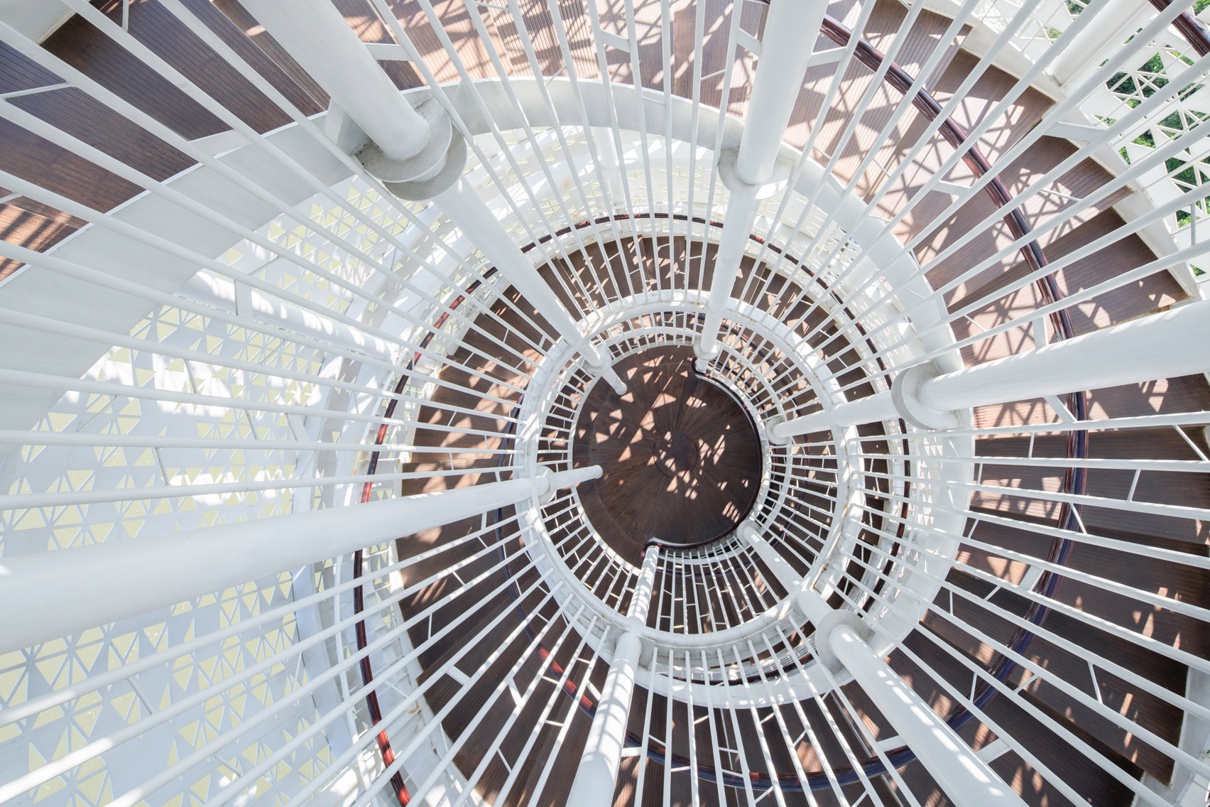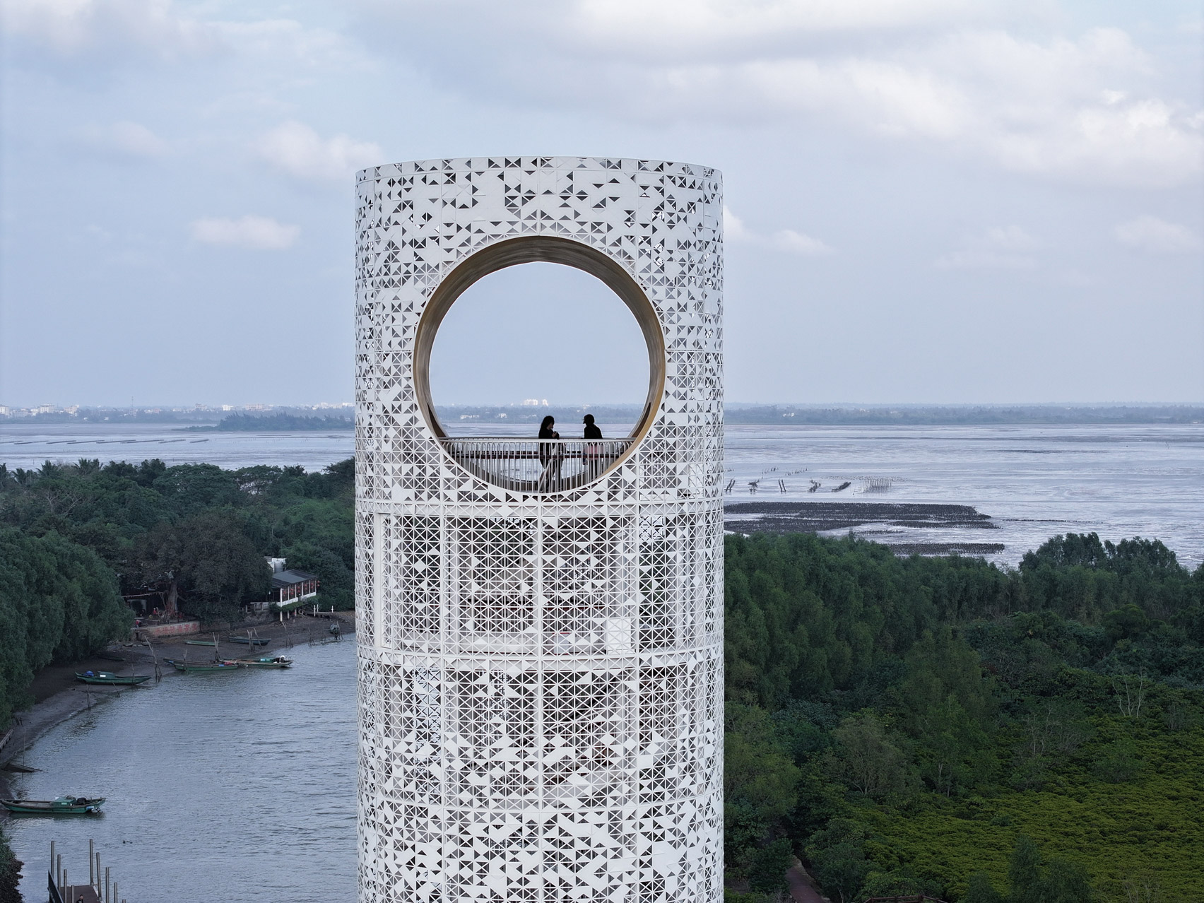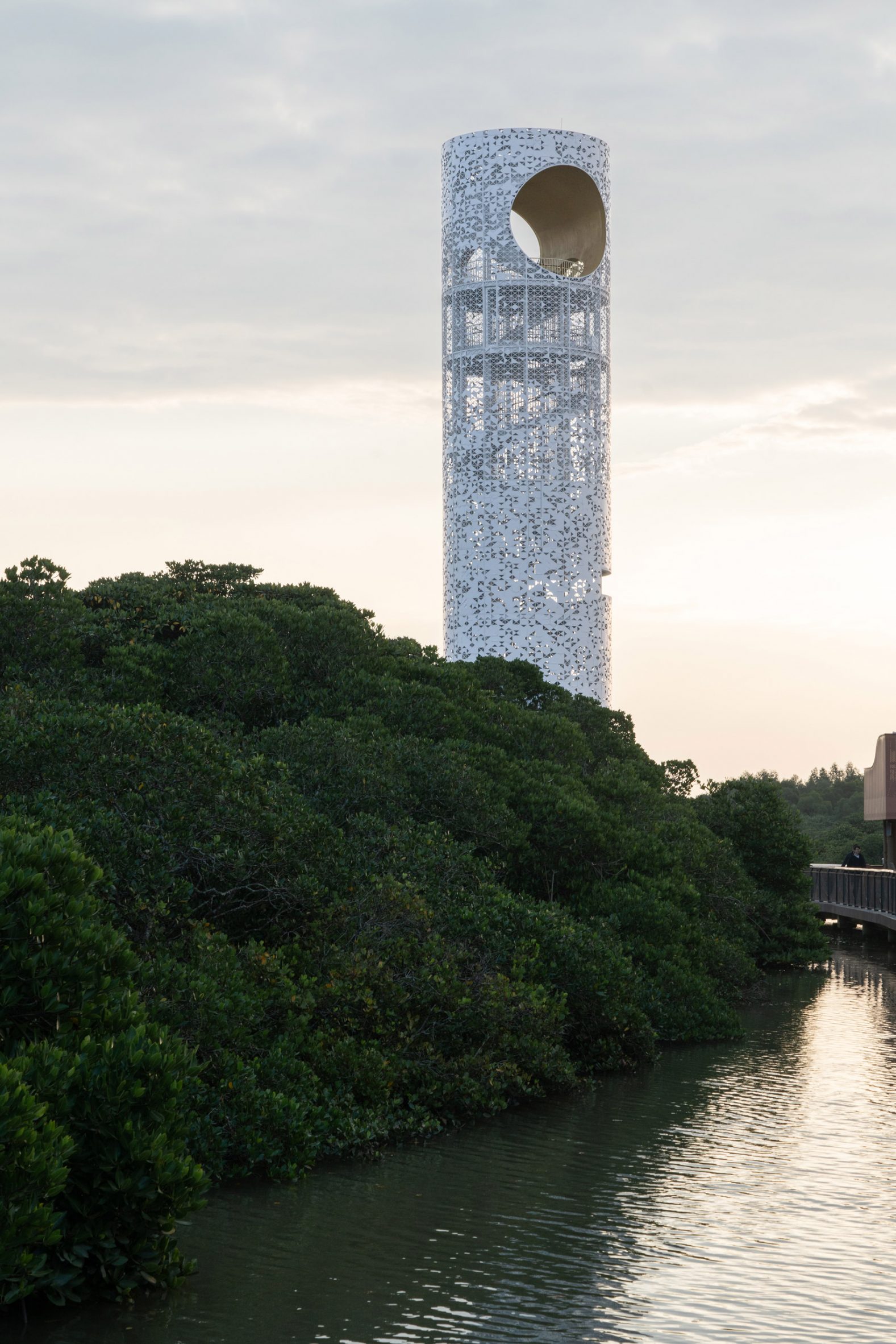 Конструкция легкая, но при этом выдерживает тайфун с порывами ветра до 15 баллов. Фасады выполнены из перфорированных алюминиевых панелей, которые украшены узором, напоминающим форму листьев мангрового дерева. Башню поддерживают 18 стальных труб, которые соединены с ребрами лестниц и кольцевыми балками смотровых площадок. Для большей устойчивости и прочности колонны в основании были залита бетоном.