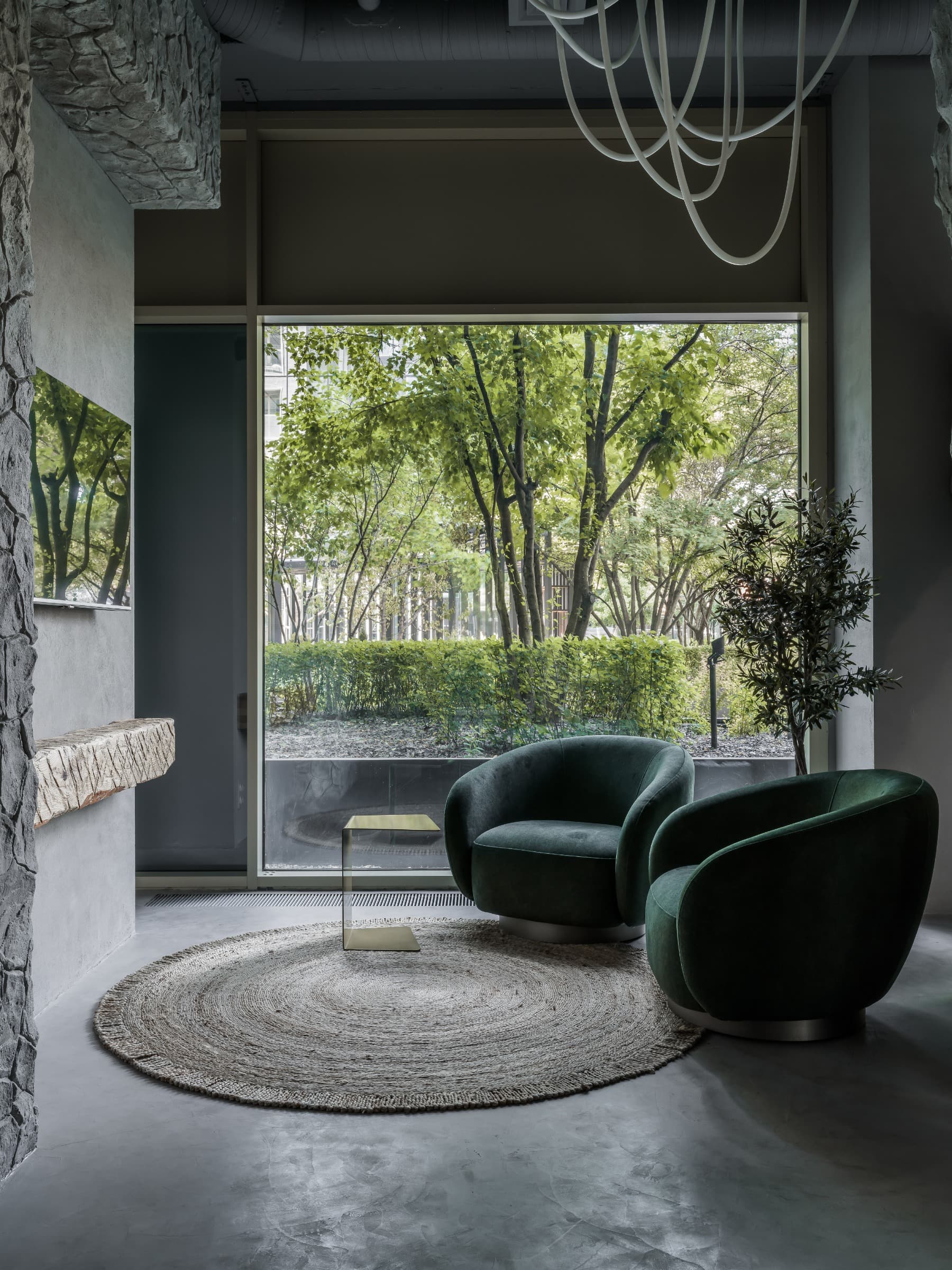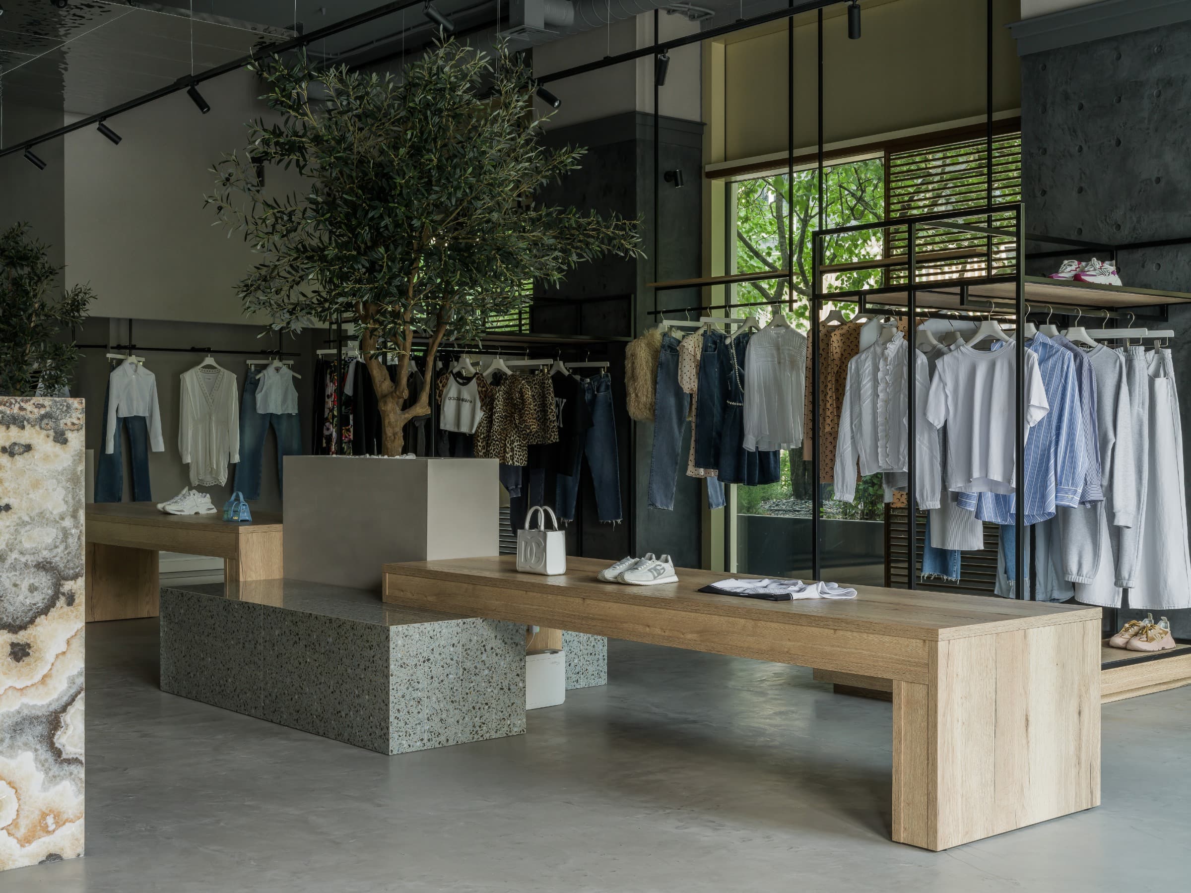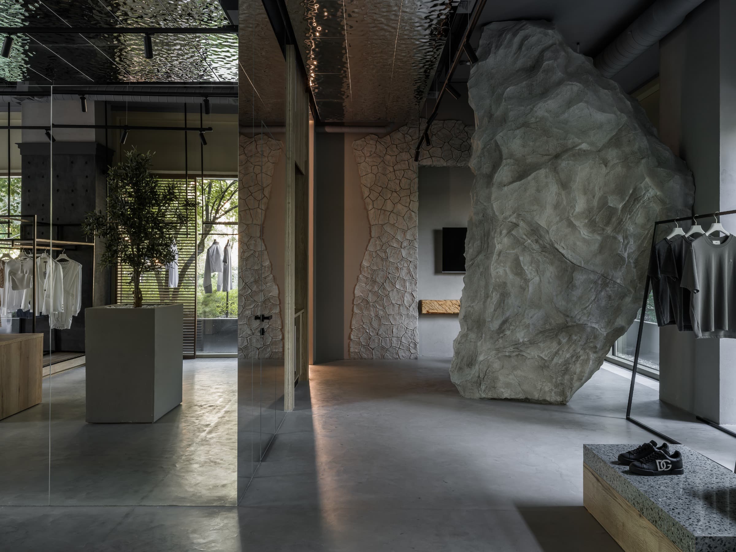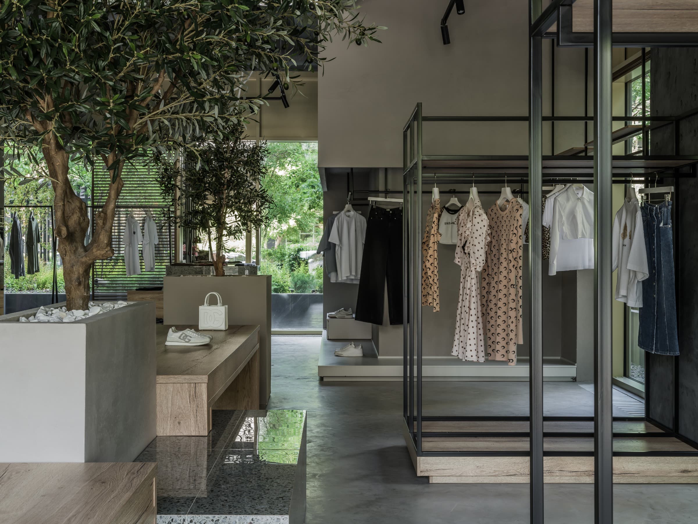 «Центральная часть бутика — это настоящий манифест архитектурной поэзии. Оливковые деревья, которые установлены непосредственно на обменном этаже, отправляются в Средиземноморье, а шкаф с фарфоровыми опухолями под терраццо приглашается сесть, а декоративный скал дополняется всеми посетителями».