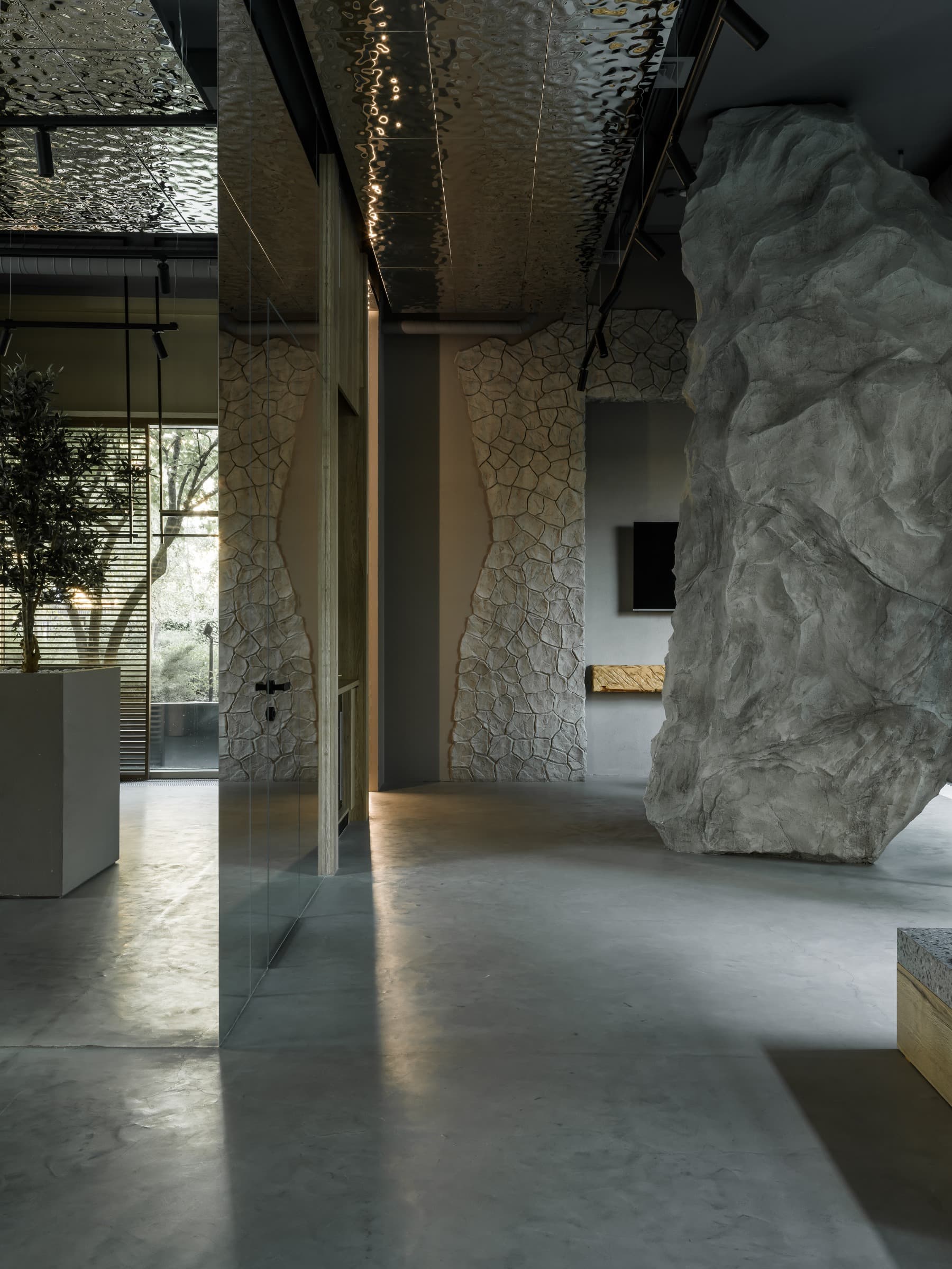 «Кассовый аппарат изготовлен из выразительного натурального оникса, а потолок украшен панелями с воздействием Rowan на воду. Нейтральный бетонный пол, намеренно потрескивается в черных полу -корловых — эти детали не являются шансом, они носят ассоциативную и символическую напряженность.