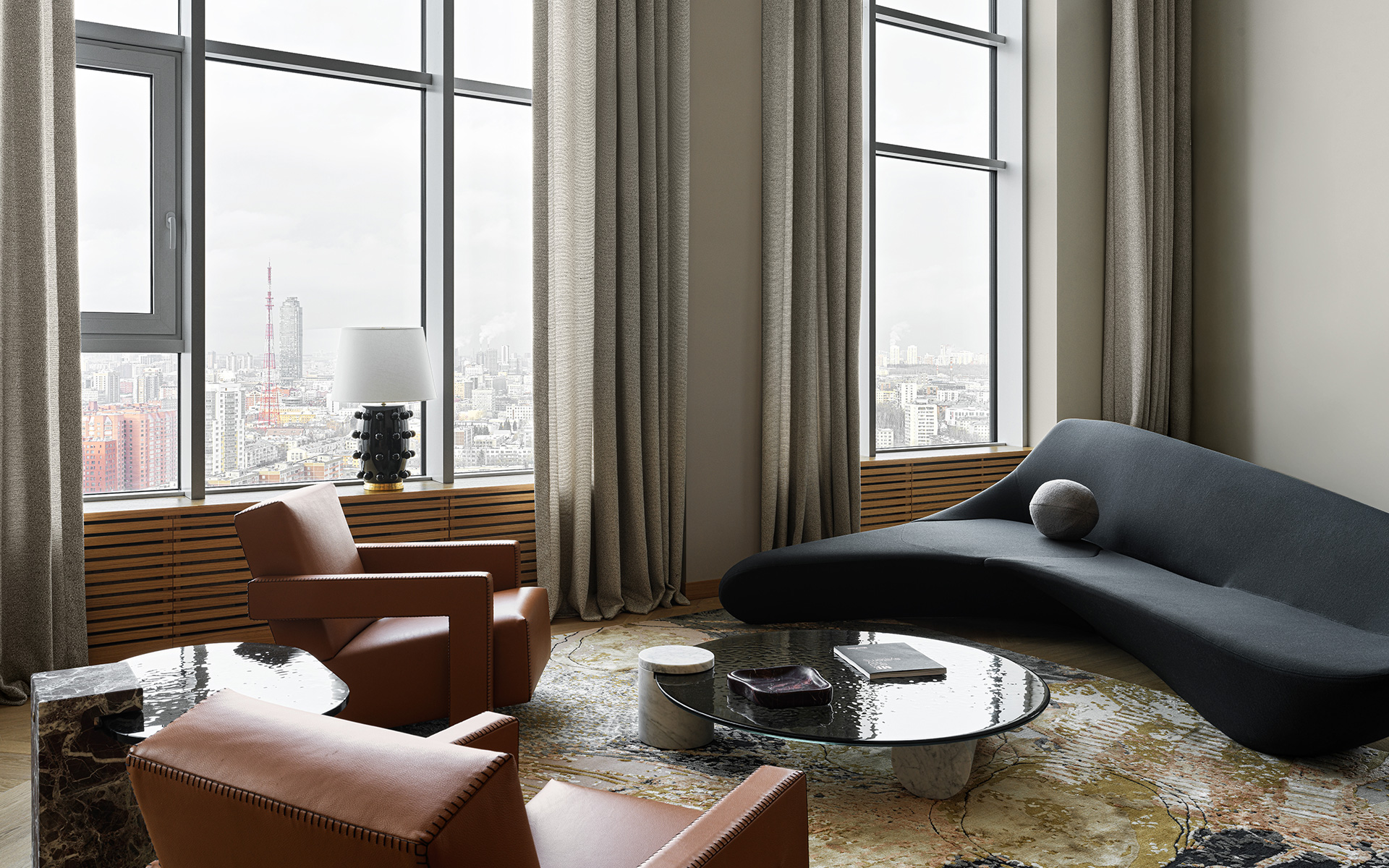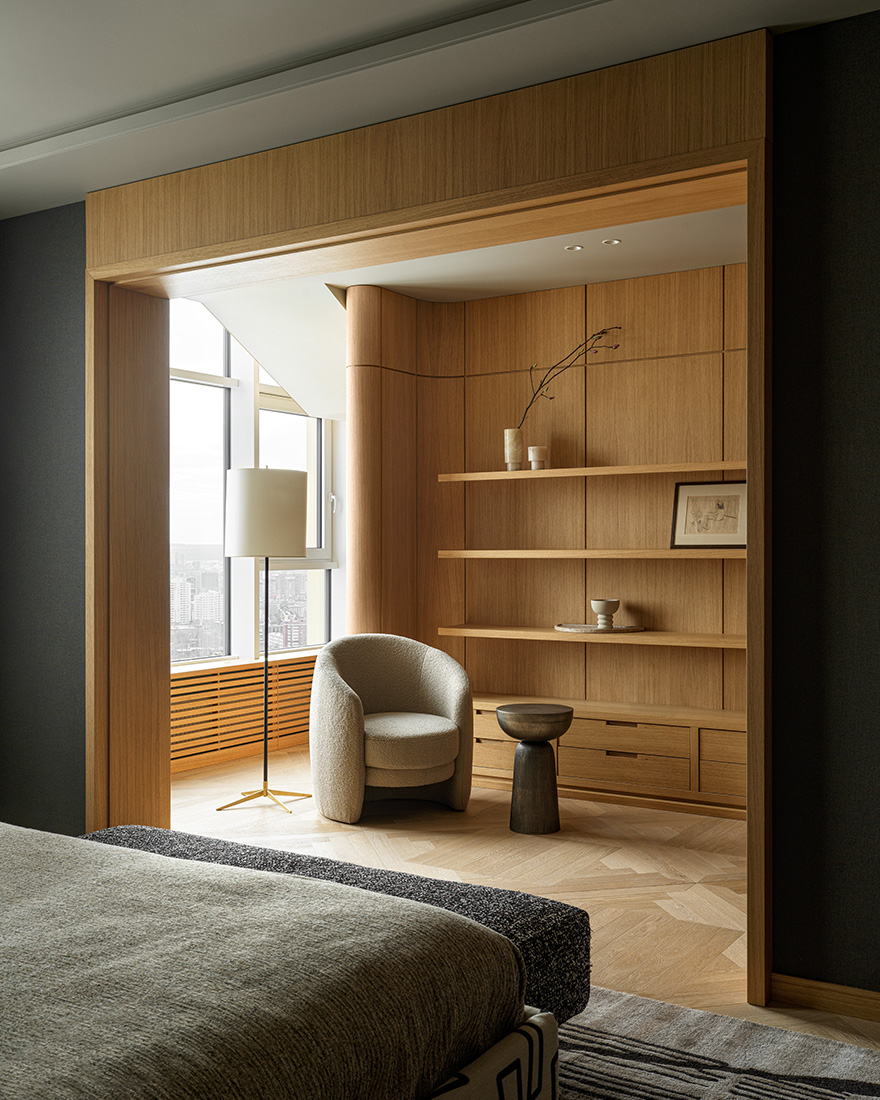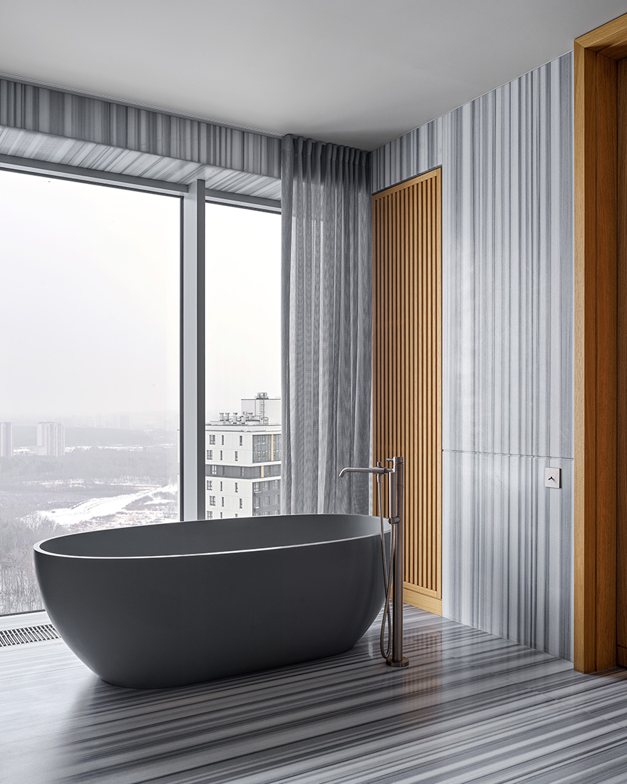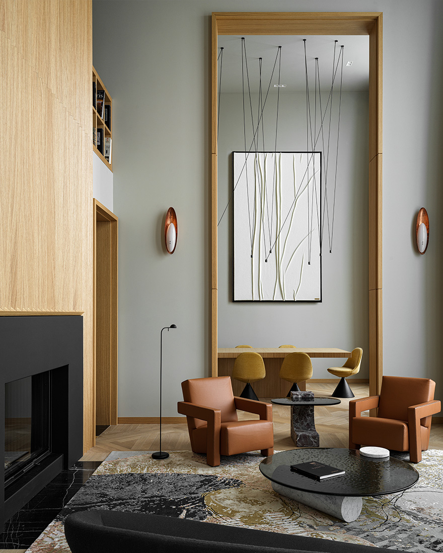 Надо было «подогреть» — так говорит архитектор Анна Кашенцева, CAN-офисоб этом проекте. Квартира площадью 190 квадратных метров на последнем этаже жилого комплекса Клевер Парк радует большими окнами с видом на город и высотой потолков не менее шести метров. «Главная задача — не снизить заданный уровень, диктуемый этим роскошным, впечатляющим по объему пространством», — говорит дизайнер. «Конечно, необходимо было сделать его максимально комфортным и с продуманным местом для хранения вещей».