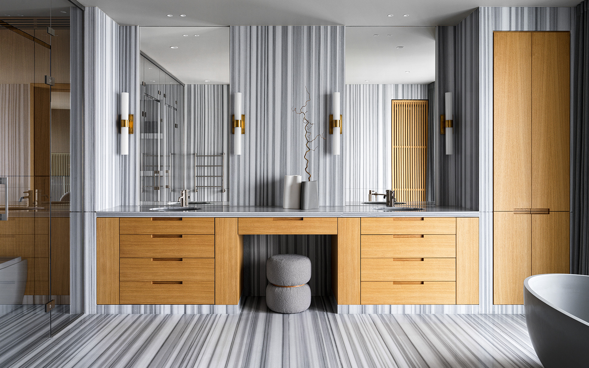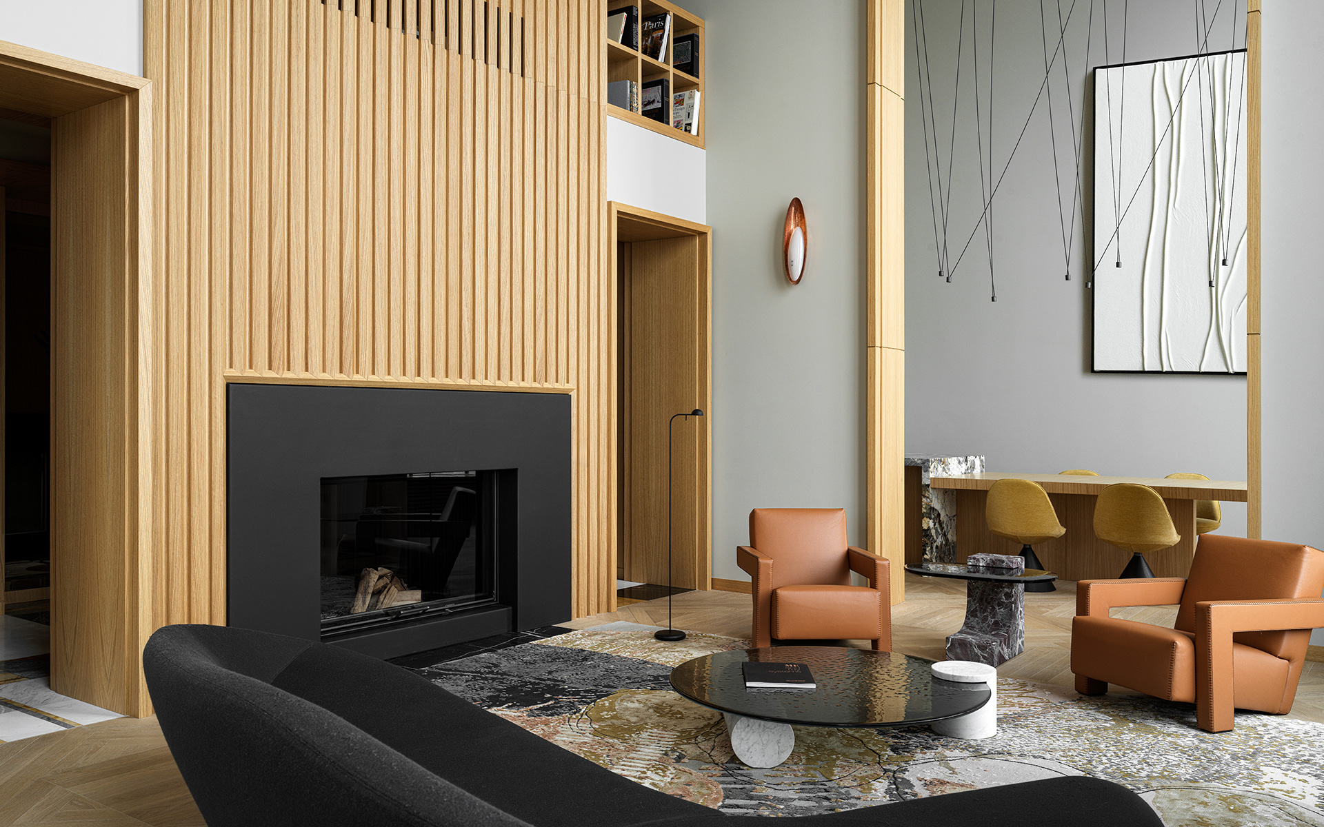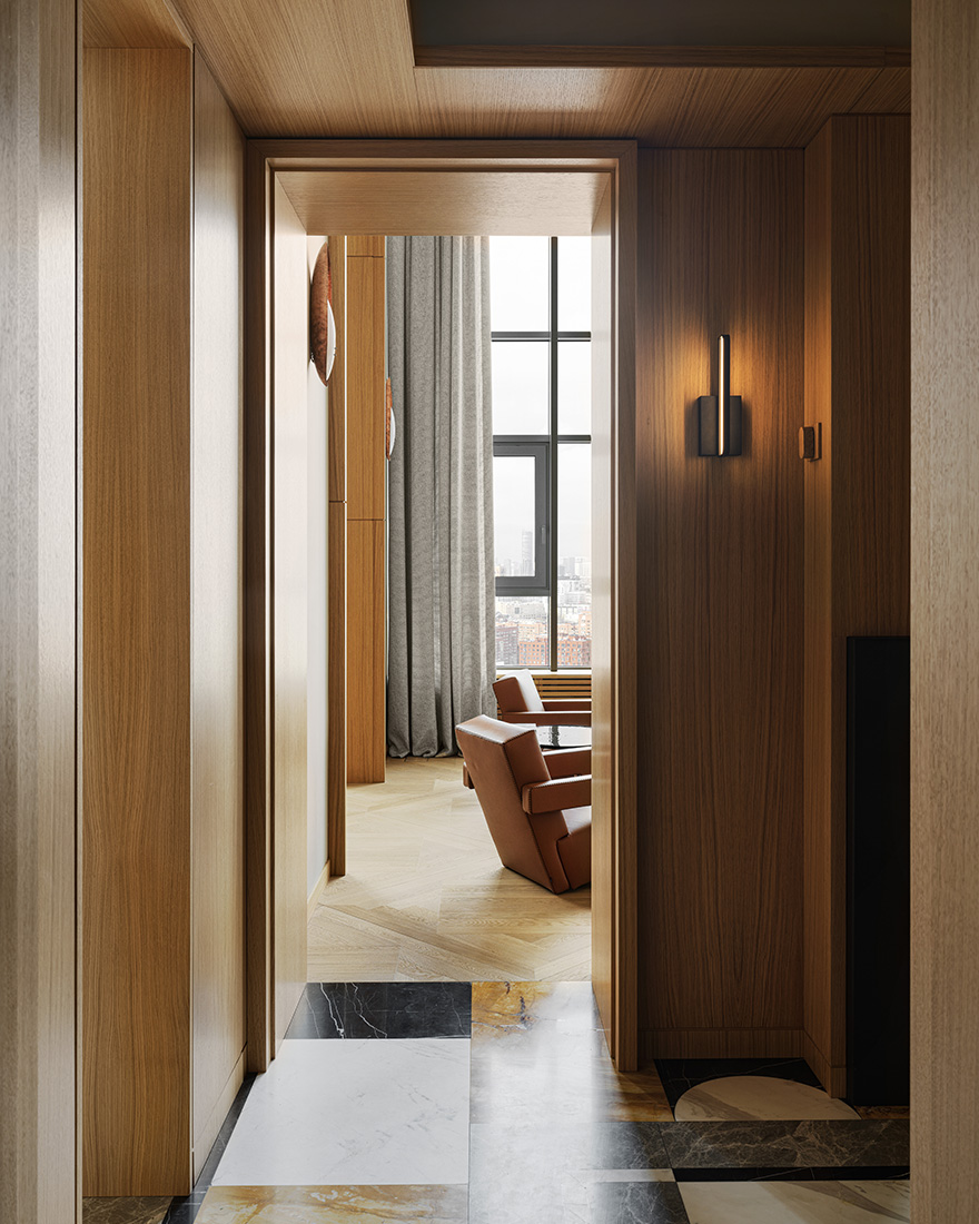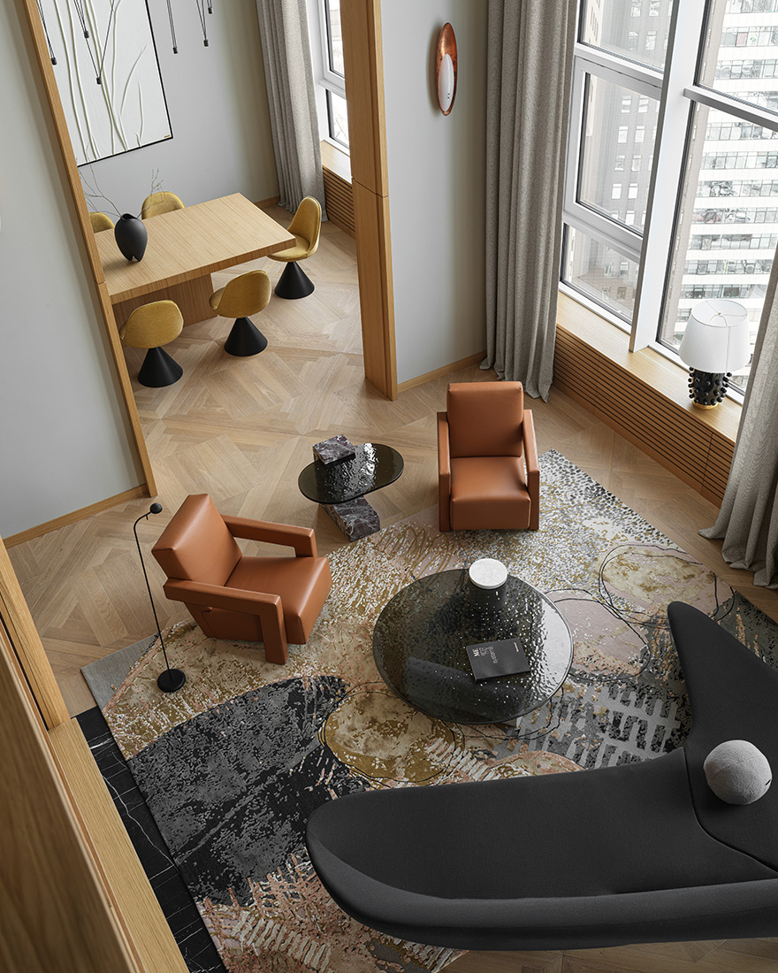 Надо было «подогреть» — так говорит архитектор Анна Кашенцева, CAN-офисоб этом проекте. Квартира площадью 190 квадратных метров на последнем этаже жилого комплекса Клевер Парк радует большими окнами с видом на город и высотой потолков не менее шести метров. «Главная задача — не снизить заданный уровень, диктуемый этим роскошным, впечатляющим по объему пространством», — говорит дизайнер. «Конечно, необходимо было сделать его максимально комфортным и с продуманным местом для хранения вещей».