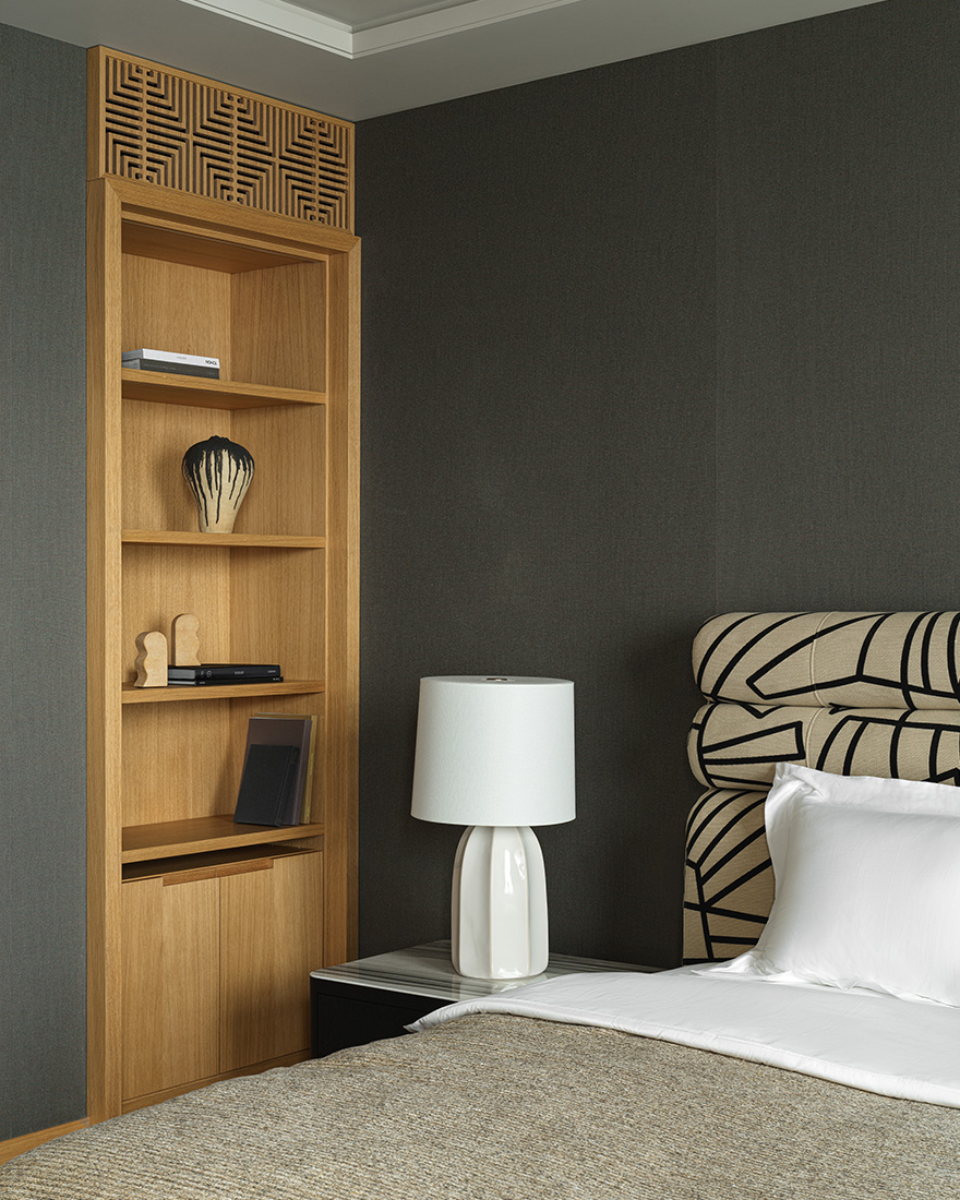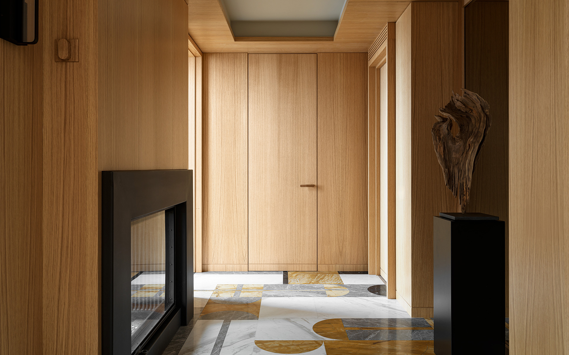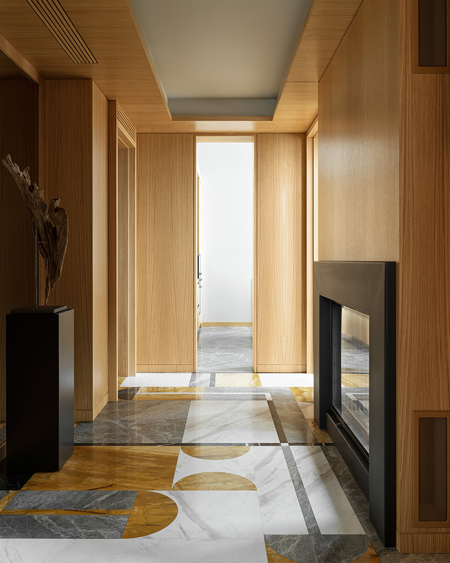 «Цветовую палитру определили деревянные панели, шпонированные дубом, и мраморный пол», — говорит Анна. — Панели всегда придают каждому помещению высокий статус и комфорт. Роскошный пол в коридоре и холле выполнен из разных видов мрамора. Еще я взяла модульный паркет с рисунком, чтобы смягчить и усложнить отделку в современном интерьере. В спальне мы использовали тканевые обои, что добавляет уюта».