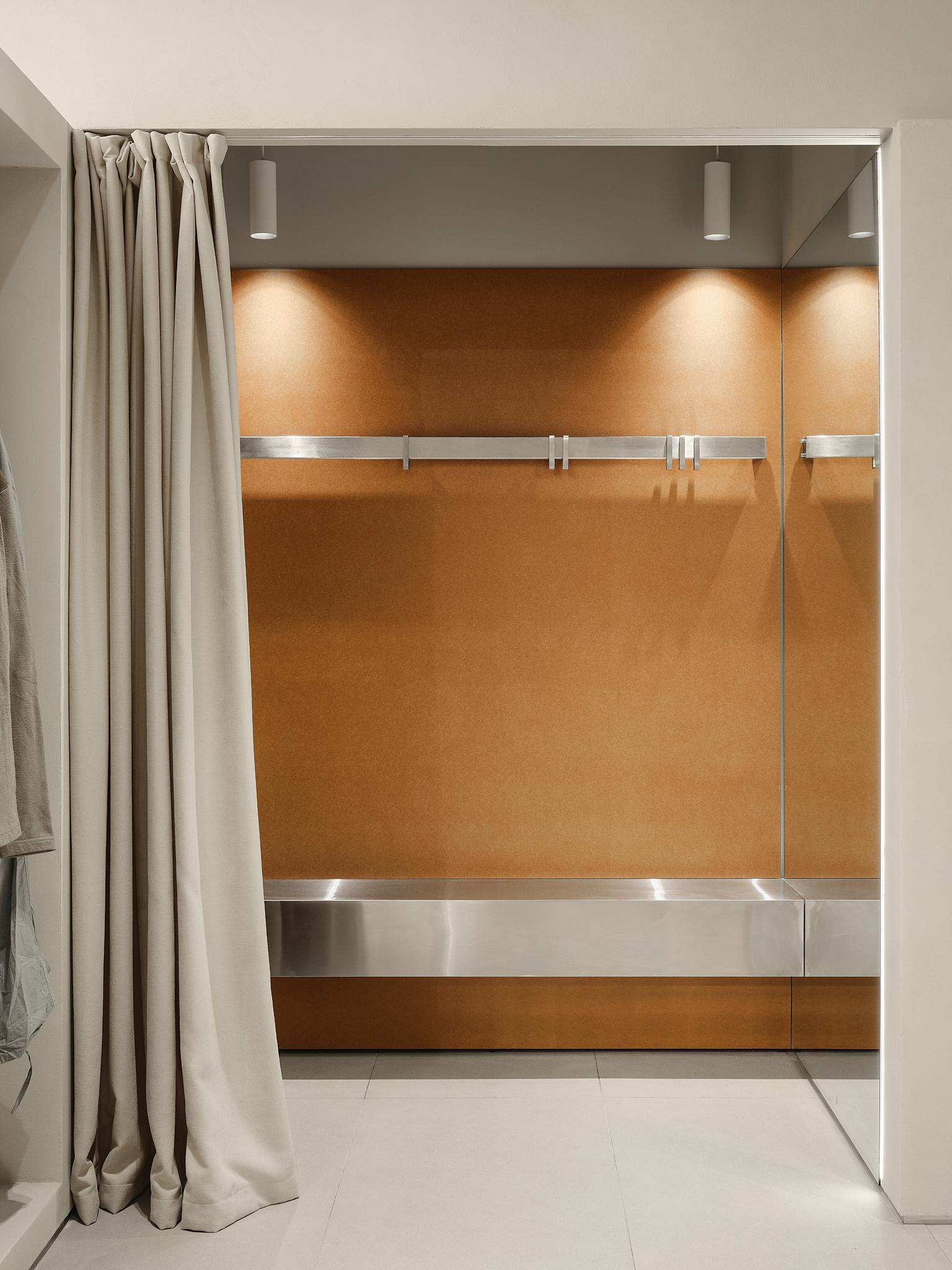 «Вместо того, чтобы бороться с формой помещения, мы использовали его как инструмент. Началом маршрута стал вход — здесь трансформирующаяся стена, меняющая сценарий движения и восприятие магазина. Далее пространство разворачивается на череду углов и функциональных зон, а в его глубине посетителя встречает обувной отдел с удобным островом в центре. Примерочные размещены слева от складского блока — в результате получились просторные и удобные кабины, выполняющие роль отдельных «карман» внутри общего потока».