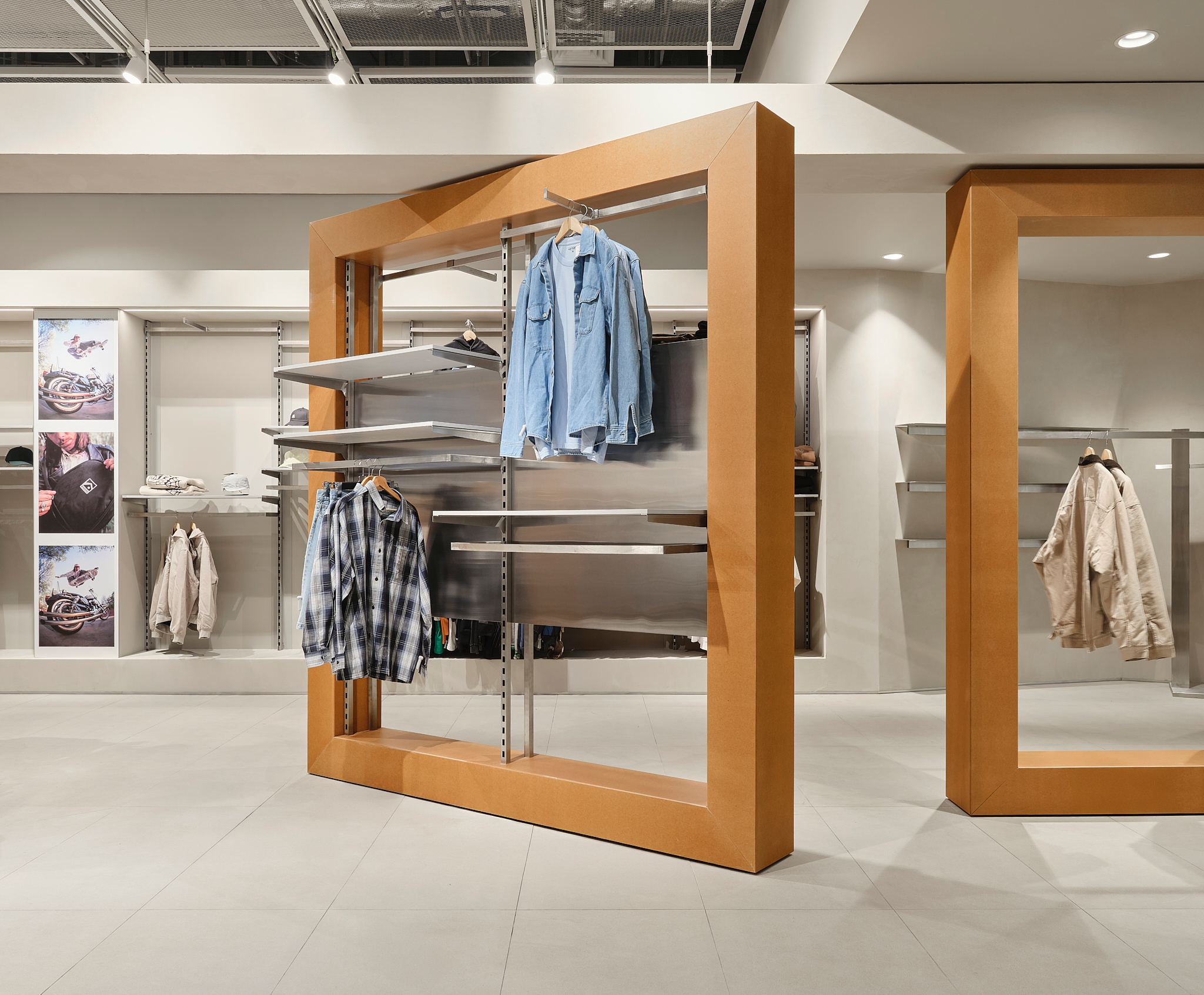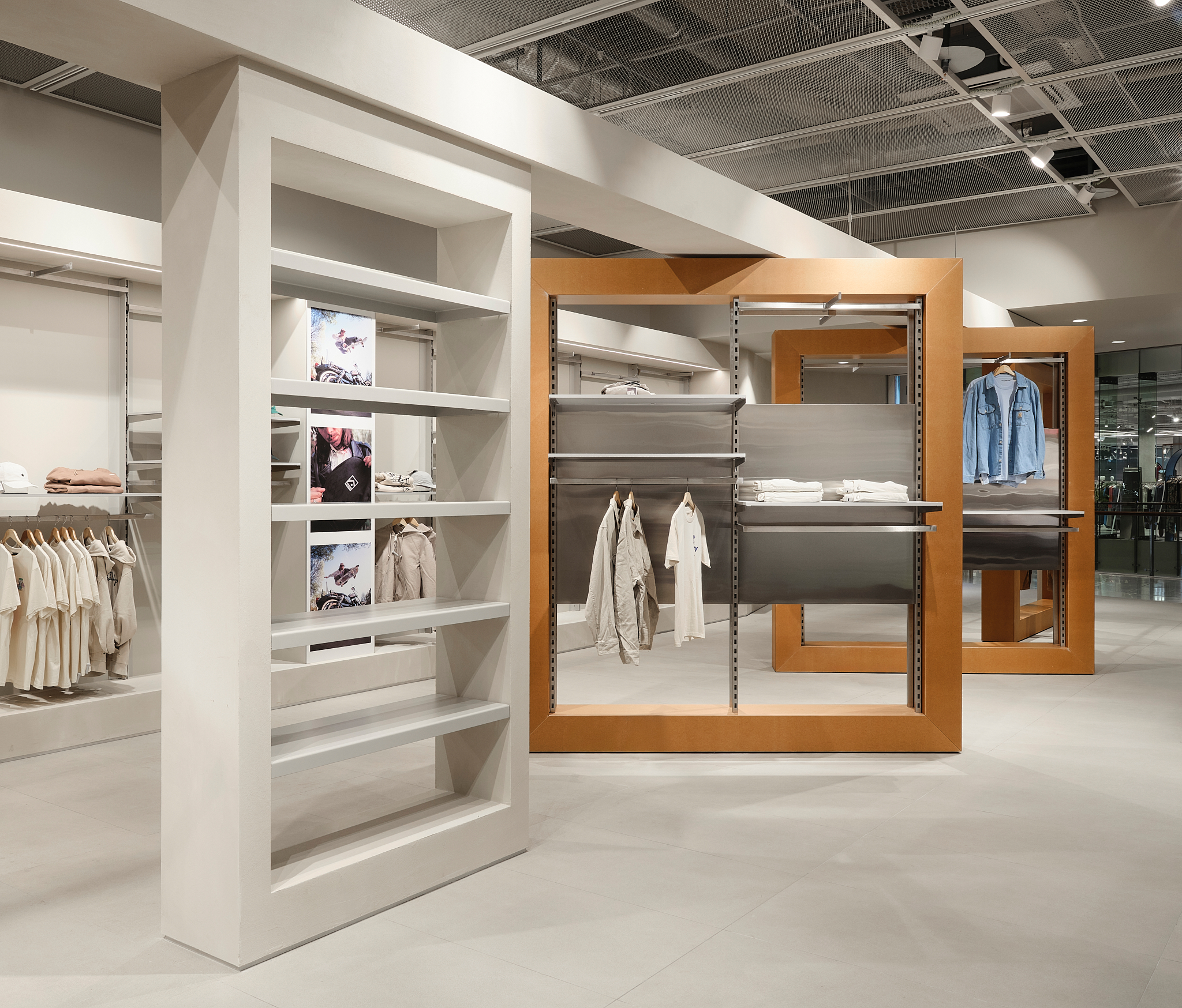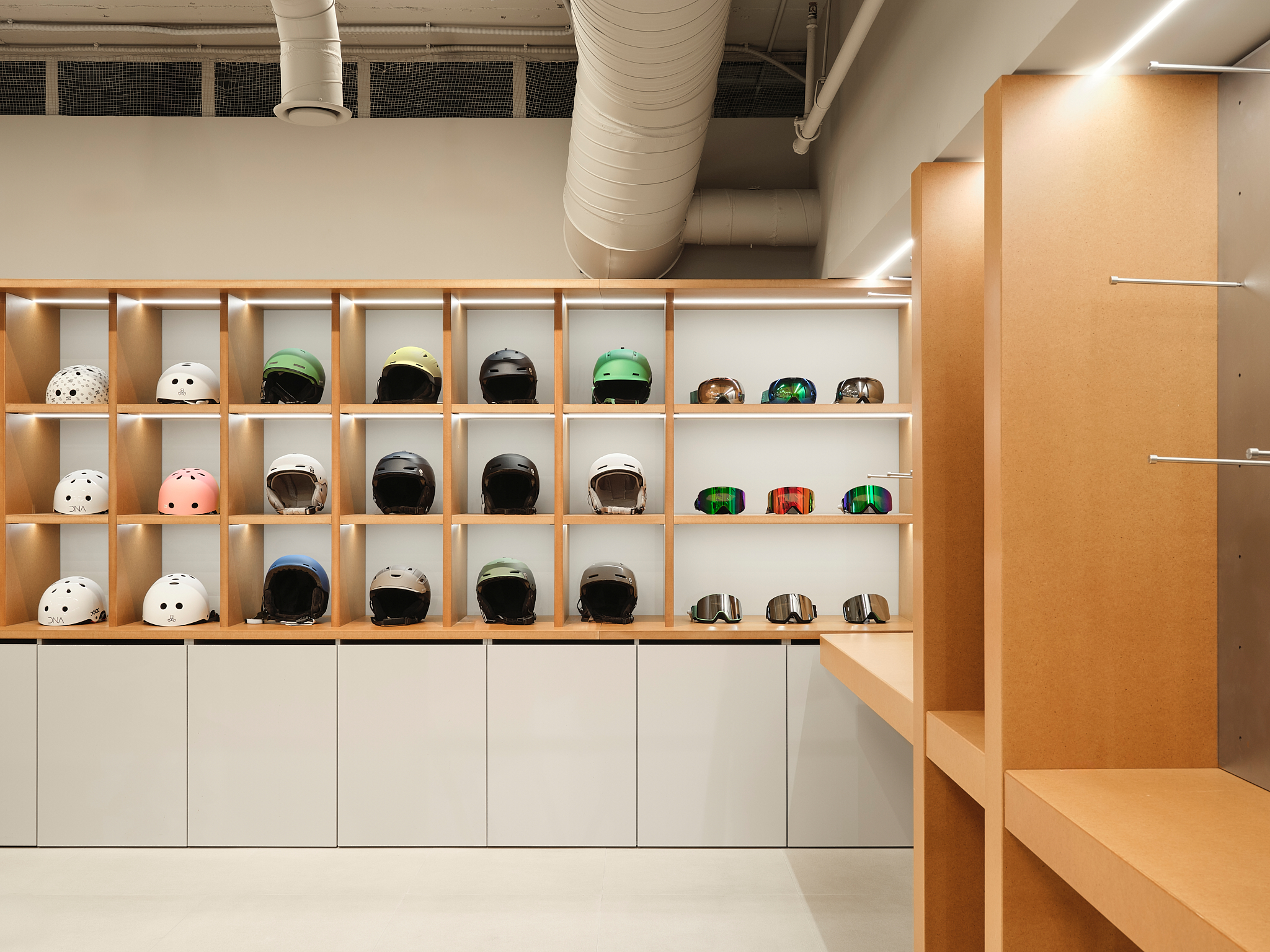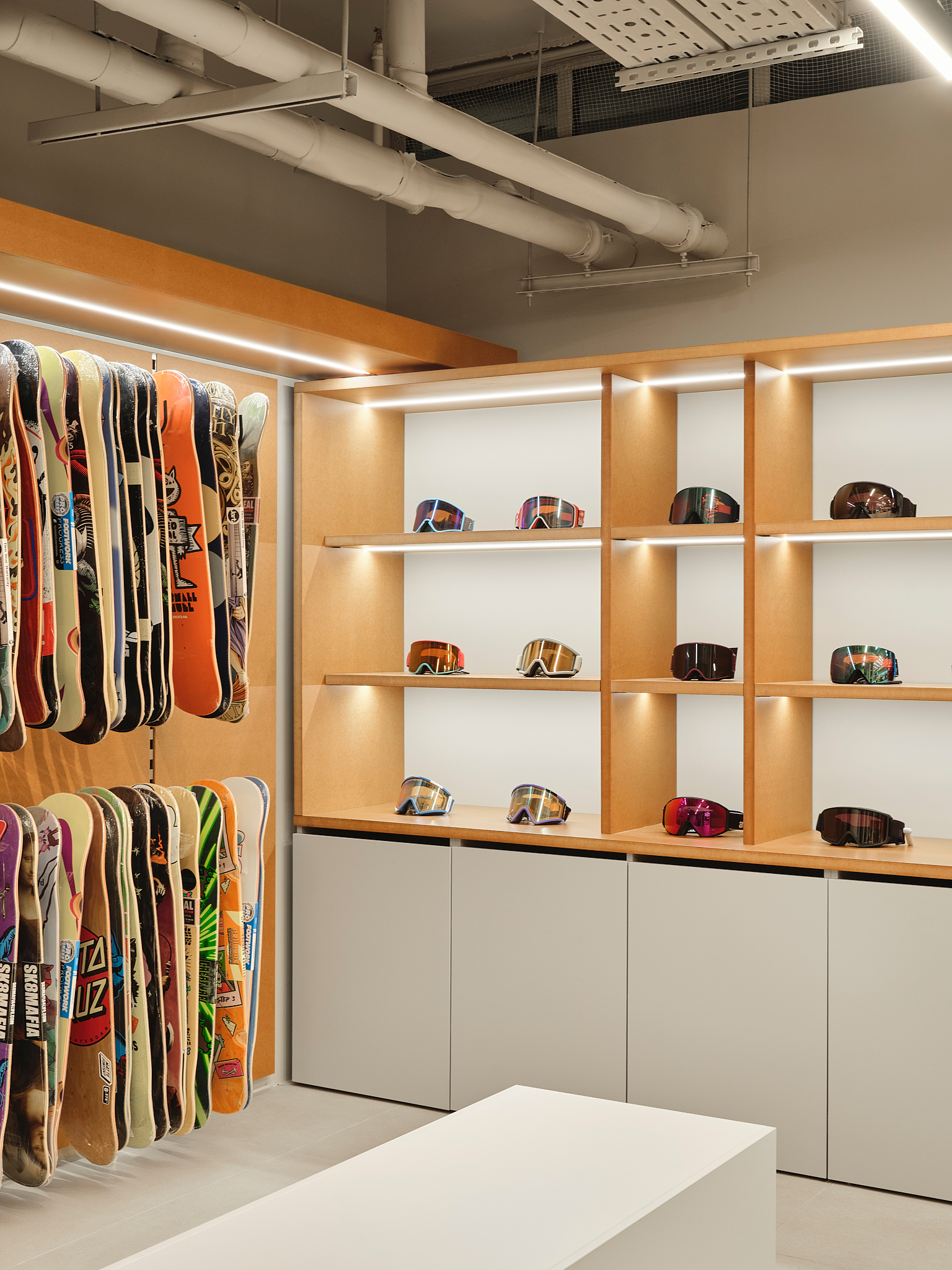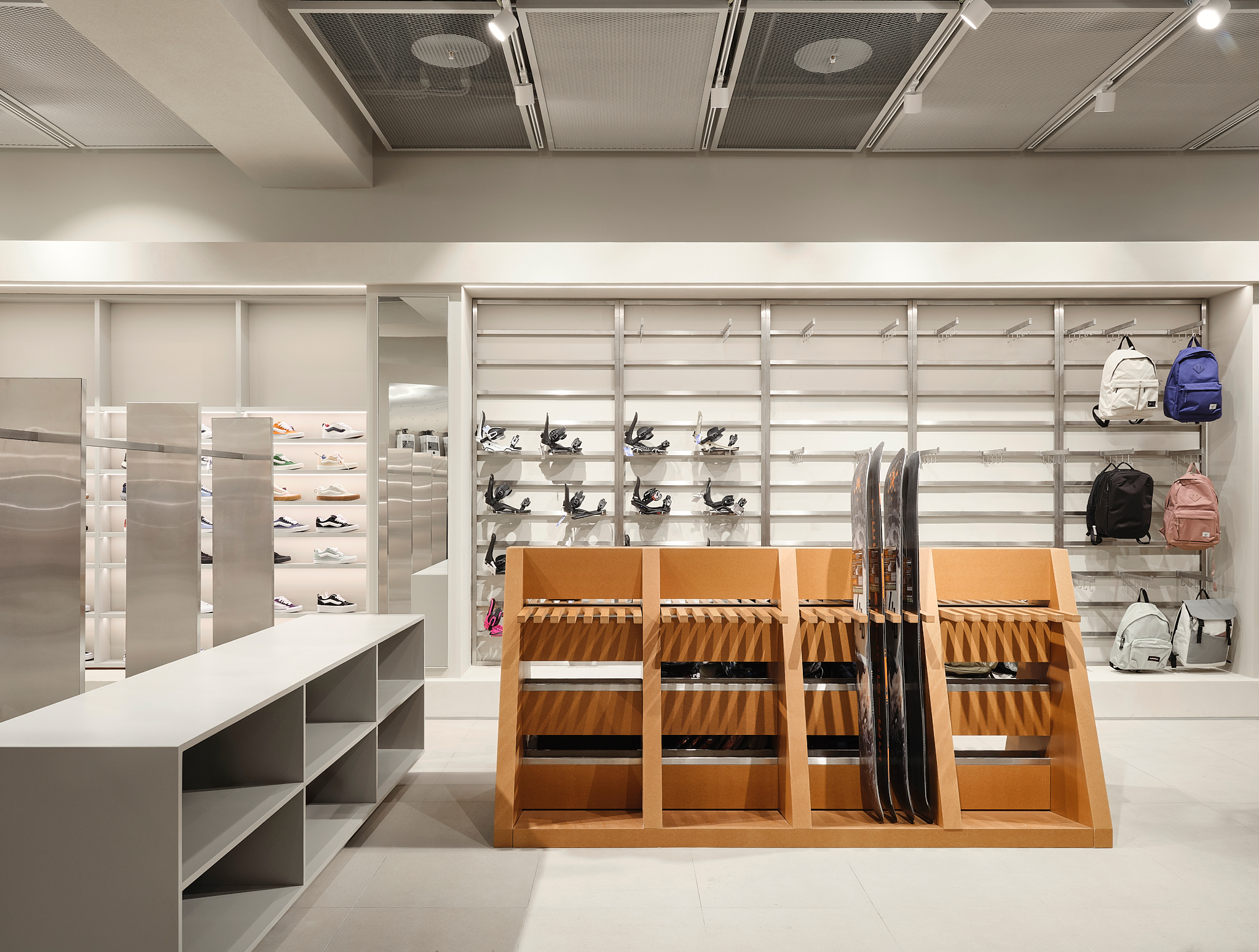 «Важным материалом проекта является Valchrom, окрашенный в массе МДФ, который используется для кассовых аппаратов и столов. Фрезерование его позволяет получить рельефные «ребристые» поверхности без дополнительных накладных элементов – это и ощутимо, и экономично в производстве. В сфере обуви изначально планировались цельностальные системы, но решение было упрощено до хорошо организованных полок, которые работают благодаря точным пропорциям и ритму. Для демонстрации досок для серфинга команда опиралась на опыт работы с Стадионный магазин — некоторые неиспользованные тогда идеи были преобразованы в новые конструкции. Потолок в окончательном варианте покрыт легкой сеткой: изначально его хотели оставить полностью открытым, но сетчатая конструкция сделала пространство аккуратнее и упорядоченнее, не скрывая при этом индустриальную логику торгового центра».