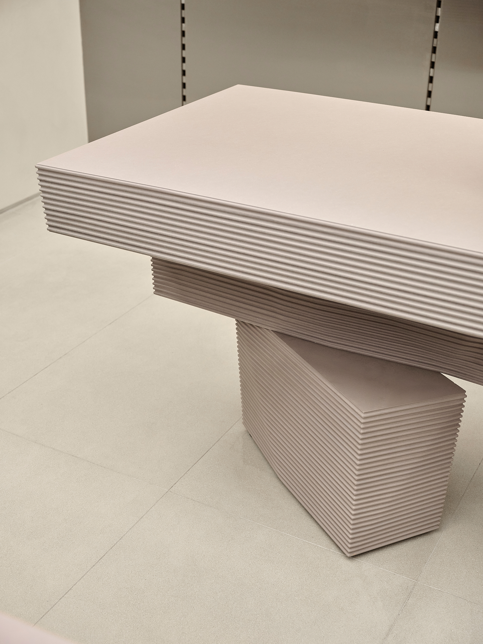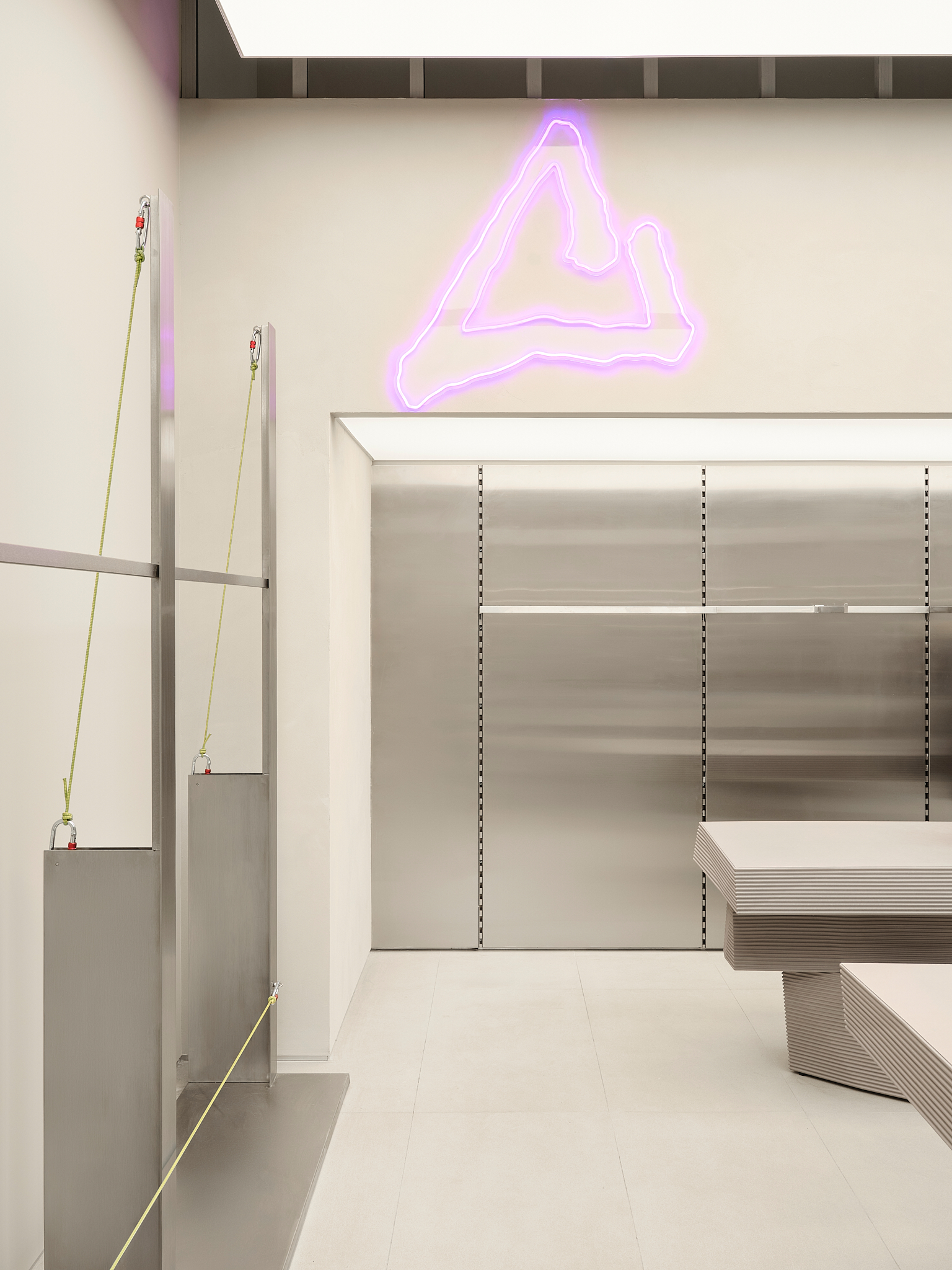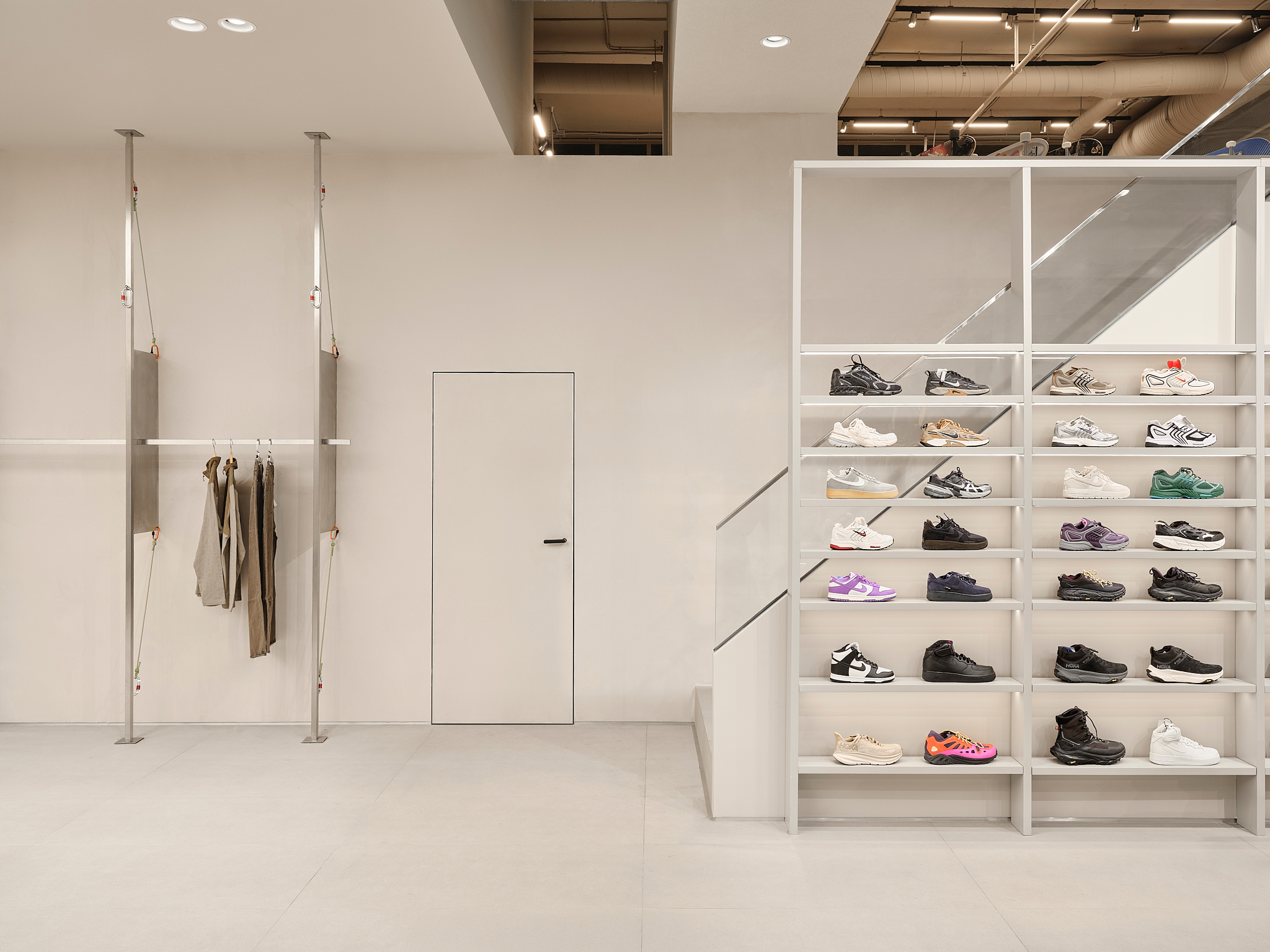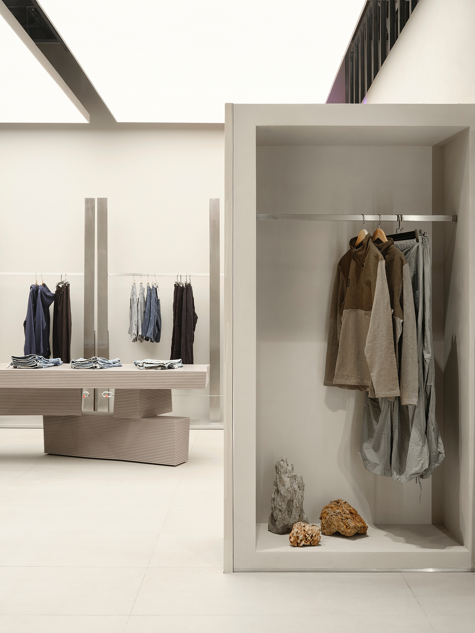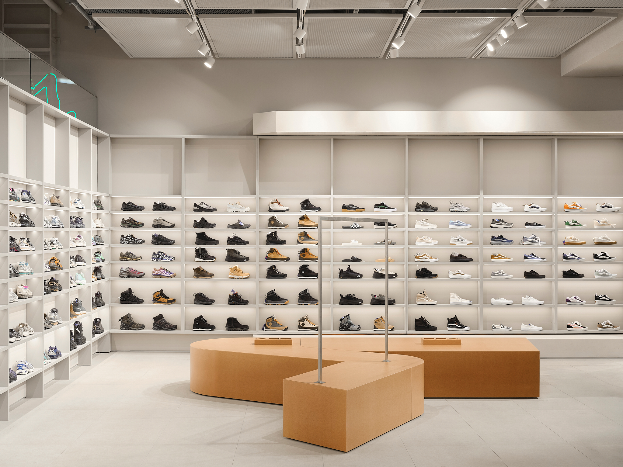 «Важным материалом проекта является Valchrom, окрашенный в массе МДФ, который используется для кассовых аппаратов и столов. Фрезерование его позволяет получить рельефные «ребристые» поверхности без дополнительных накладных элементов – это и ощутимо, и экономично в производстве. В сфере обуви изначально планировались цельностальные системы, но решение было упрощено до хорошо организованных полок, которые работают благодаря точным пропорциям и ритму. Для демонстрации досок для серфинга команда опиралась на опыт работы с Стадионный магазин — некоторые неиспользованные тогда идеи были преобразованы в новые конструкции. Потолок в окончательном варианте покрыт легкой сеткой: изначально его хотели оставить полностью открытым, но сетчатая конструкция сделала пространство аккуратнее и упорядоченнее, не скрывая при этом индустриальную логику торгового центра».