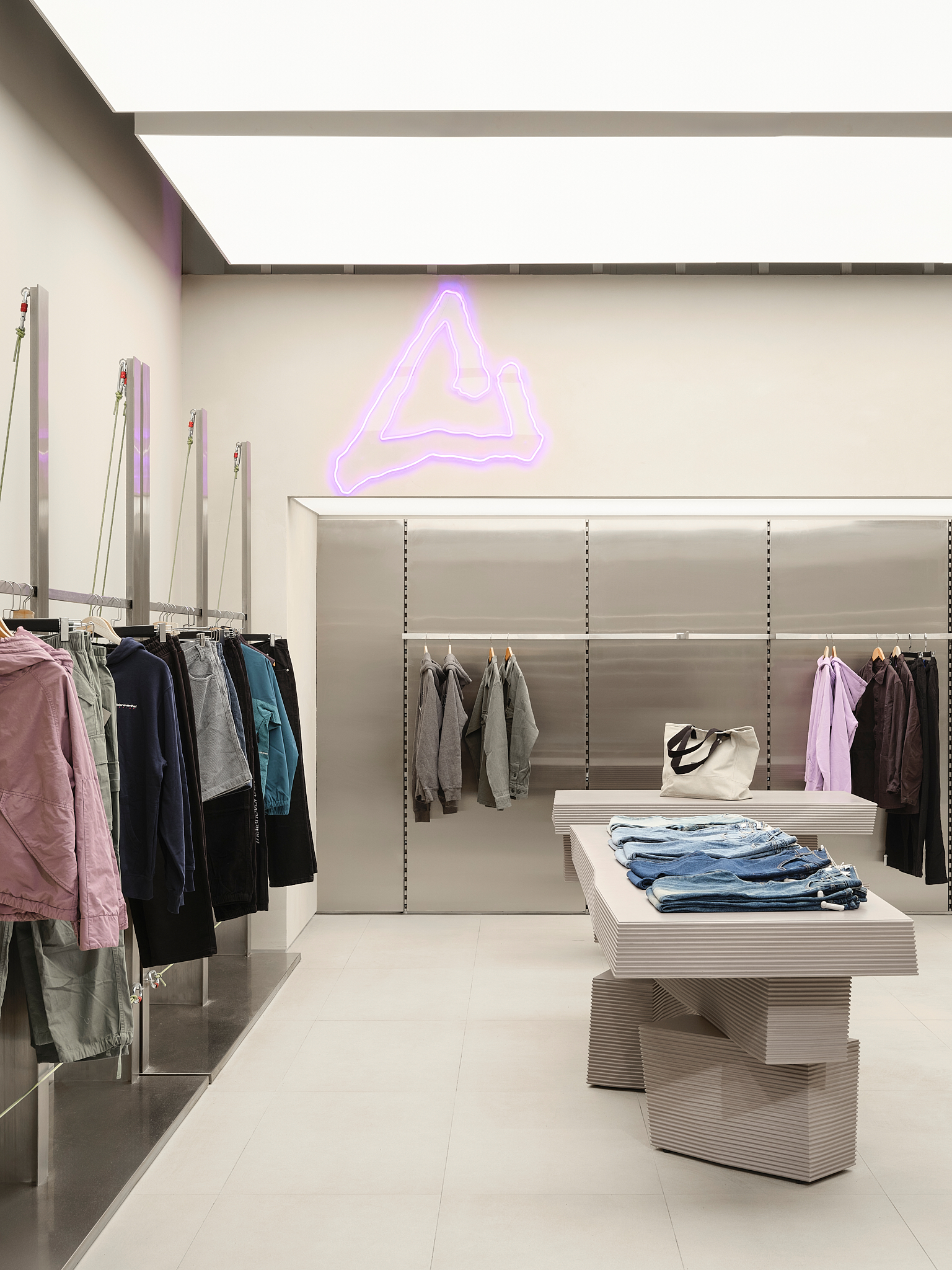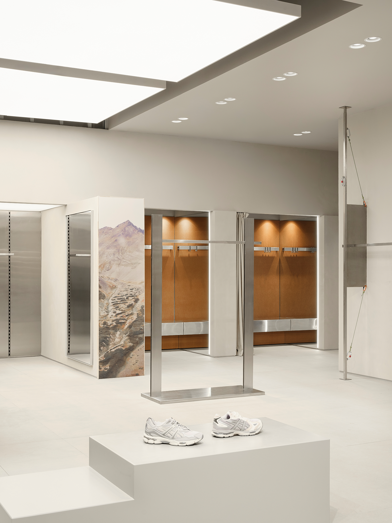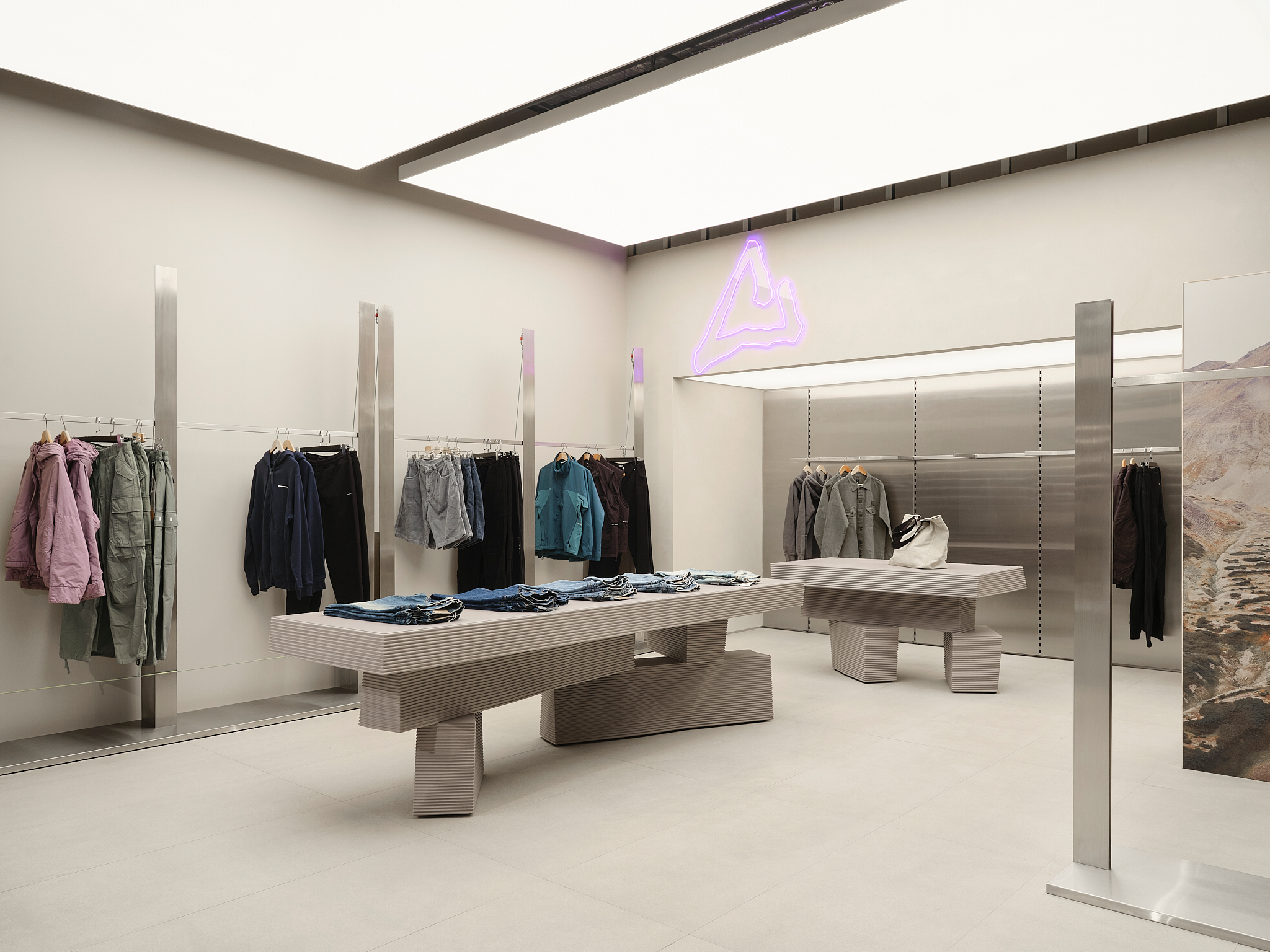 «Основной задачей проекта было большое количество товара, который важно показать, не нарушая целостности пространства. Мы исходили из того, что плотность планировки изменить нельзя, но можно изменить визуальный порядок и ритм. Таким образом, появился прием с «лабиринтом», который покупатель словно собирает сам, проходя через разные зоны, и стеной-трансформером, которая создает игру глубины и углов. Важным акцентом стал Пиковый угол для примерочных – это схема освещения и оборудование магазина. Здесь изменилось: большие световые короба создают ощущение «магазина в магазине», а не просто отдельный раздел — рельсы с карабинами и стропами, тяжелые на вид столы, напоминающие монолитную скалу или объект, напечатанный на 3D-принтере, — создают образ технологичного, но ироничного пространства.