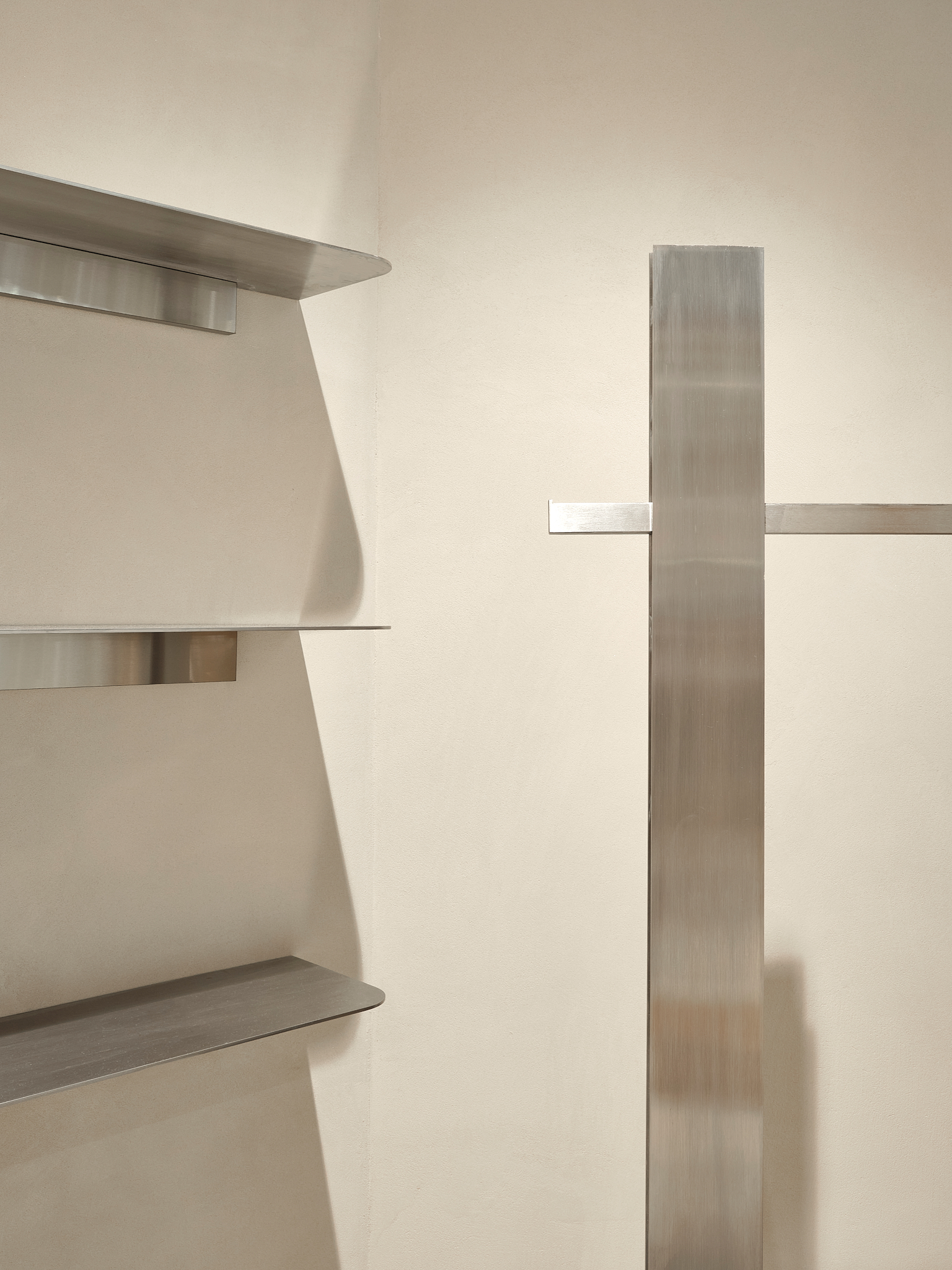 «Визуальная логика интерьера основана на сочетании трех основных компонентов: оттенка штукатурки, теплого света и неокрашенного МДФ. На этом нейтральном фоне нержавеющая сталь играет роль солиста: она расставляет акценты, собирает четкий ритм и «доводит» пространство до уровня флагмана. Один из удачных приемов — сочетание оттенков фарфора и стен: это визуально «успокаивает» пол и позволяет не разделять пространство. Опрос среди конкурентов показал, что для магазинов, предназначенных для У подобной аудитории уже сформирован набор устойчивых приемов: холодный свет, агрессивный контраст, обилие нержавеющей стали и световых коробов. В новом флагмане мягкий, дружелюбный свет работает на создание ощущения принятия, а не визуального напряжения, подчеркивая при этом объемно-пространственные решения.