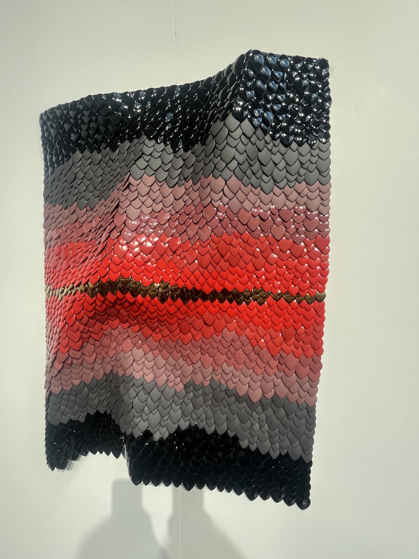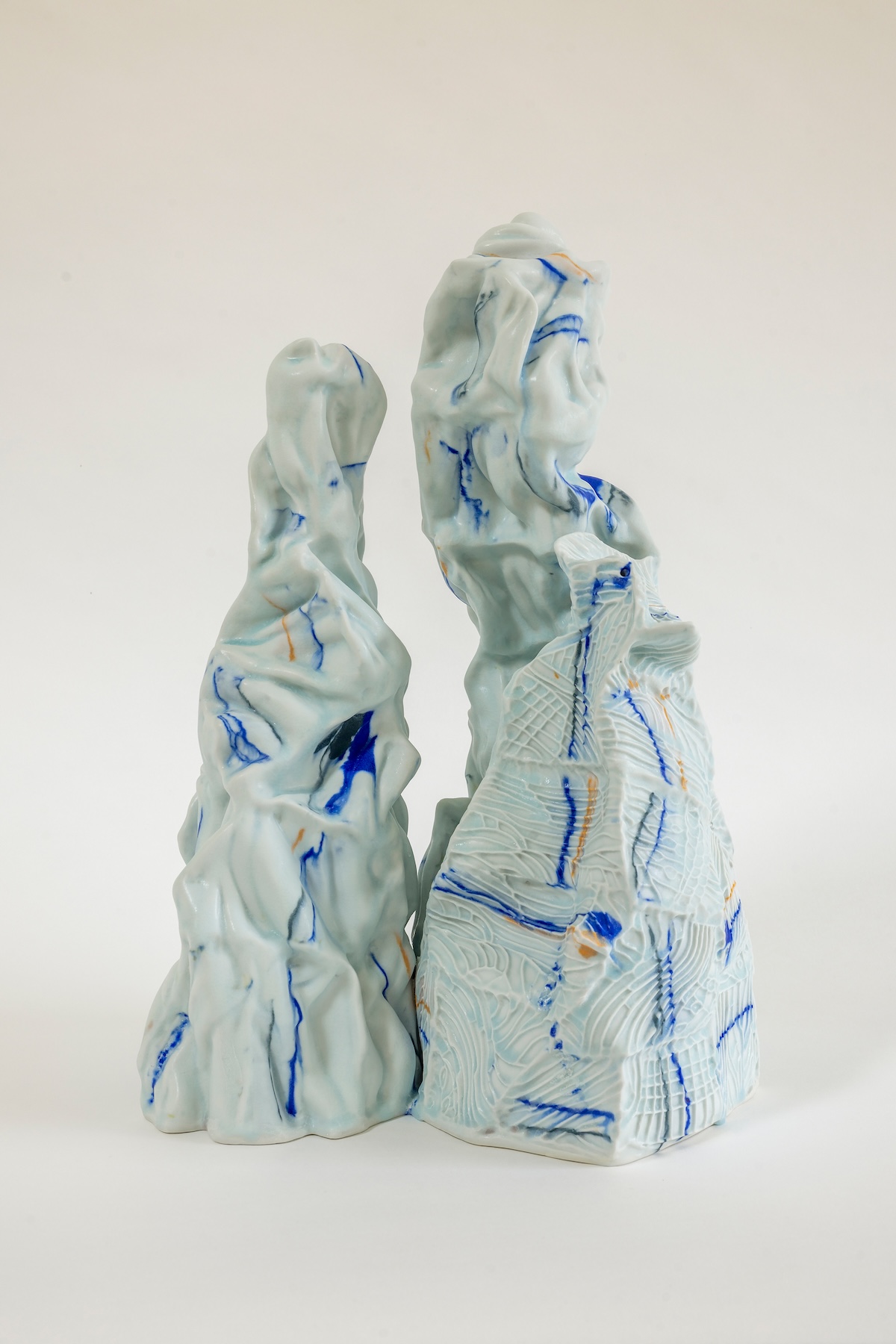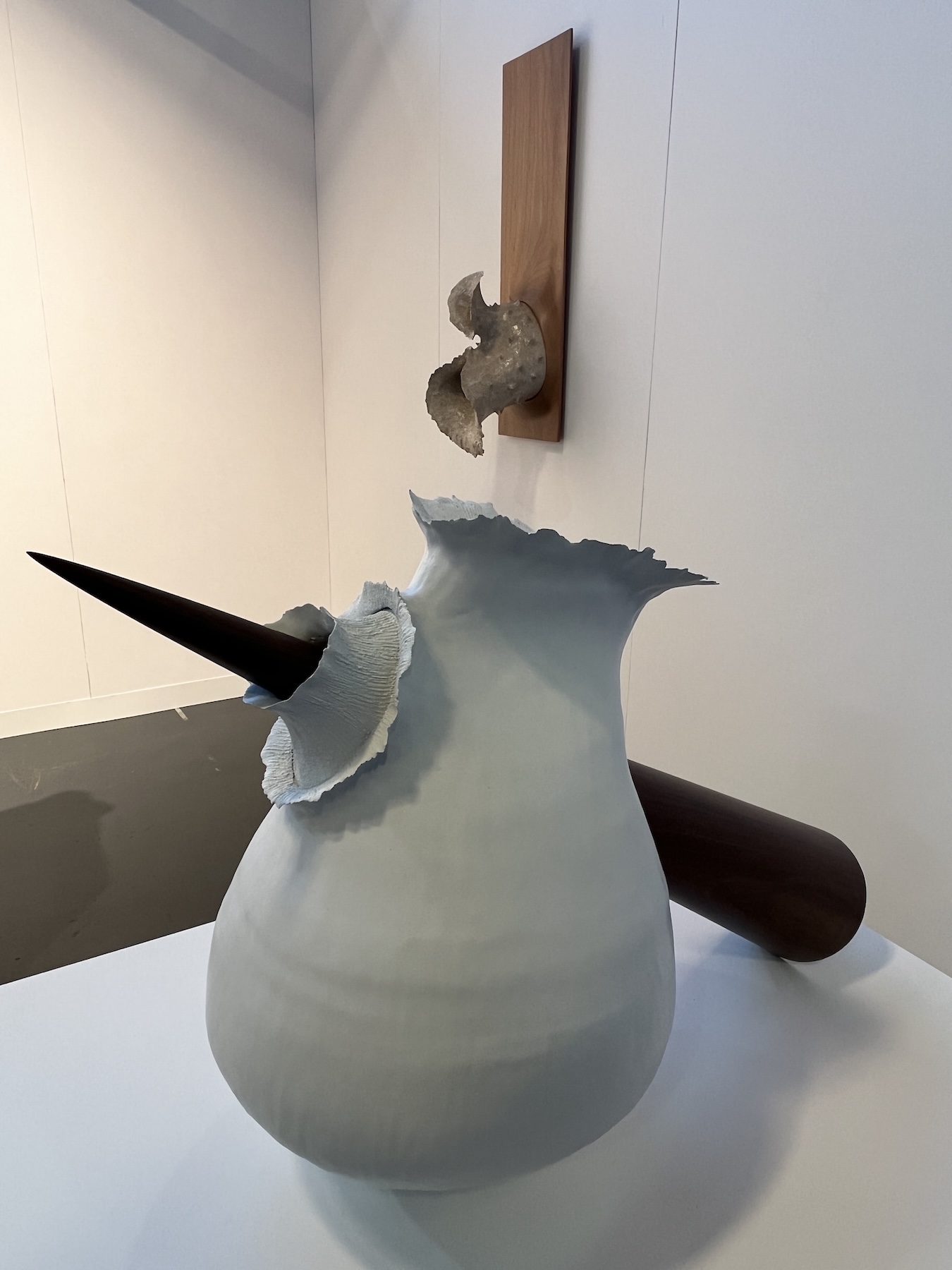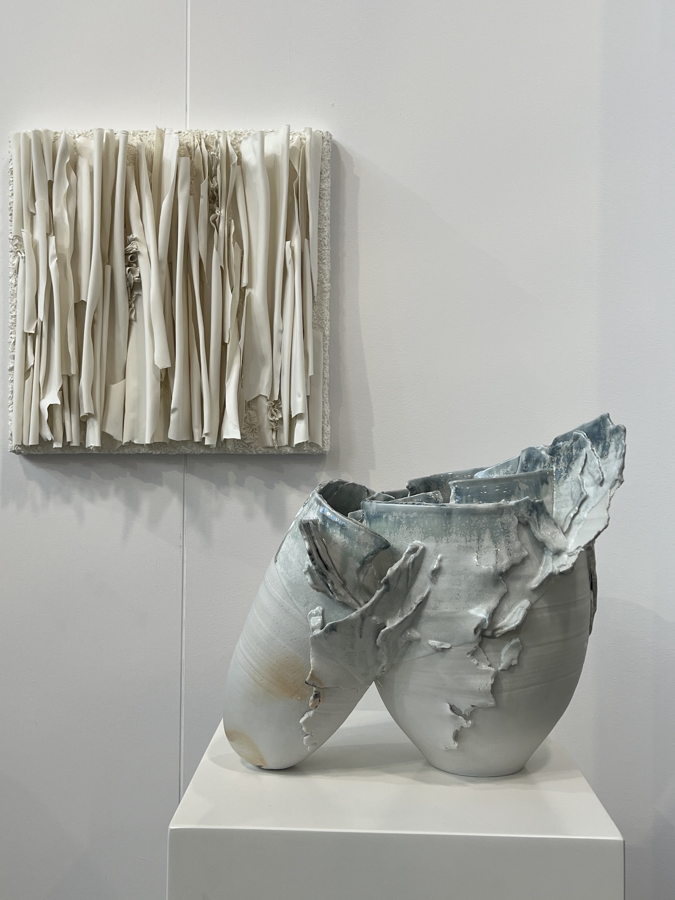 Что касается цен, то эти цифры, похоже, также немного выросли по сравнению с прошлым годом: от доступных для начинающих коллекционеров до значительных инвестиций в крупные скульптурные объекты. Средний ценовой диапазон составлял примерно от 1000 евро до 50 000. Галерея Skog Art Space предложила за 1000 евро небольшие скульптуры Даниэлы Бергшнайдер, которые выглядят как элементы живой формы, состоящие из тонких, похожих на кости структур, скрепленных полупрозрачной тканью. Вьющиеся фарфоровые ленты, похожие на мазки пера японского каллиграфа, покрытые нежно-голубой глазурью (сэйхакудзи) производства Кино Сатоши, стоят от 2500 до 12 000 евро, в зависимости от размера. Работы его соотечественника Юкии Идзумита, чем-то напоминающие аммониты и демонстрирующие красивейшие ребристые композиции из керамических слоев, были предложены французской галереей Hioco за суммы от 2000 до 10 000 евро.