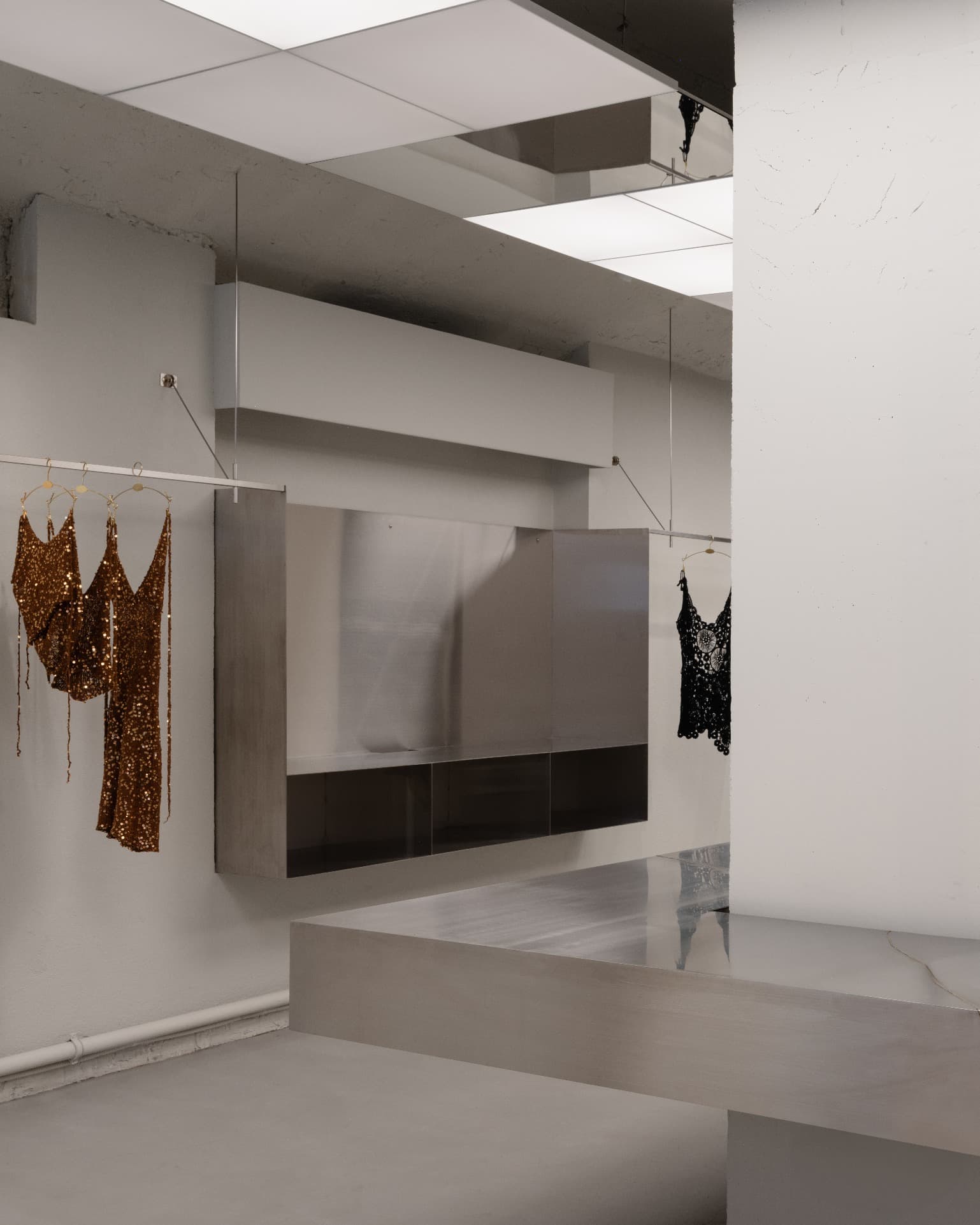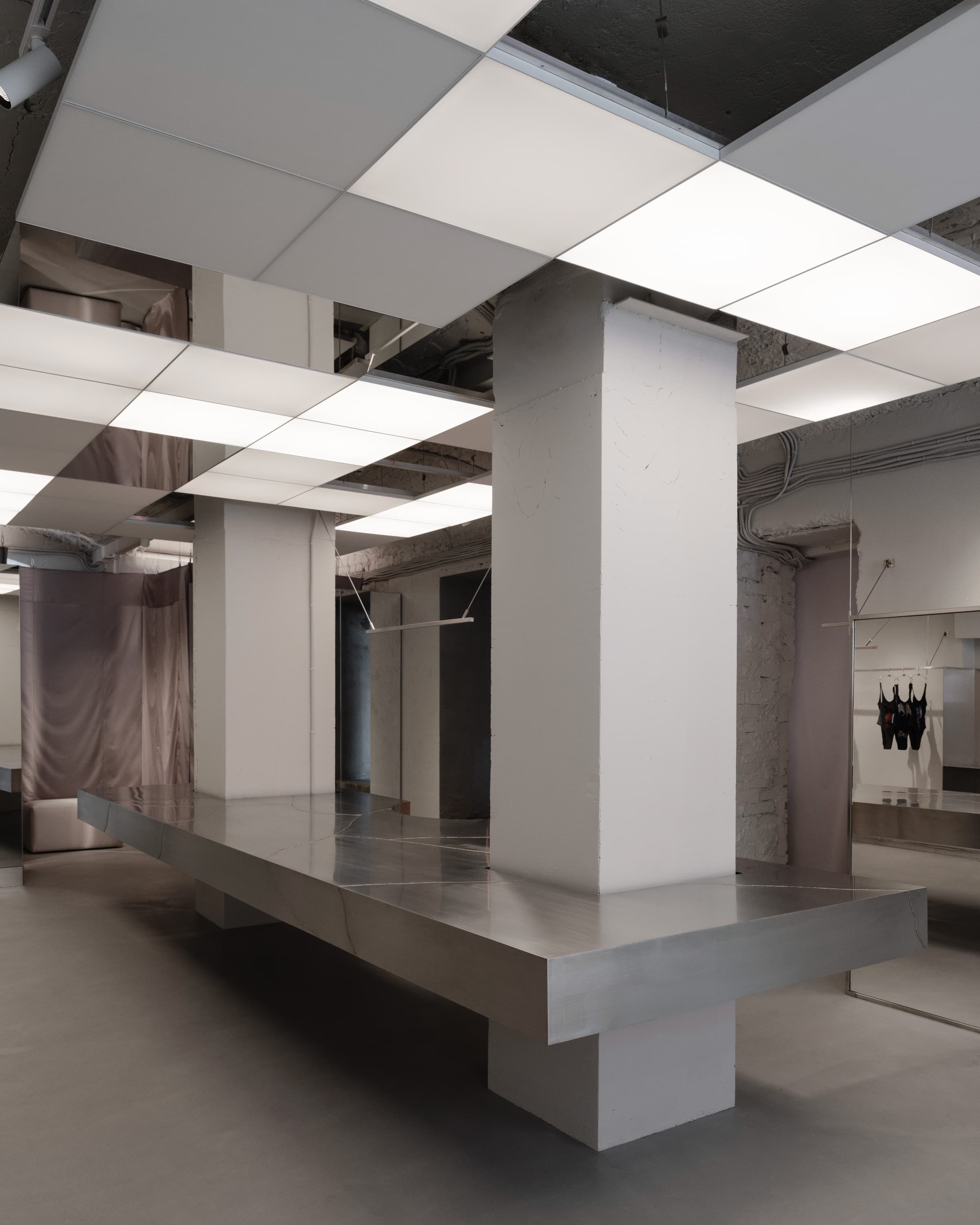 Дизайнерская Полина Черньяк, разработанная в полу -базировании московского бутика в бутик -бутик -бутике, купальника купальника. После тщательного сохранения подлинных деталей — арки, кирпичная кладка и штукатурка, он создал лаконичный современный интерьер на своей основе, который служит нейтральным, но выразительным фоном для ярких и структурированных продуктов бренда.