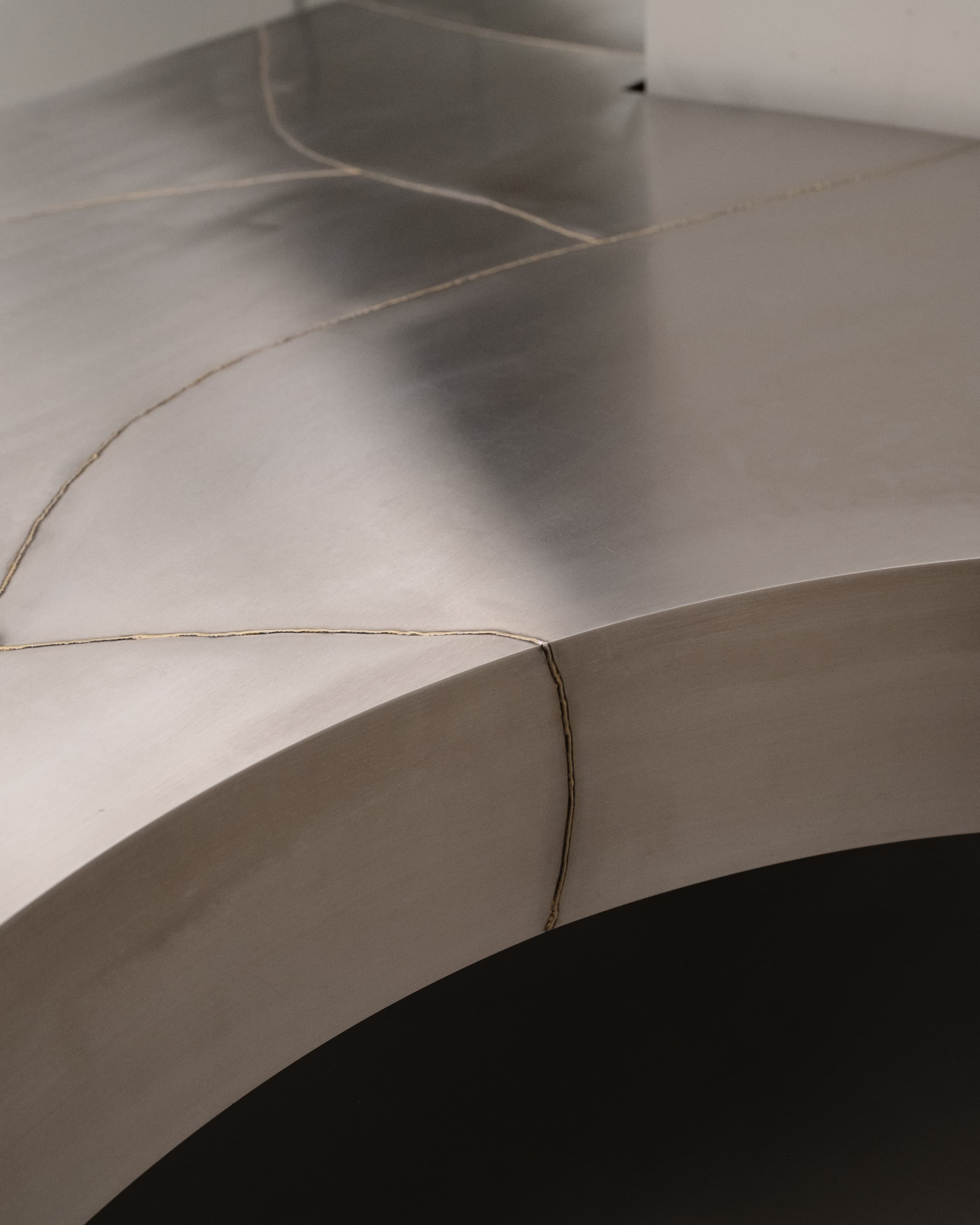 «Все объекты в интерьере сделаны в соответствии с отдельными эскизами. Наиболее замечательными элементами являются восходящий стол из нержавеющей стали с золотыми сварными швами в зоне покупок и потолок« пиксель »с зеркальными вставками.