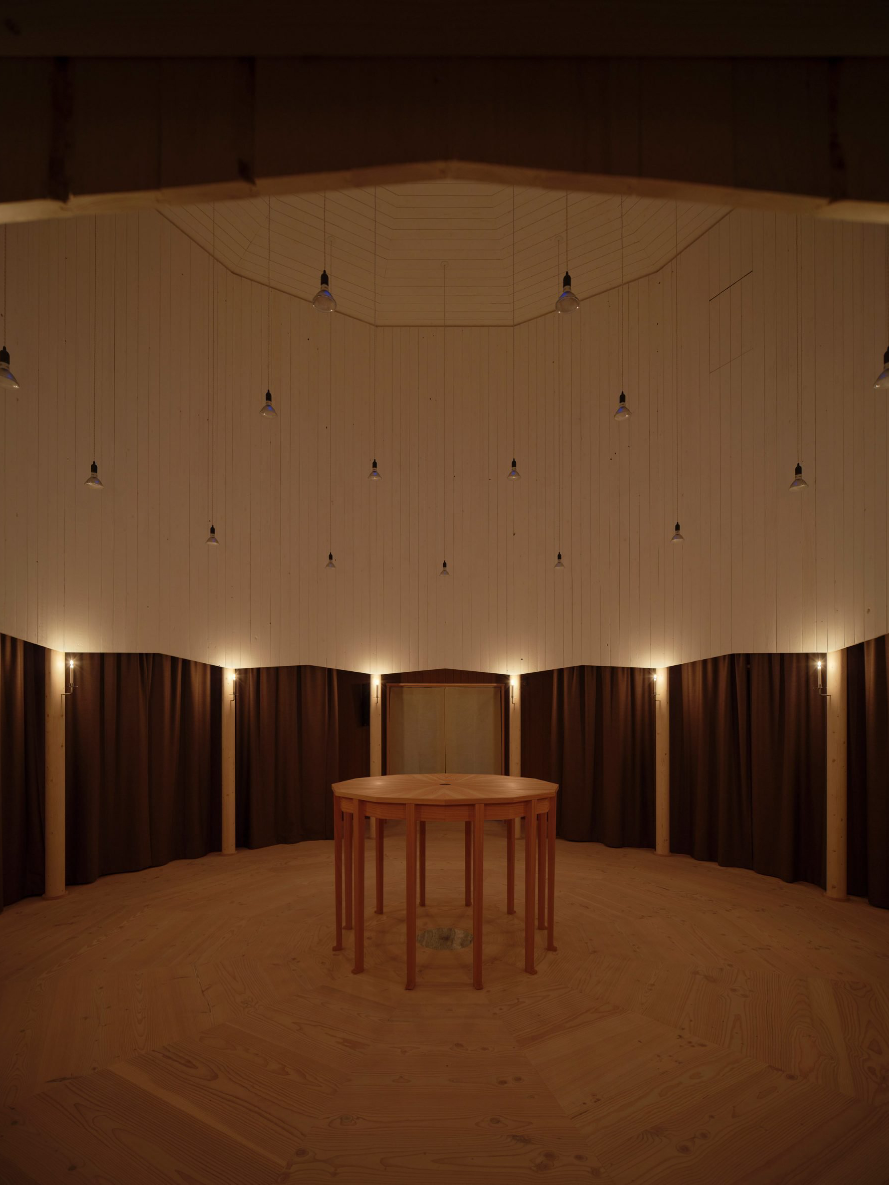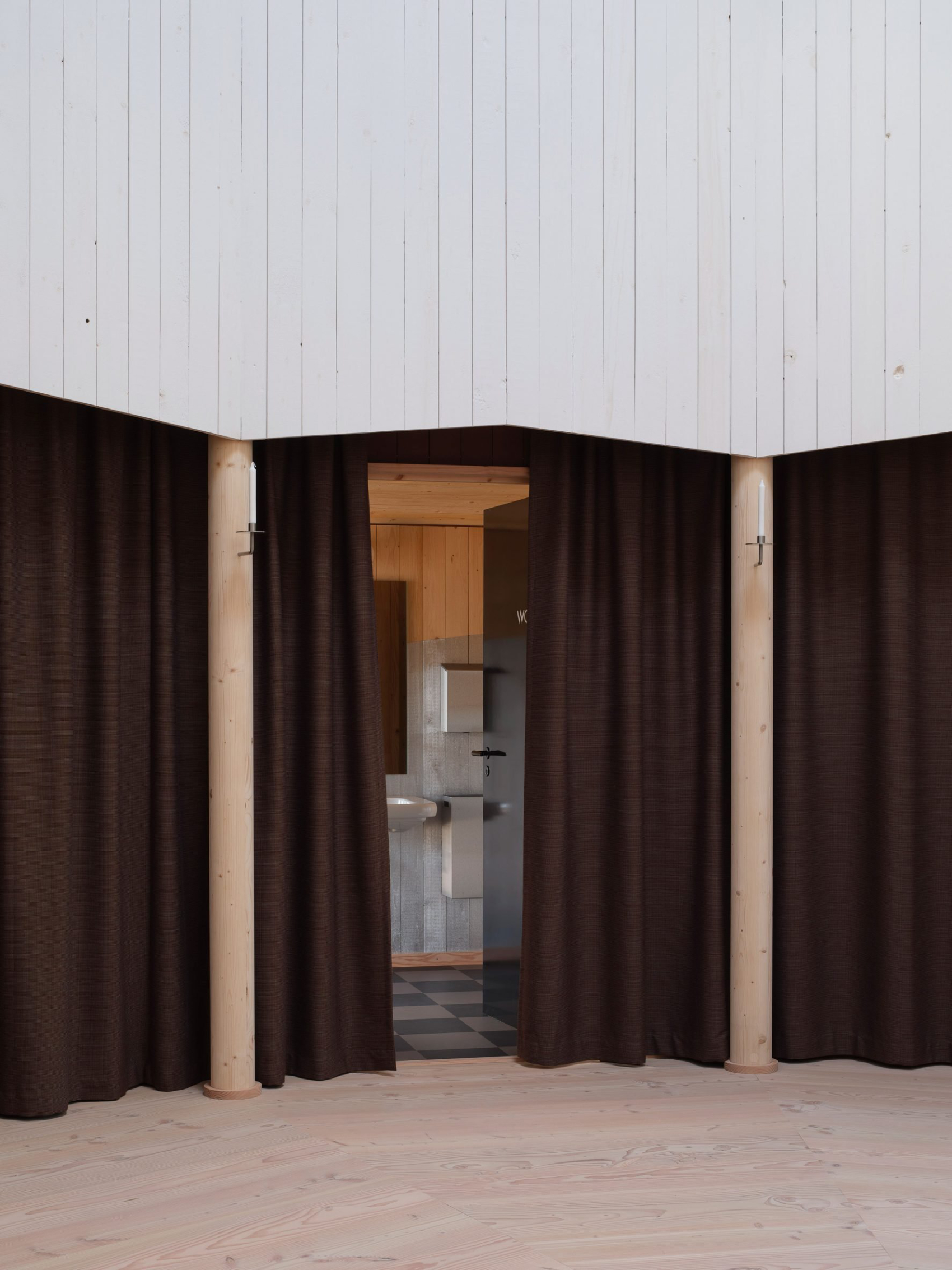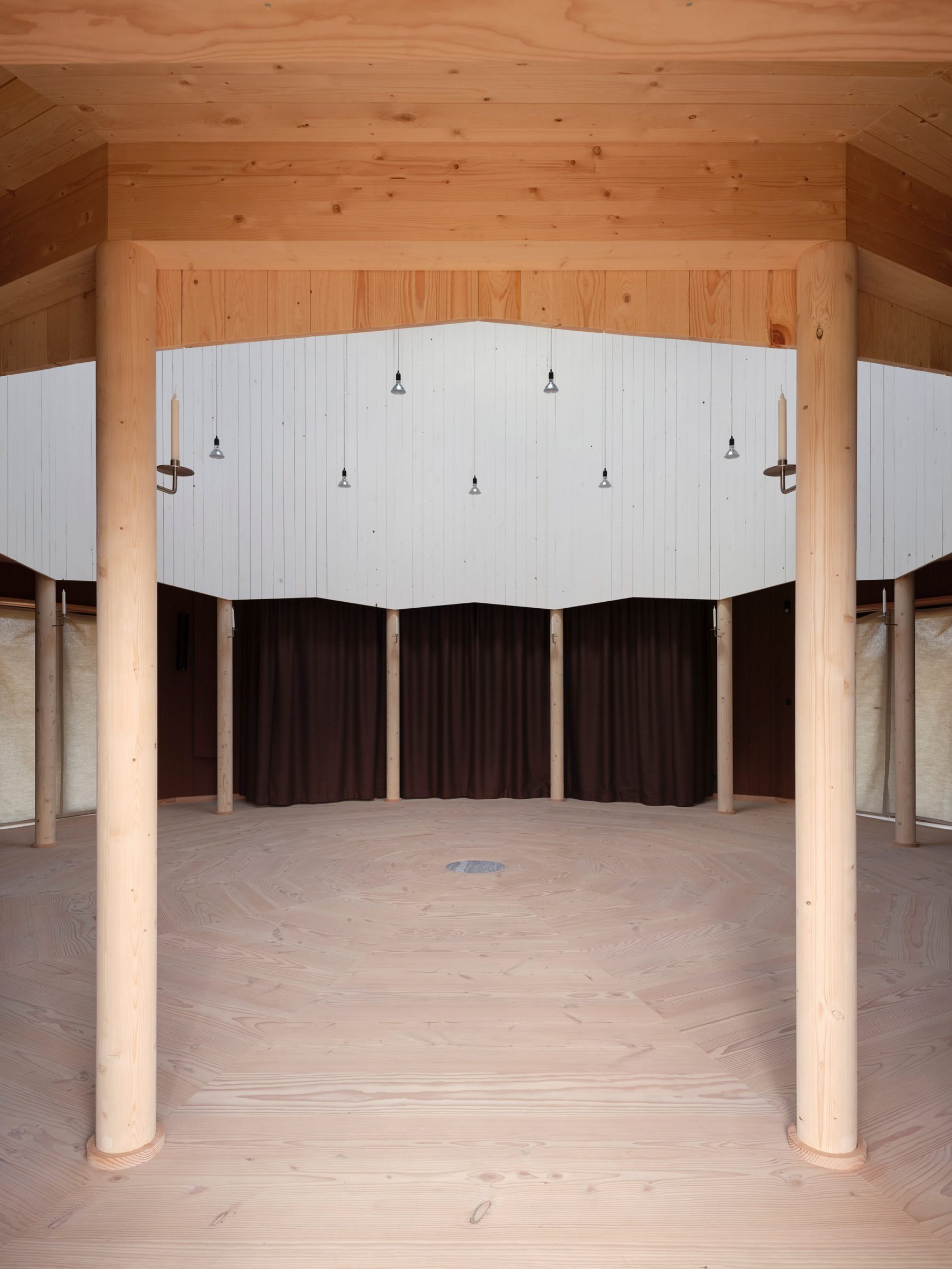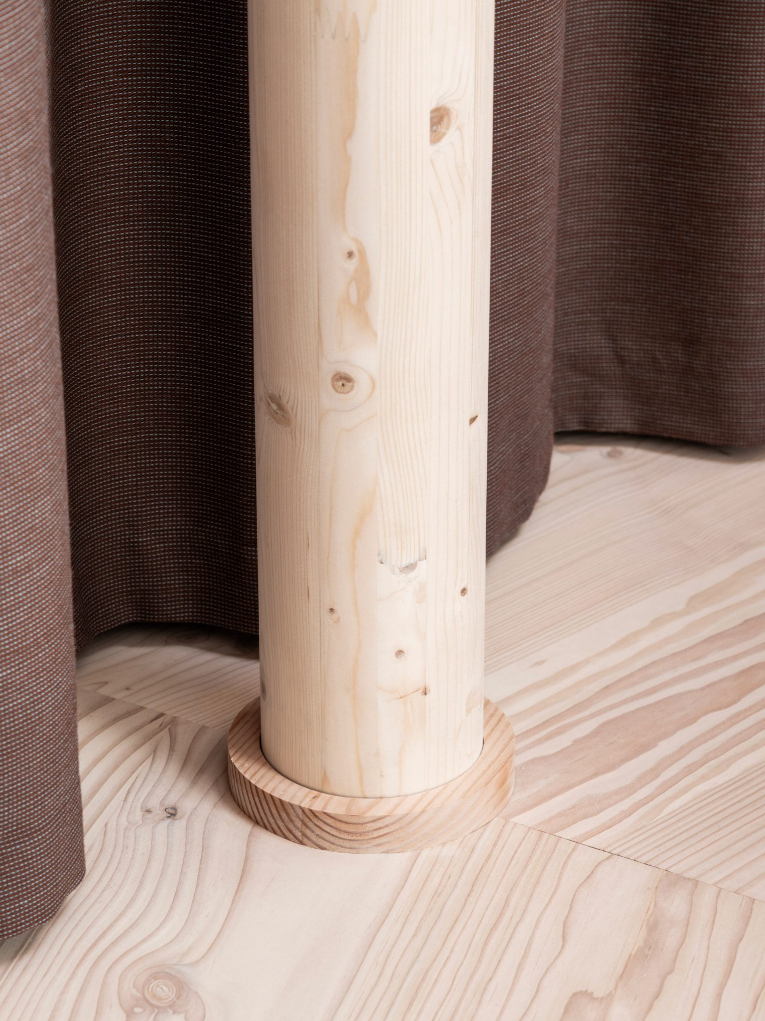 Пол главной комнаты изготовлен из досок бесполезной ели бренда Dineen различной ширины и длины, которые проложены в соответствии с радиальным принципом: универсальные «кольца», конусные к середине. Настенные металлические подсвечники прикреплены к колоннам, а минималистские лампы вокруг легкого люка и подчеркивают «спартанский стиль» пространства, висящего на потолке — так характеризует сам дизайнер. С легкой древесиной и белыми стенами темные шторы между колоннами эффективно контрастируют.