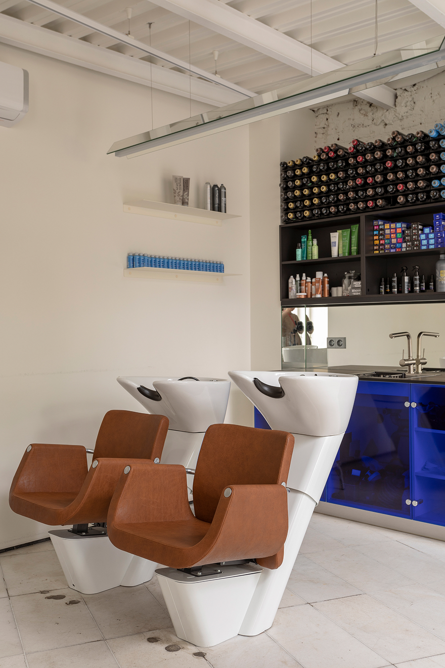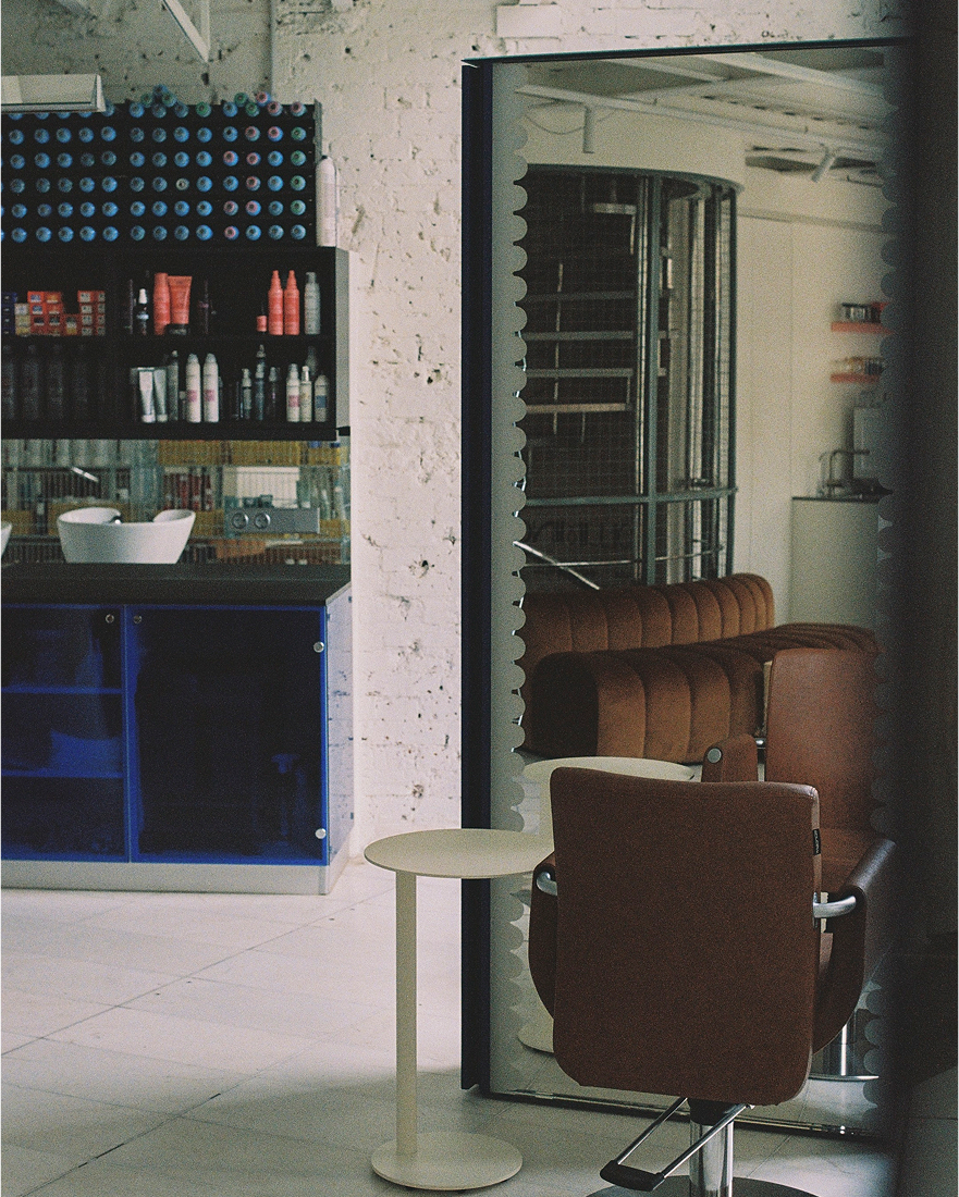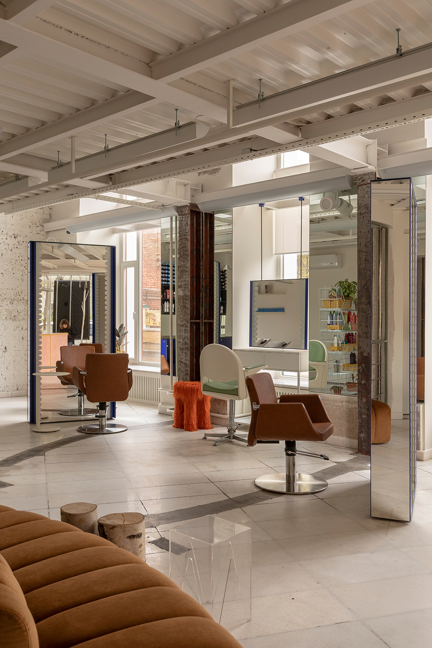 «Мы старались избегать« мебели »как таковой: шкафы были встроены в стены, а прием был изготовлен из обработанного пластика — это похоже на огромную легкомысленную установку. В то же время все места очень удобны для клиентов, зеркала для стилистов были разработаны в сотрудничестве с постоянными дизайнерами освещения».