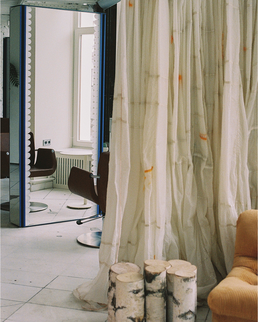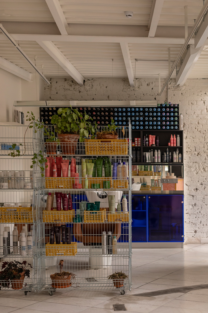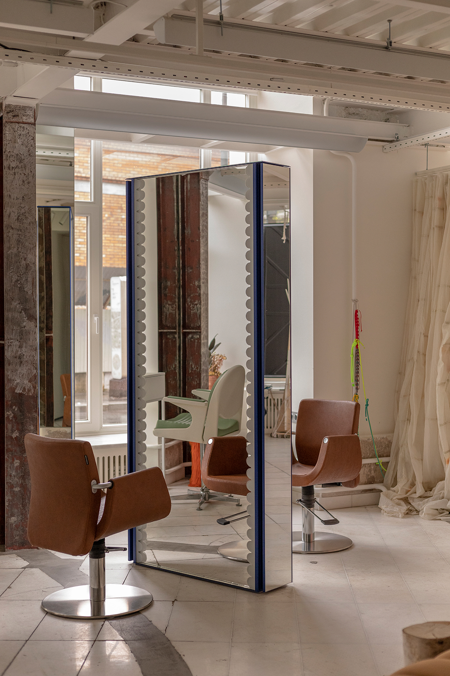 «Мы старались избегать« мебели »как таковой: шкафы были встроены в стены, а прием был изготовлен из обработанного пластика — это похоже на огромную легкомысленную установку. В то же время все места очень удобны для клиентов, зеркала для стилистов были разработаны в сотрудничестве с постоянными дизайнерами освещения».