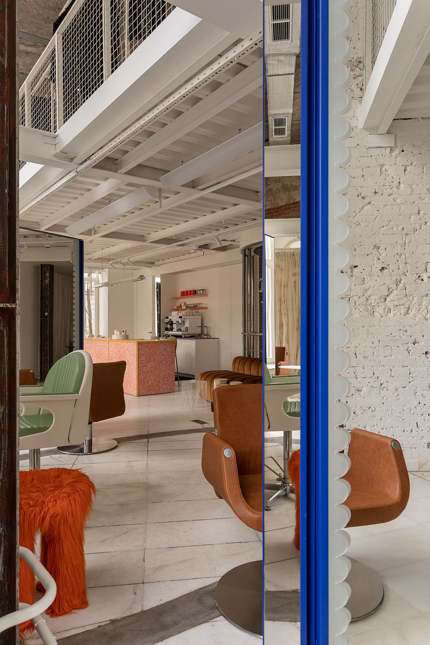 Во время перепланировки они создали прием, места для стилистов, подходящие номера, кафе, зоны ожидания, хранение и офисный блок — все хорошо продуман для удобного потока гостей и работы команды. Название было определено изображением — цвет фар -шерсти стал самым важным акцентом, оно устанавливает настроение. Оставшиеся оттенки служат фон, поддерживают винтаж и атмосферу городского наследия.