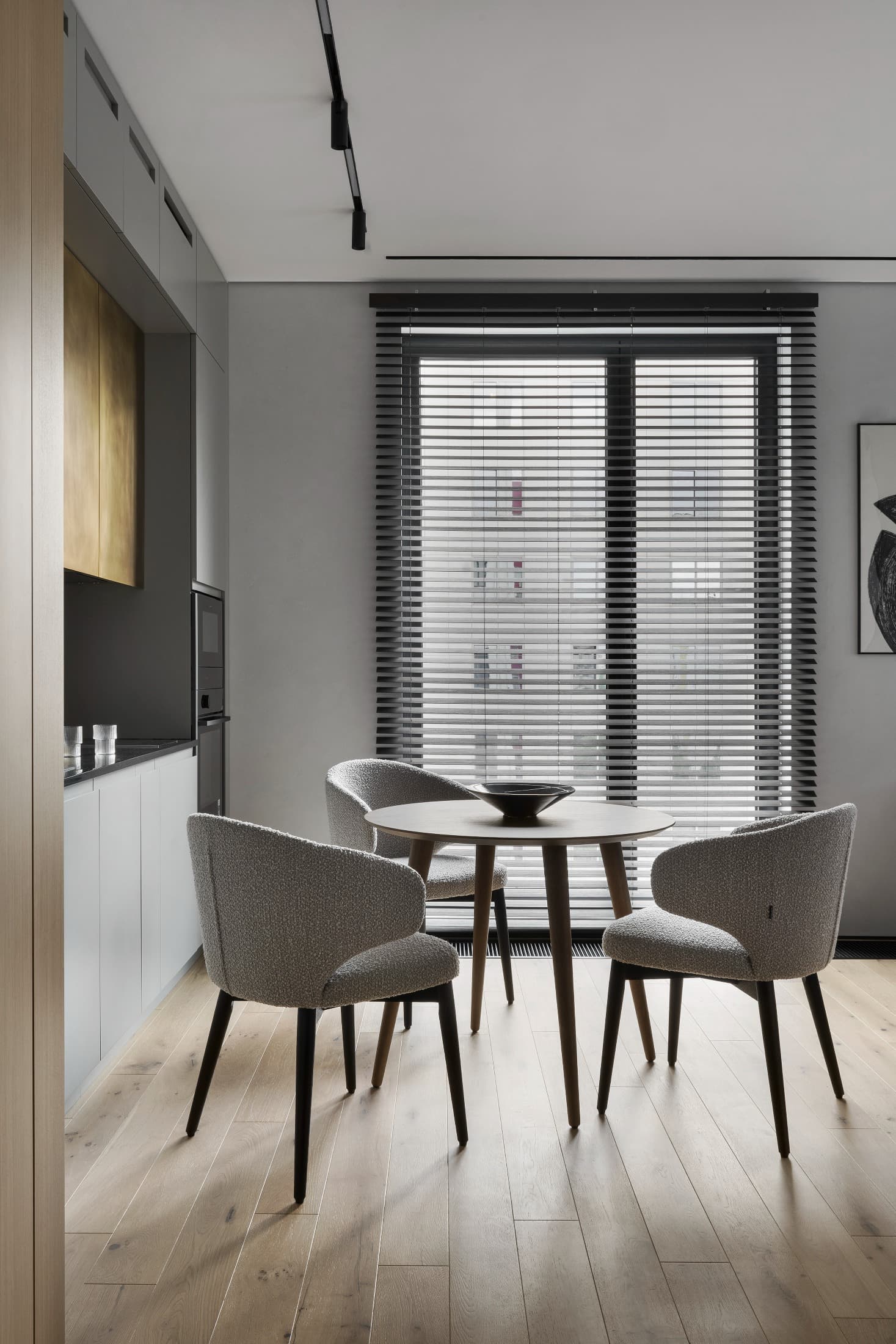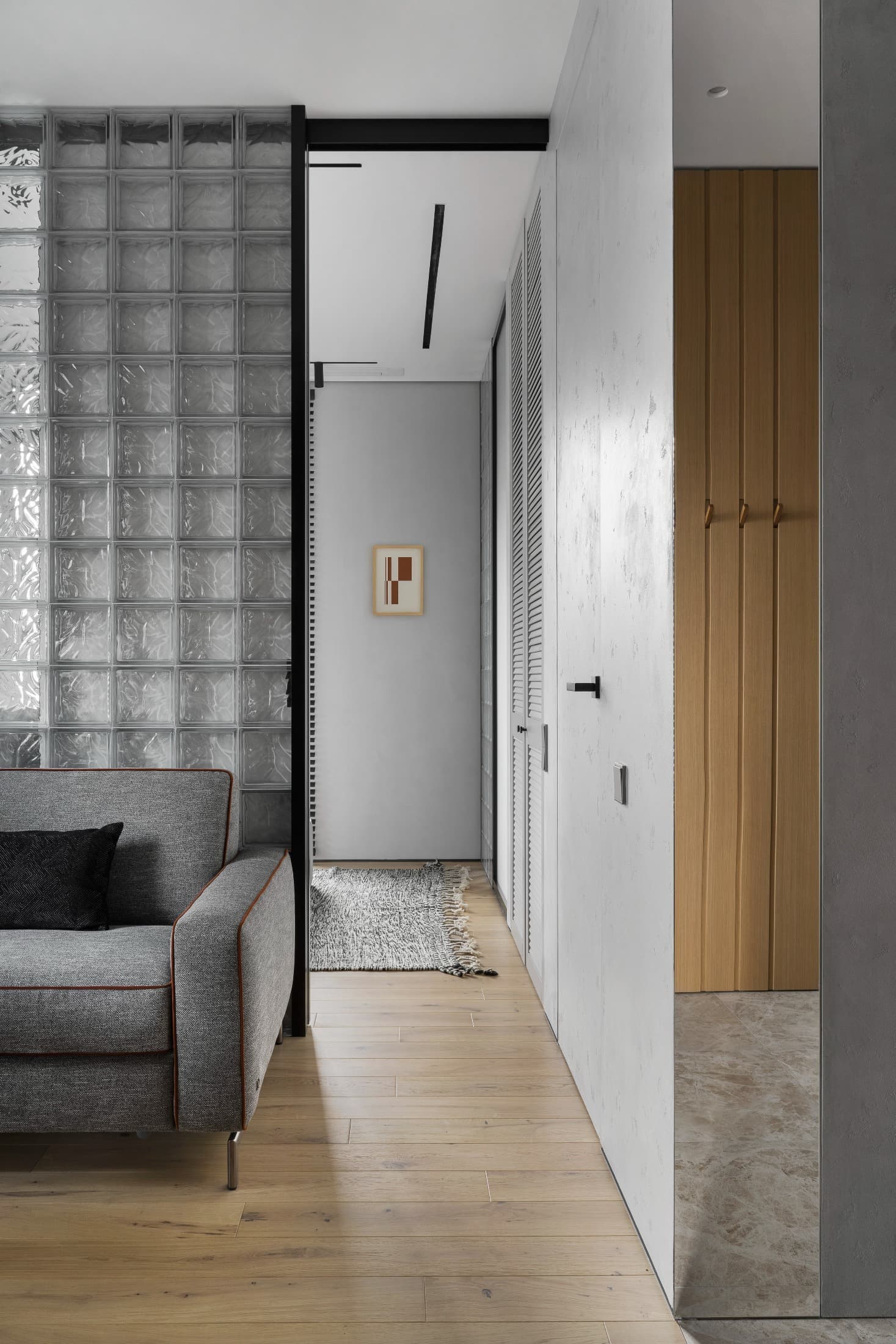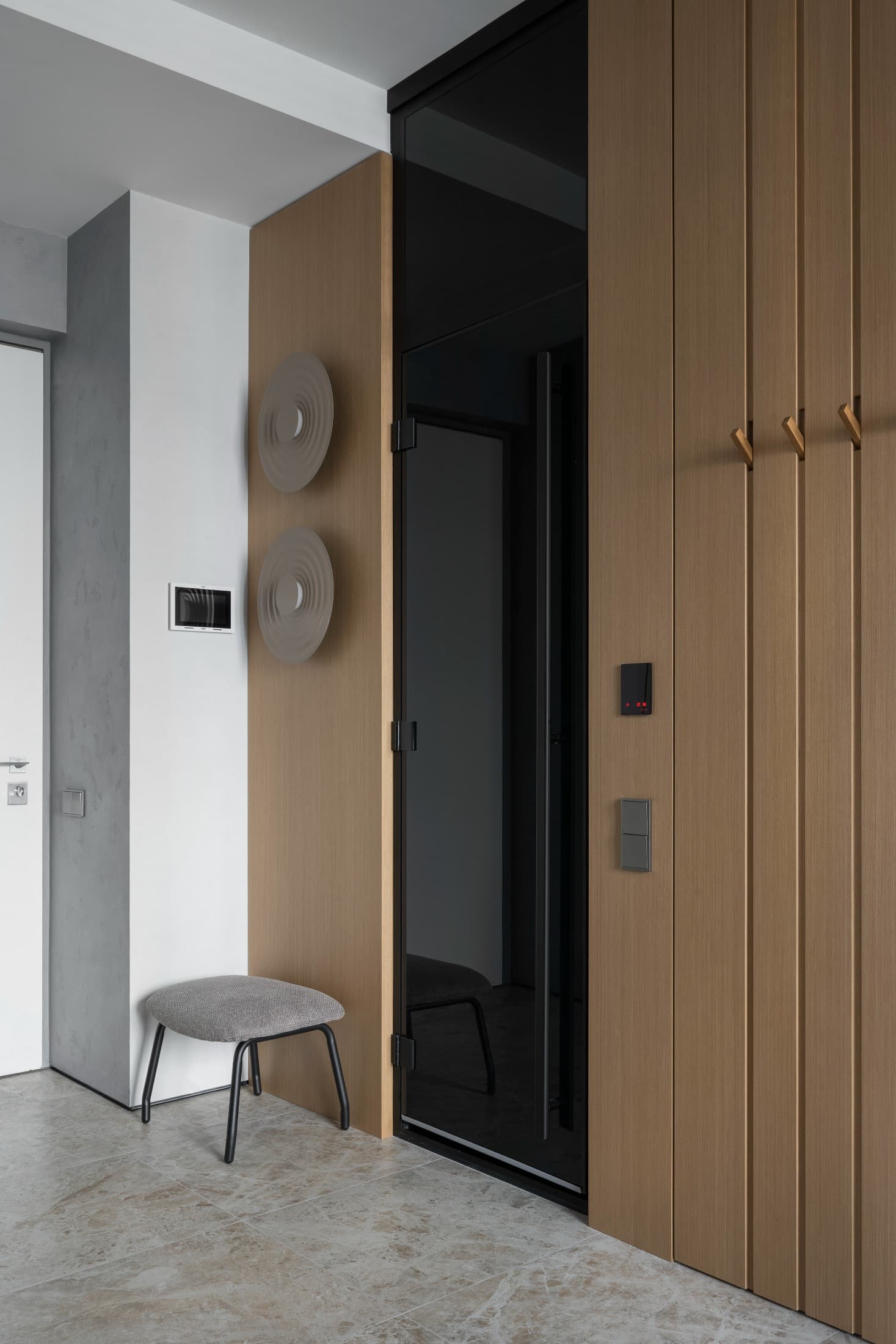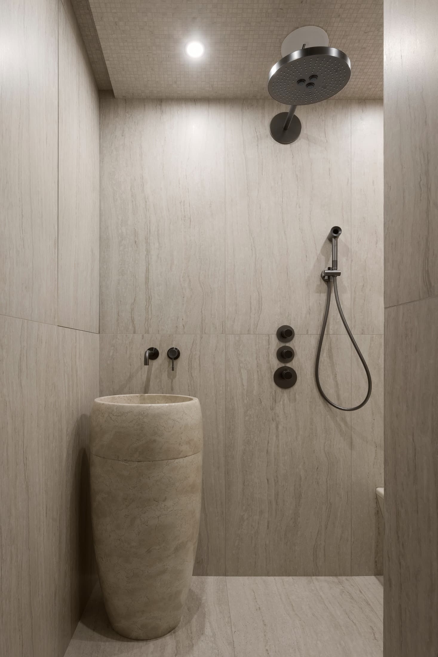 «За белой дверью находится просторная гардеробная с ползущей зоной, объем которой пространство не перегружено благодаря обратной системе открытия. Основным моментом проекта был полностью разнообразный хаммам — редкое решение для квартир такого счетчика. Он расположен за черной стеклянной дверью с нетипично высокой фрамой, что помогло».