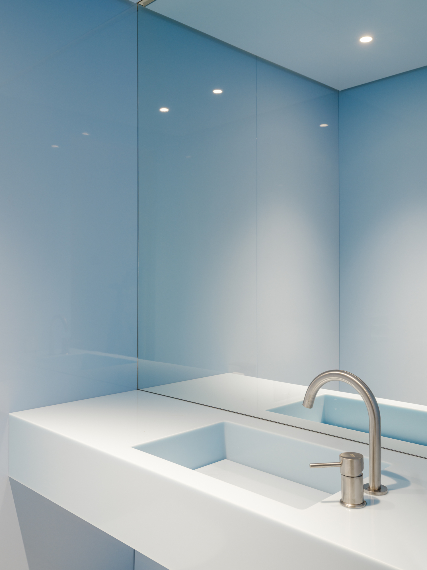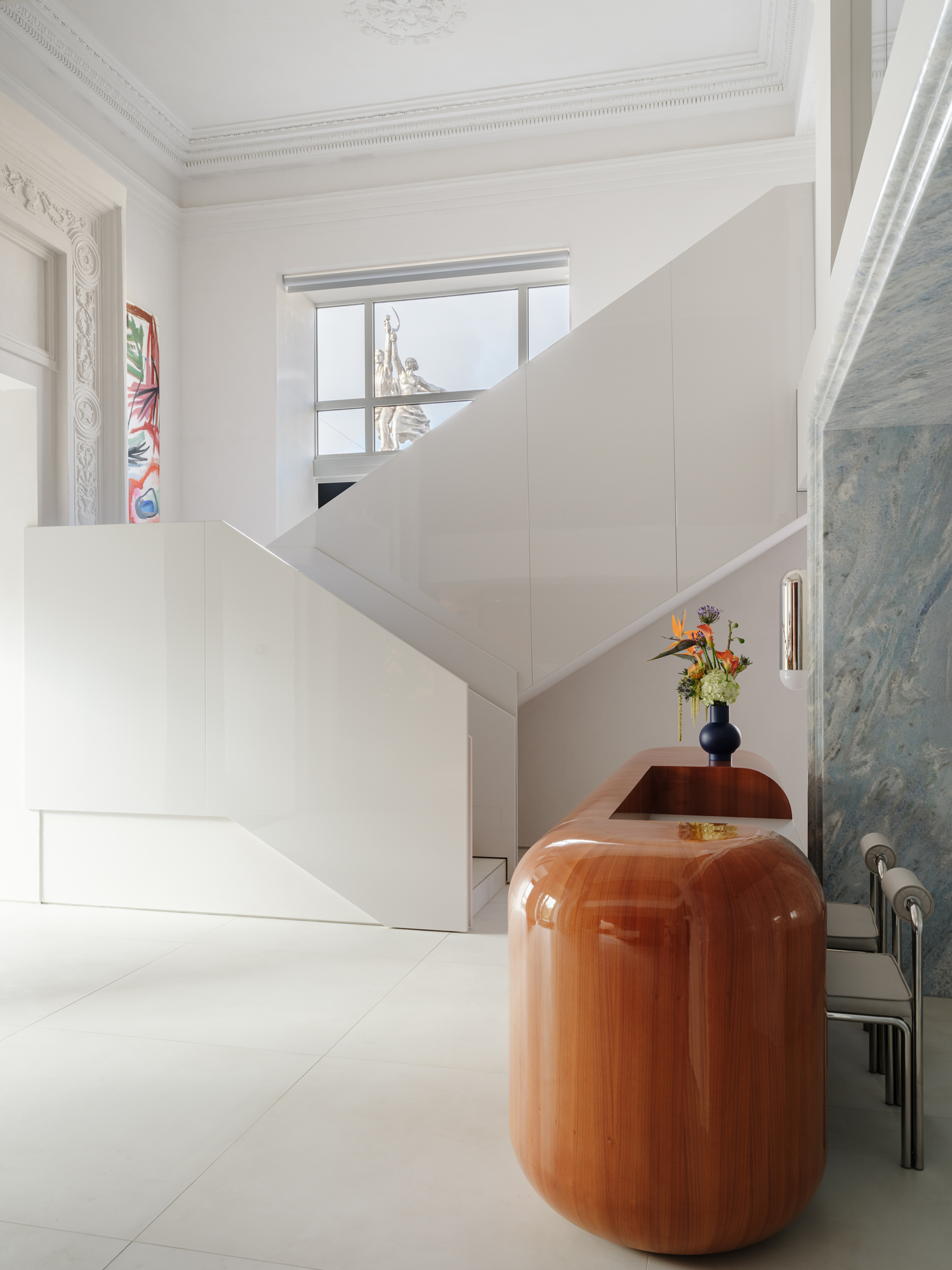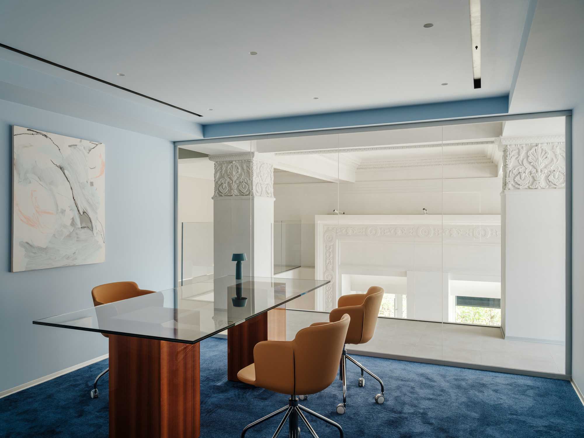 Офисное пространство разделено на разные уровни. В приемной с нишей из голубого камня установлен специально созданный для этого офиса «островной стол» длиной более трех метров. Он изготовлен из натурального шпона Макоре — редкой породы дерева с особым рисунком текстуры. Использование именно этого материала в отделке офиса продаж не случайно: такой же шпон украшает вестибюль дома МИРА.