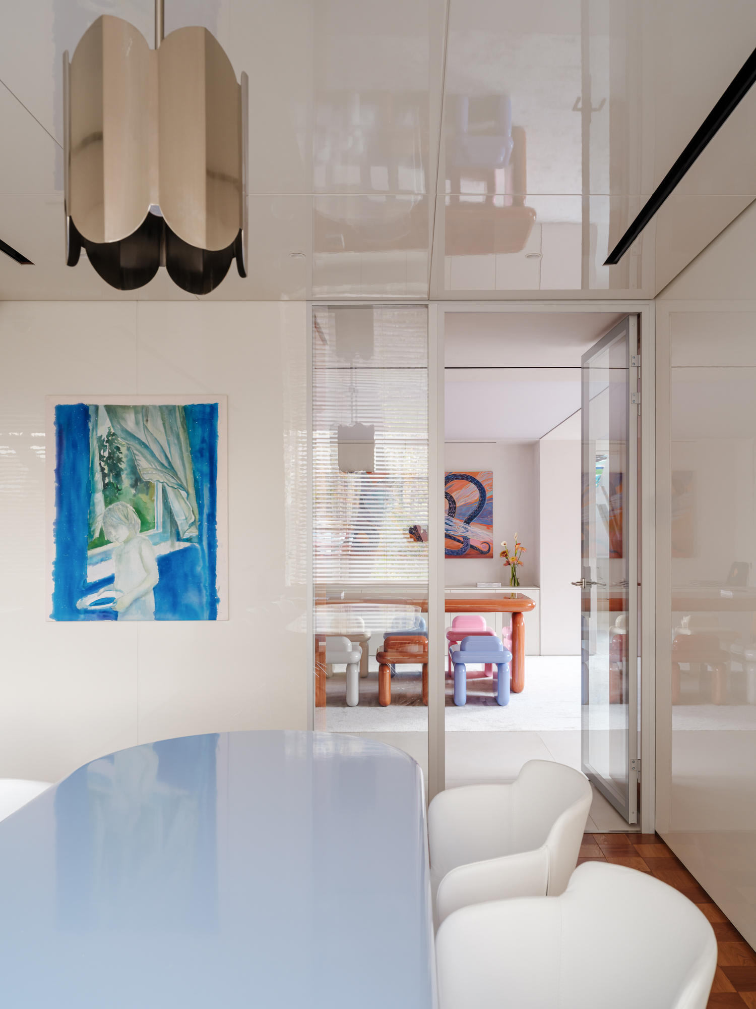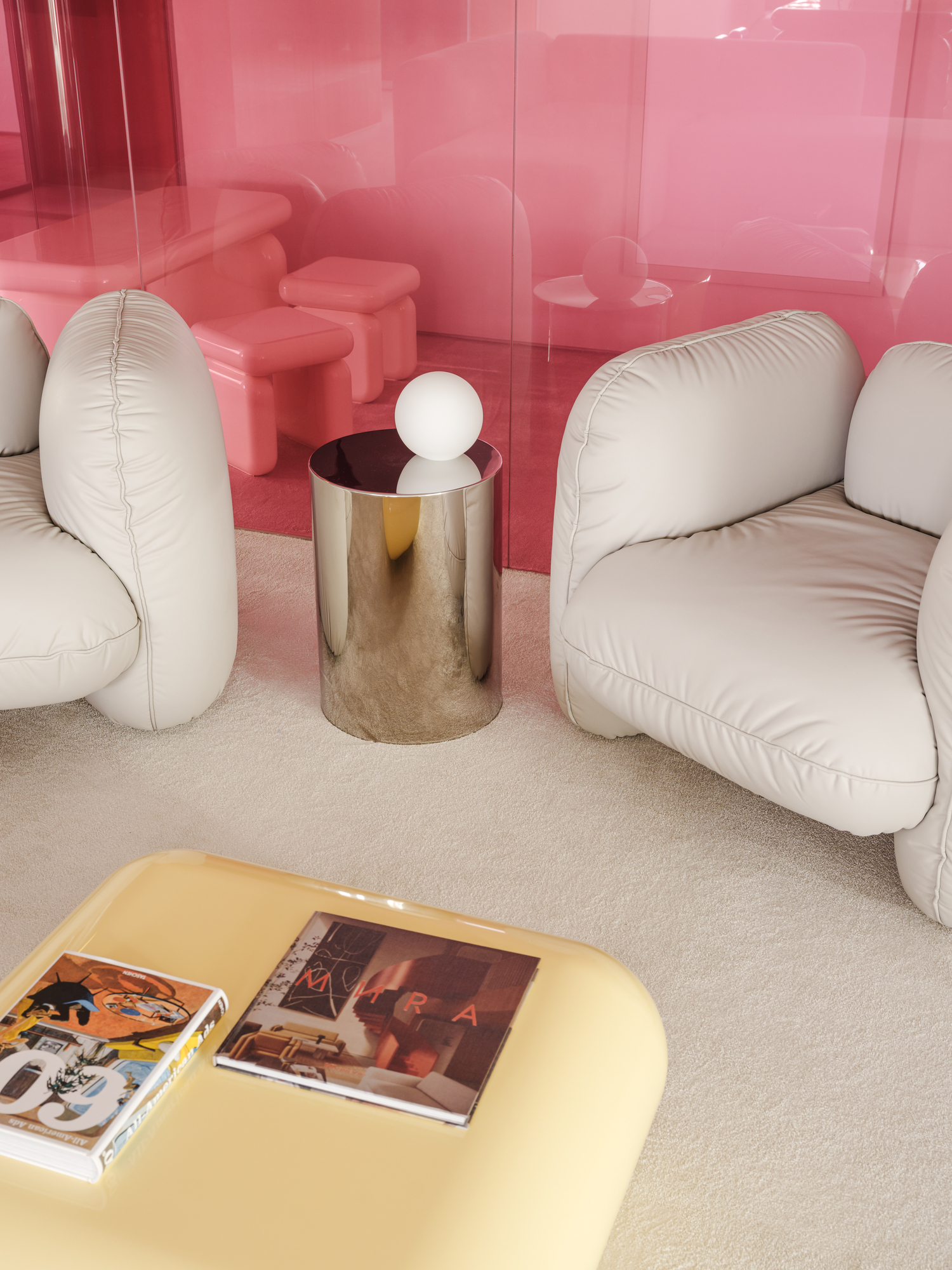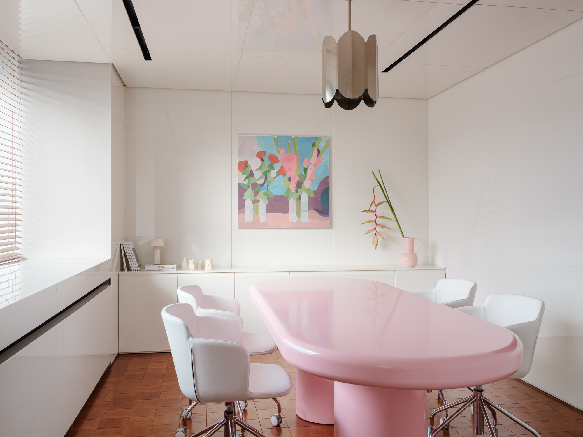 Для детей оборудована светлая игровая комната, отделенная от общей зоны прозрачными розовыми перегородками. Дети могут пользоваться мебелью необычной формы и столиками для рисования, пока родители обсуждают покупку. Визуально входную группу, зоны ожидания и детскую объединяет светлый потолок со световыми коробами. Вся мебель из коллекции дизайнерского агентства EdxxKat изготавливается по индивидуальным эскизам. Арт-объекты для проекта были специально отобраны из коллекций галерей, работающих с самыми актуальными тенденциями.