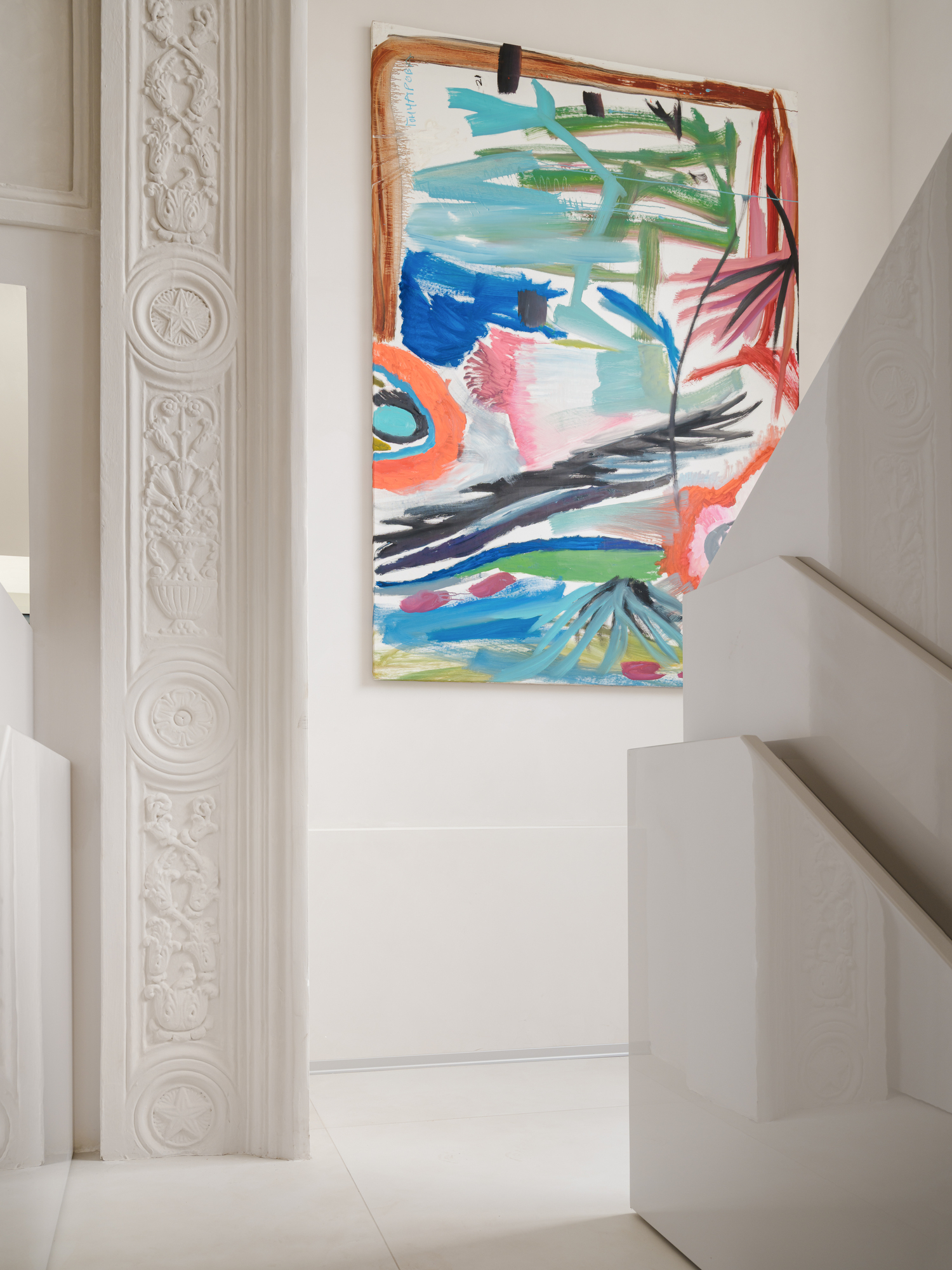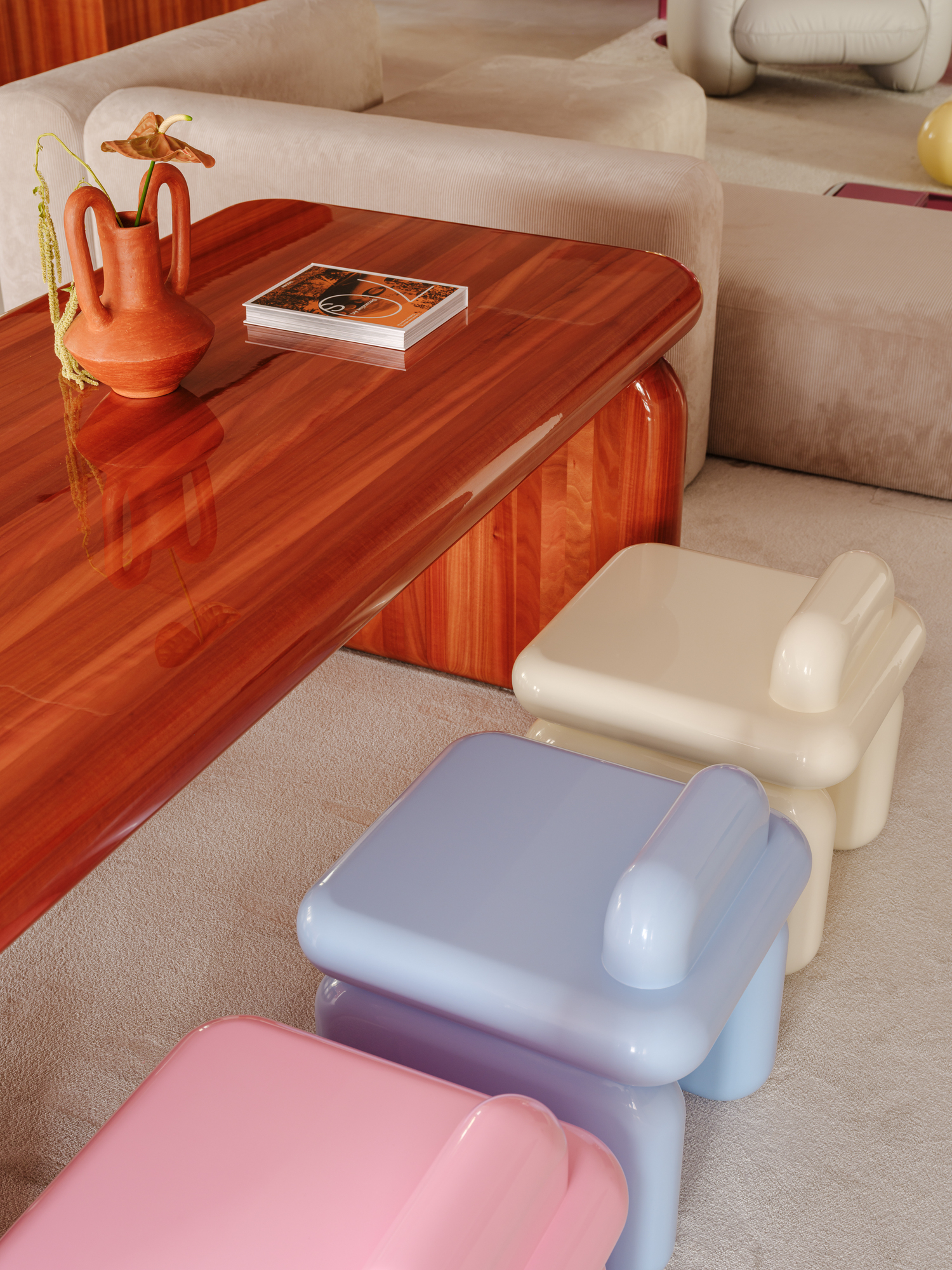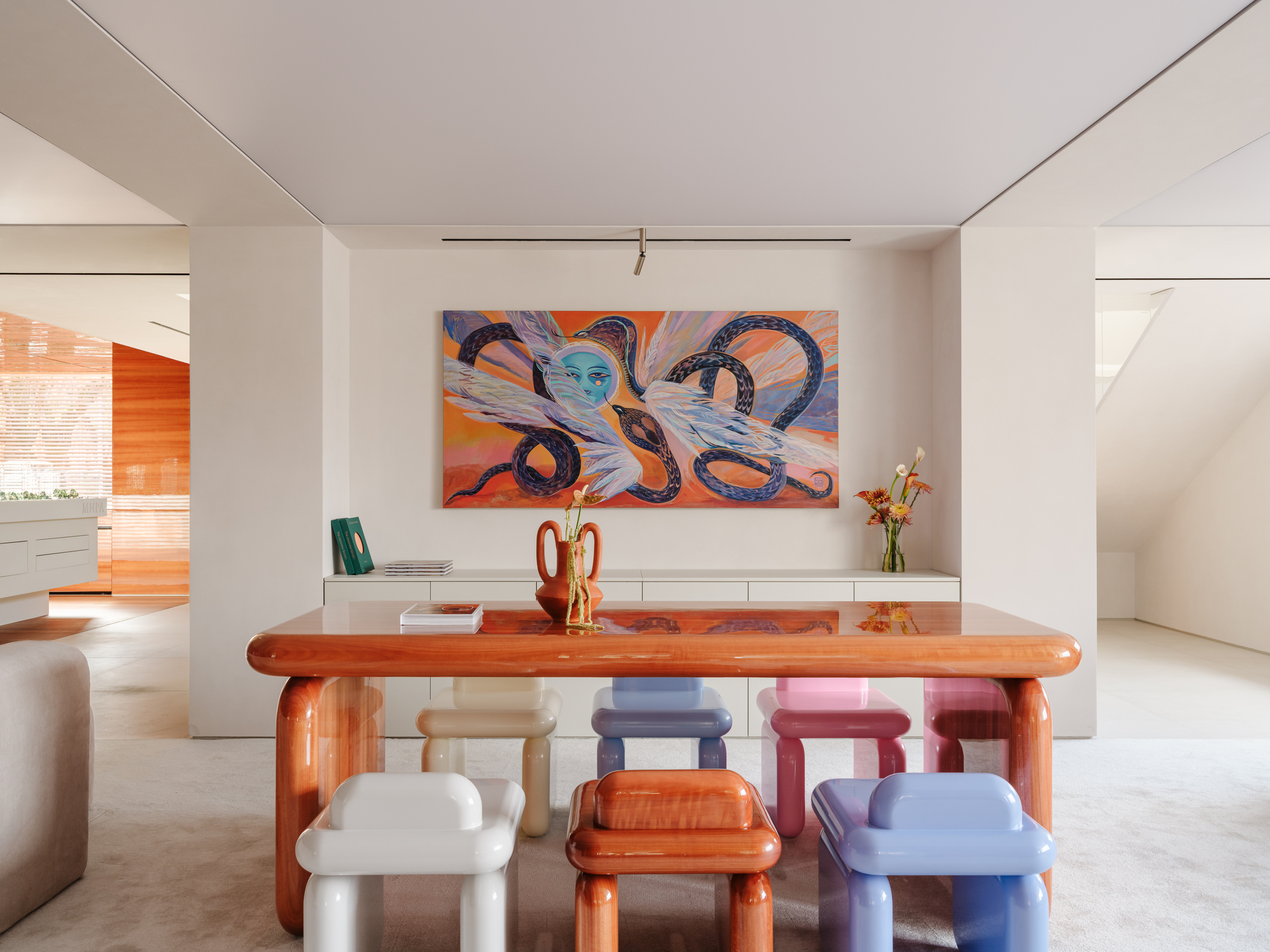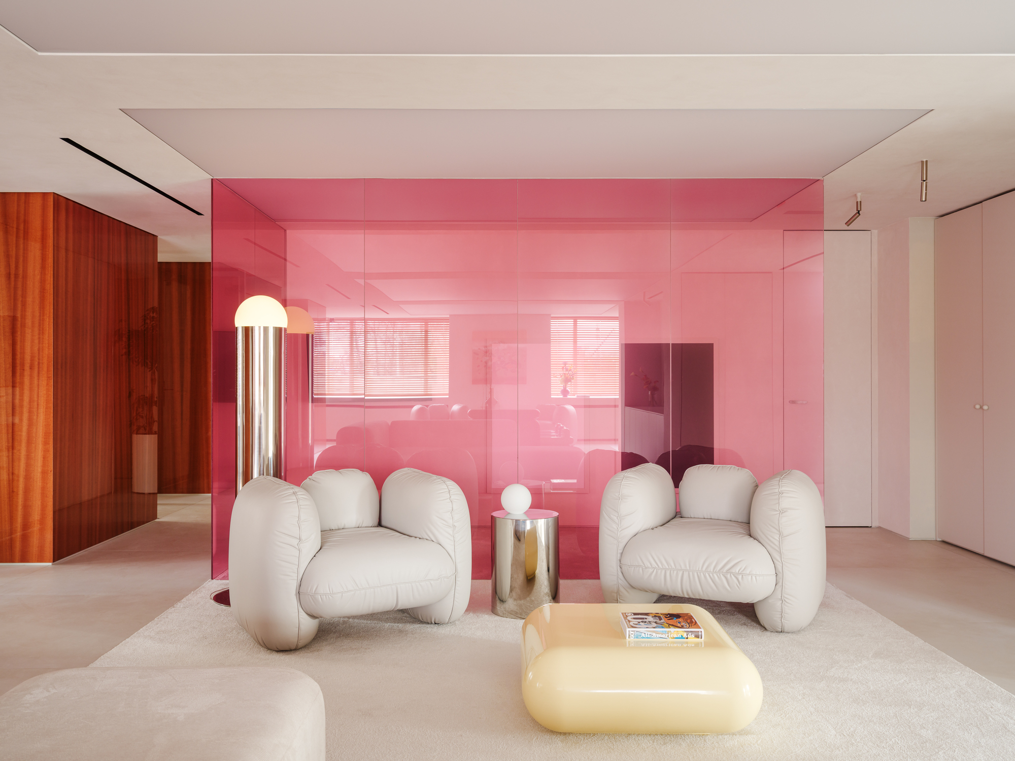 Для детей оборудована светлая игровая комната, отделенная от общей зоны прозрачными розовыми перегородками. Дети могут пользоваться мебелью необычной формы и столиками для рисования, пока родители обсуждают покупку. Визуально входную группу, зоны ожидания и детскую объединяет светлый потолок со световыми коробами. Вся мебель из коллекции дизайнерского агентства EdxxKat изготавливается по индивидуальным эскизам. Арт-объекты для проекта были специально отобраны из коллекций галерей, работающих с самыми актуальными тенденциями.