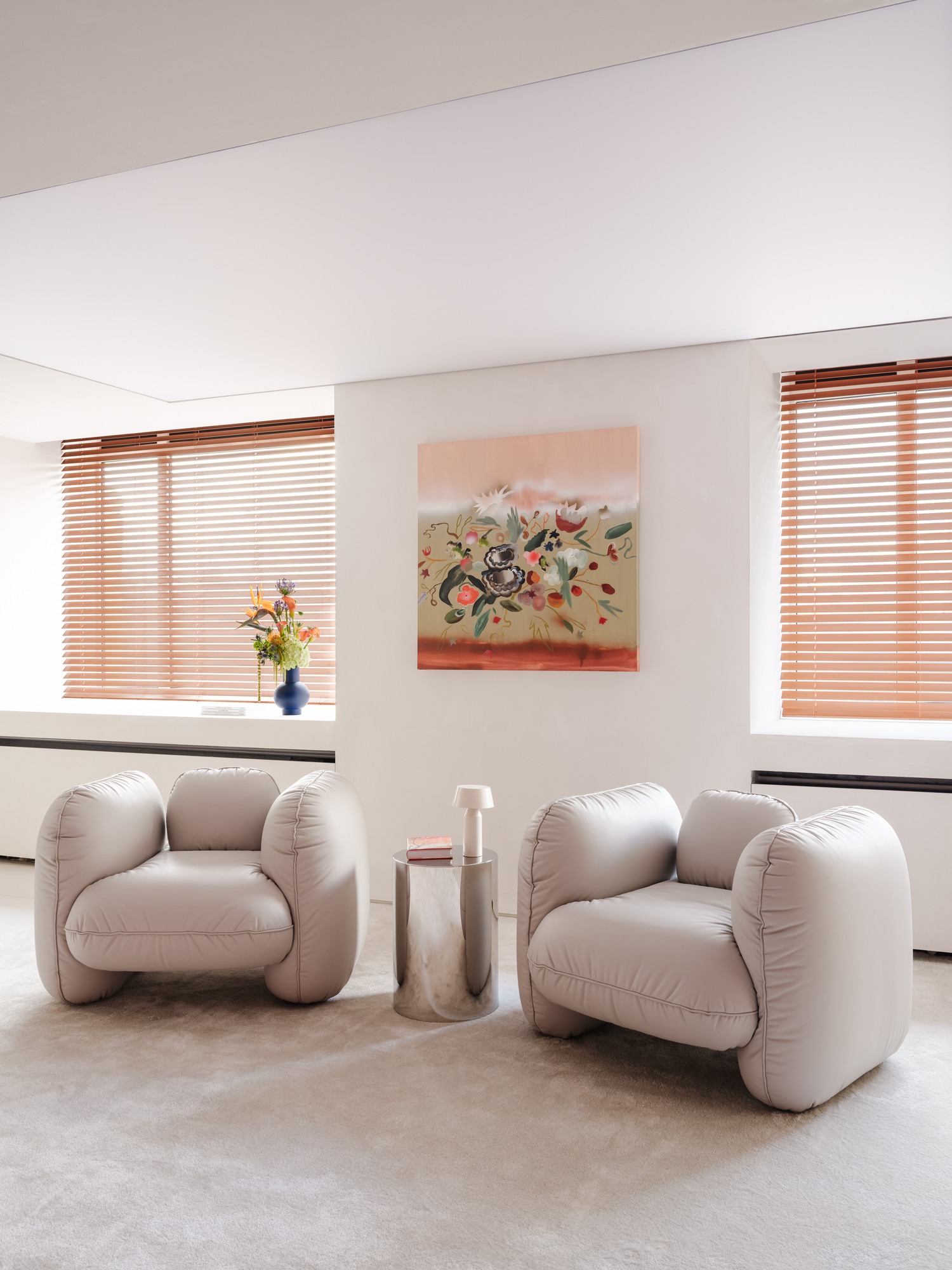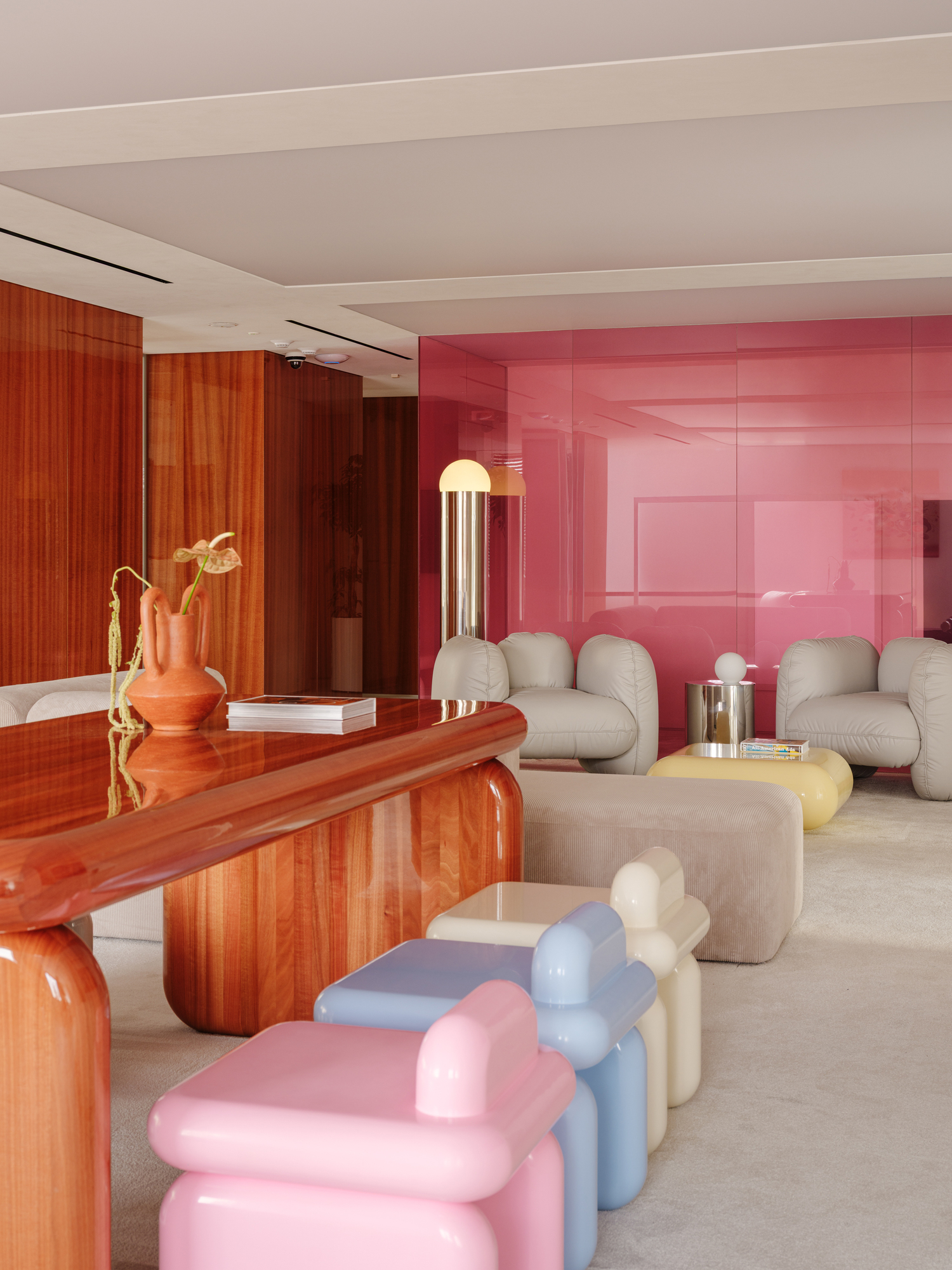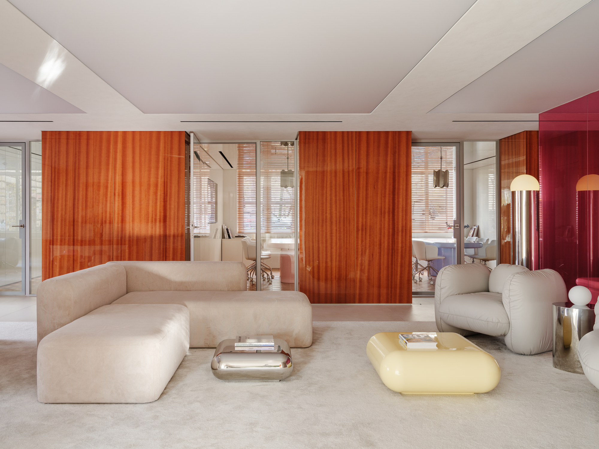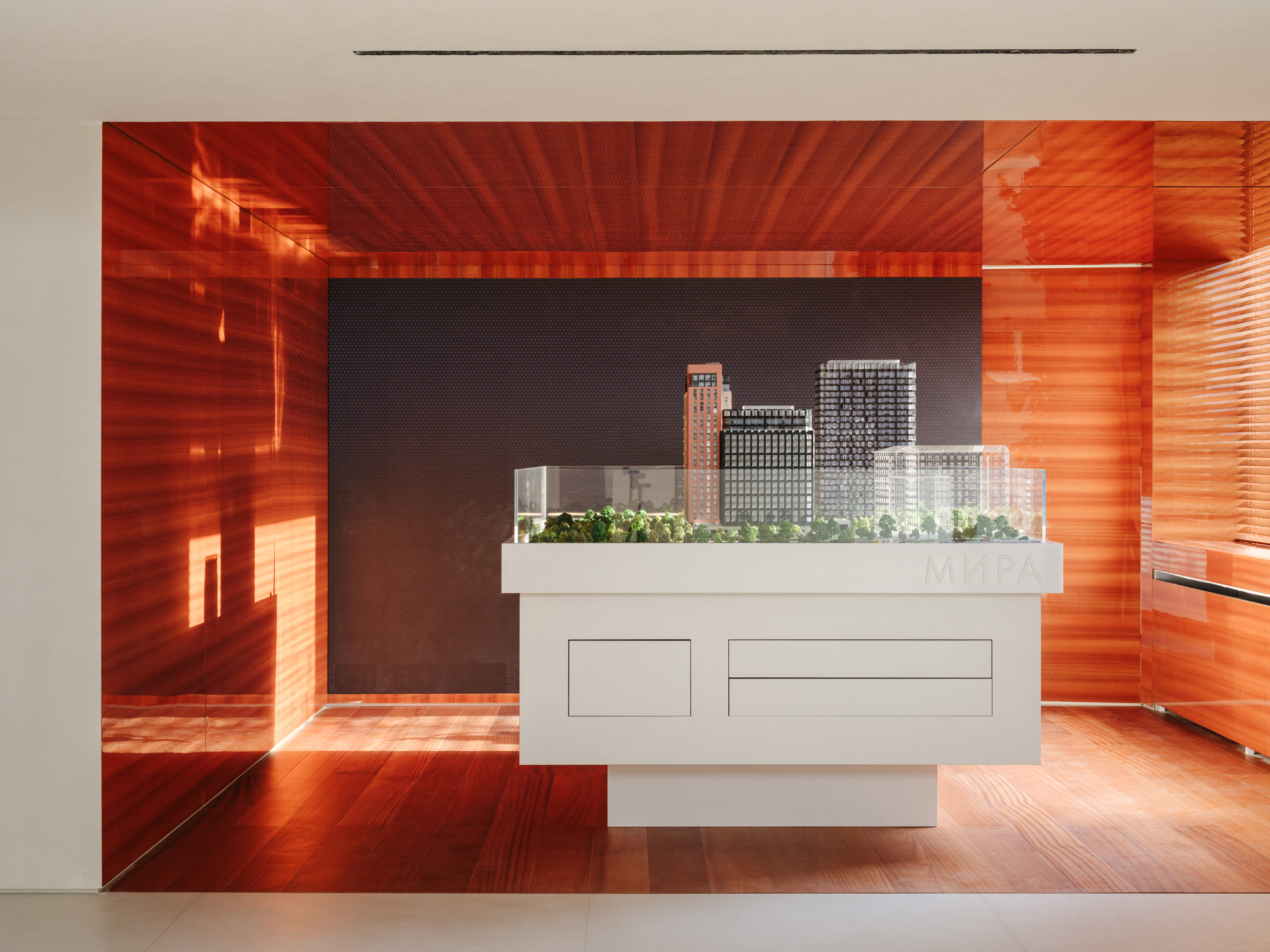В зоне ожидания установлены мягкие диваны и большой дизайнерский конференц-стол из массива дерева Макоре. В мебели сочетаются дерево, структурированный текстиль и нержавеющая сталь, что, по замыслу авторов, создает одновременно атмосферу комфорта и динамичности. Ритм задают стены из стекла и шпона розовых и голубых тонов, разделяющие переговорные комнаты. Пространство, где представлен архитектурный макет, спроектировано в формате технокомнаты в форме куба, полностью отделанного лаковым шпоном, с медиаэкраном, закрывающим всю стену.
