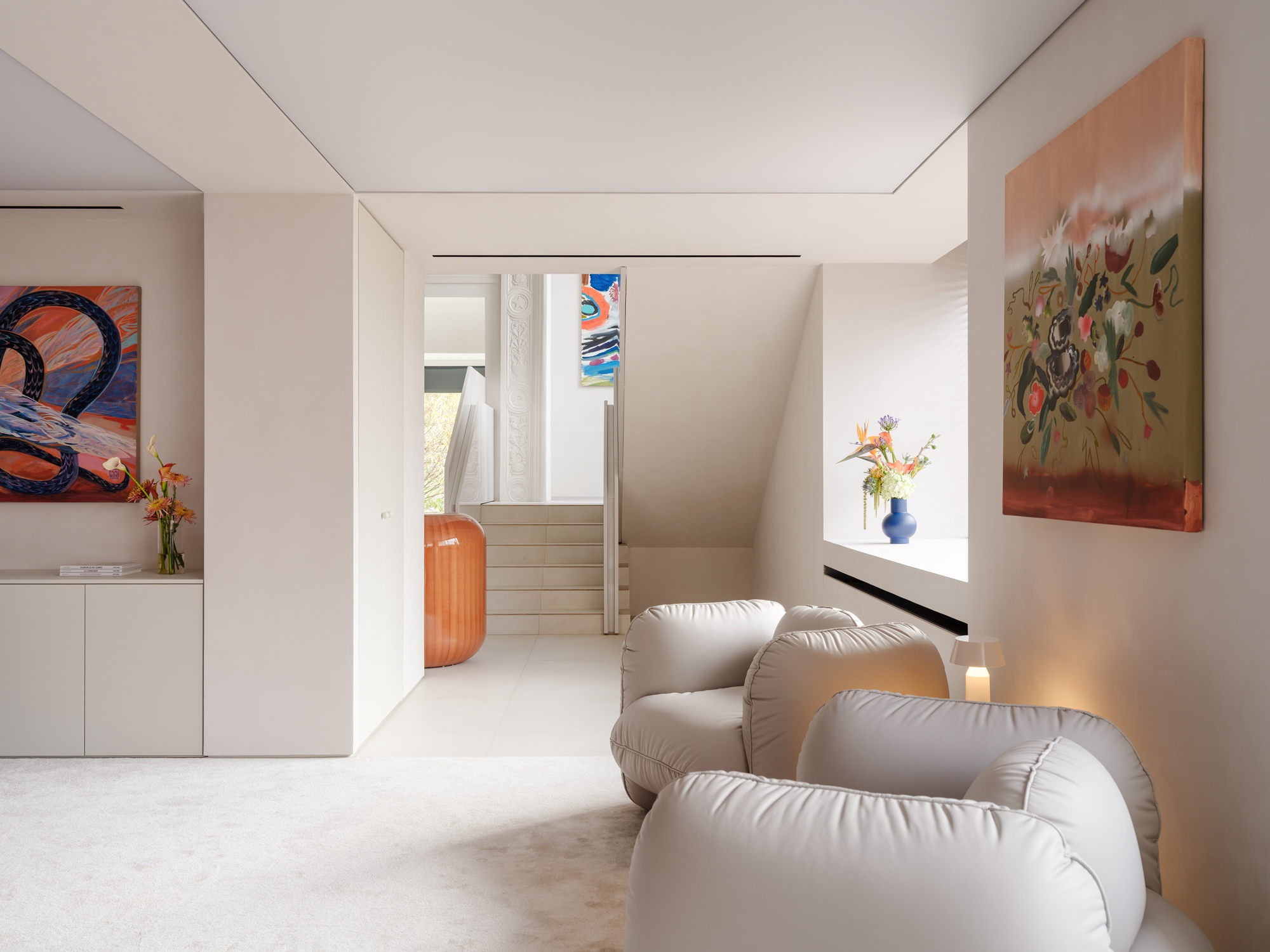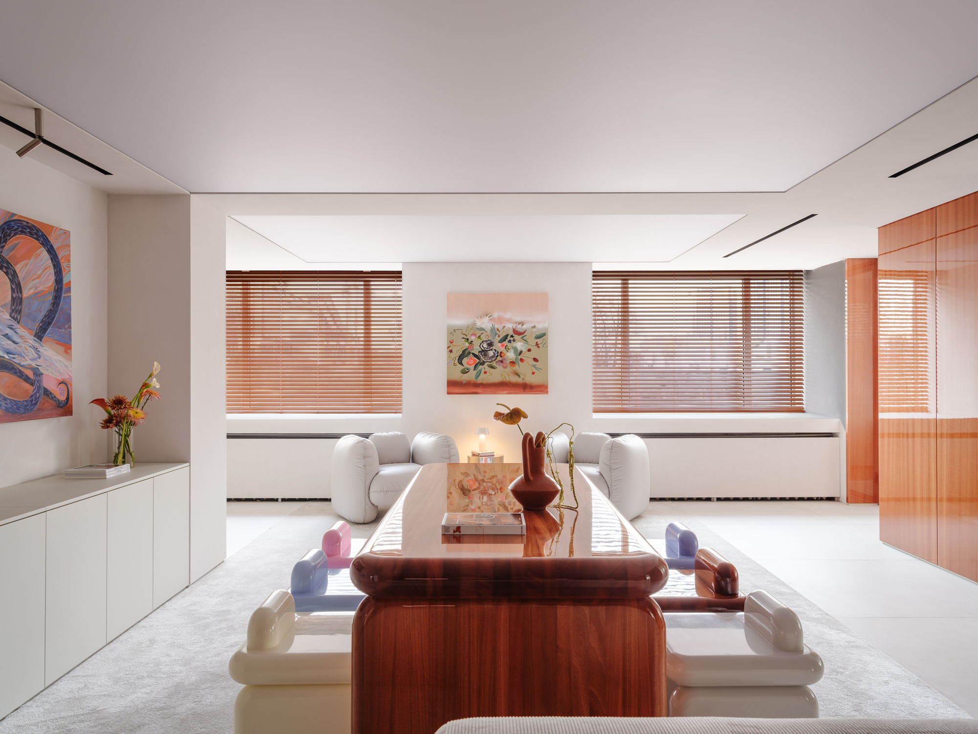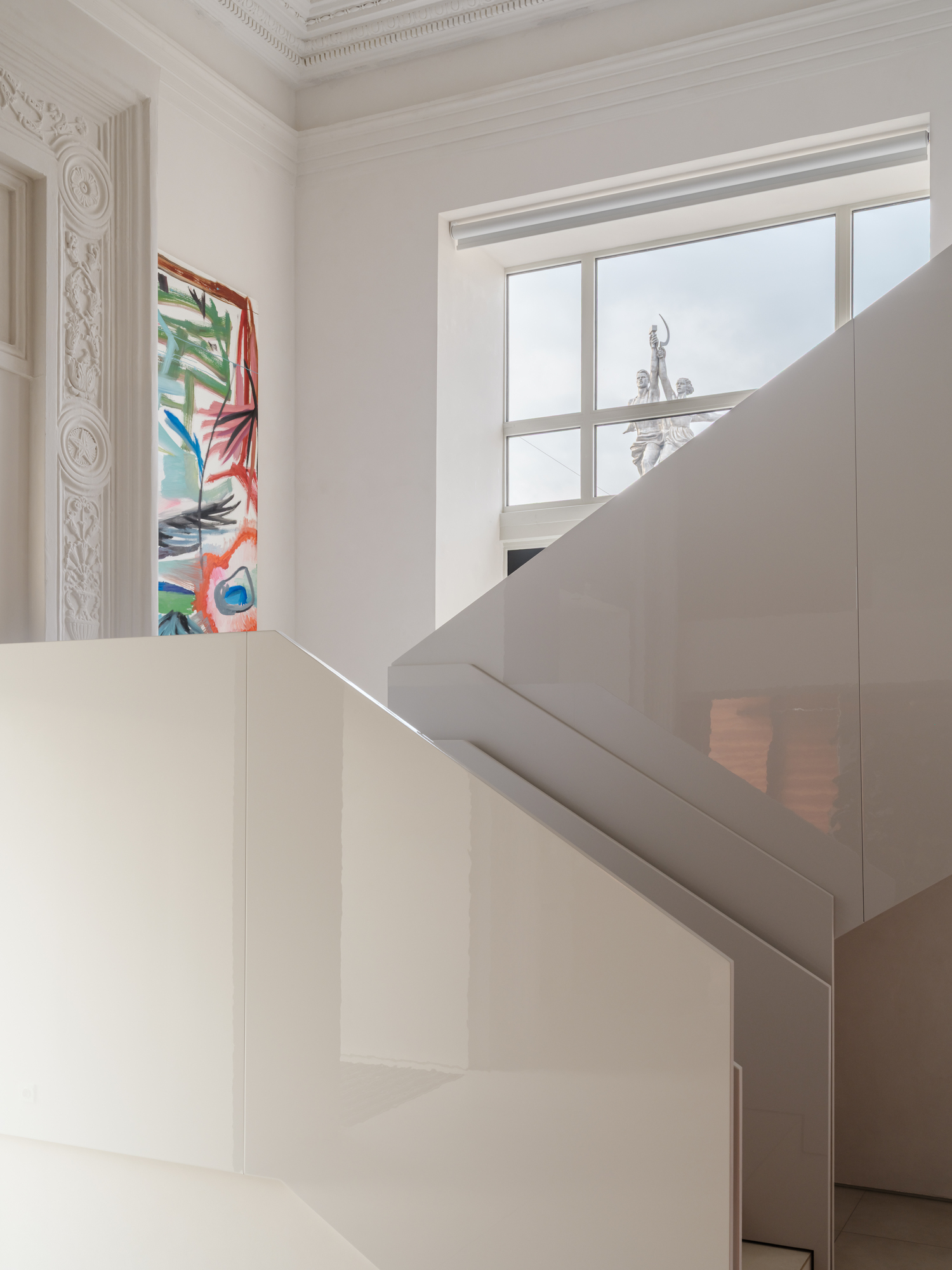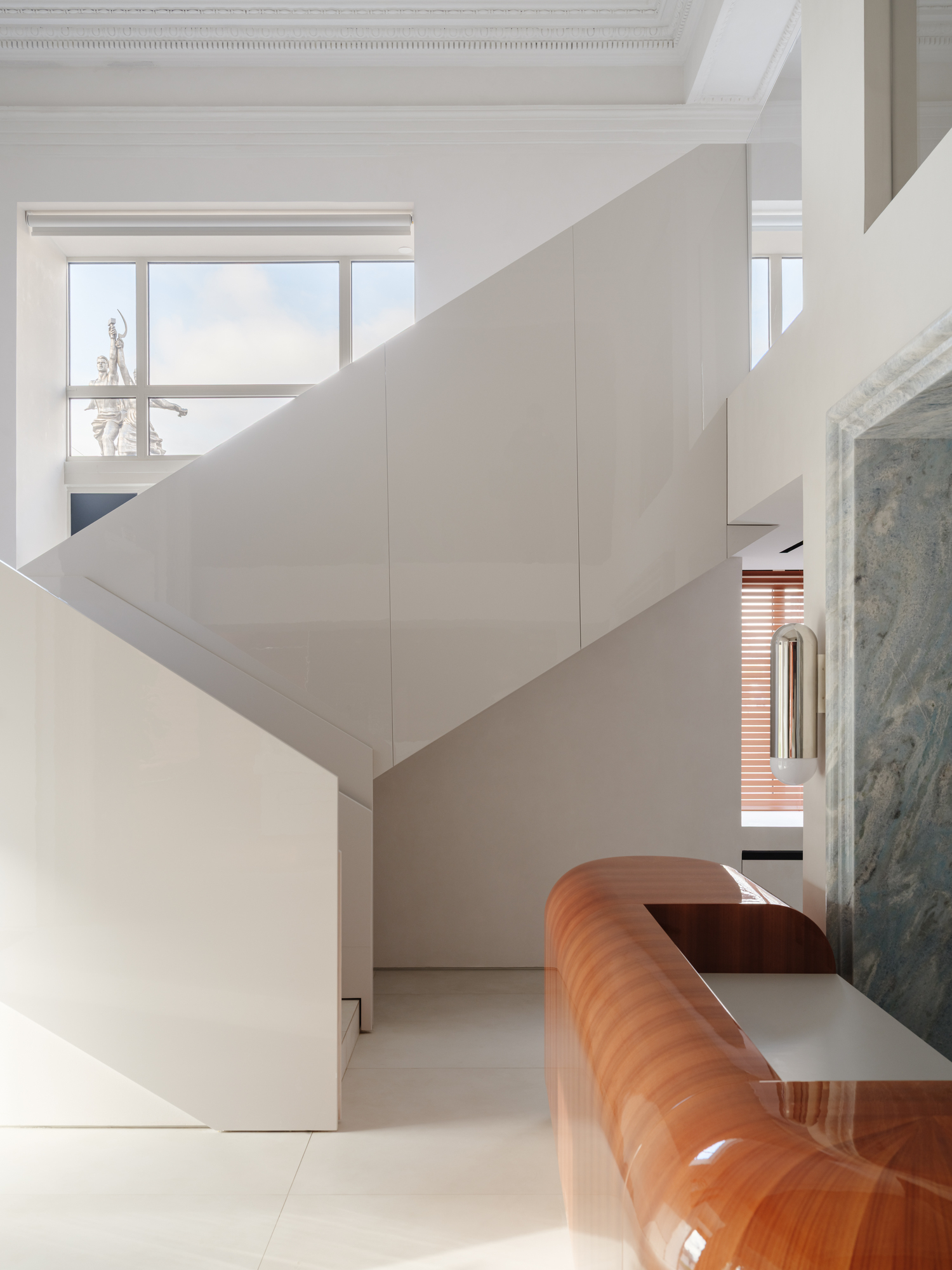 В пространстве площадью более 510 квадратных метров мастерски использованы преимущества сталинского ампира: высокие потолки, панорамные окна и лепнина. «Второй свет» в комнате раздвигает визуальные границы интерьера, делая его воздушнее и светлее. Цилиндрические арт-объекты и серебристые металлические светильники напоминают о покорении пространства, а плавные формы мебели и нежные цвета в дизайне делают интерьер более современным. Сохранившаяся здесь лепнина гармонично сочетается с глянцевыми поверхностями и выразительной росписью, а холодный мрамор – с голубыми, кремовыми и розовыми тонами.