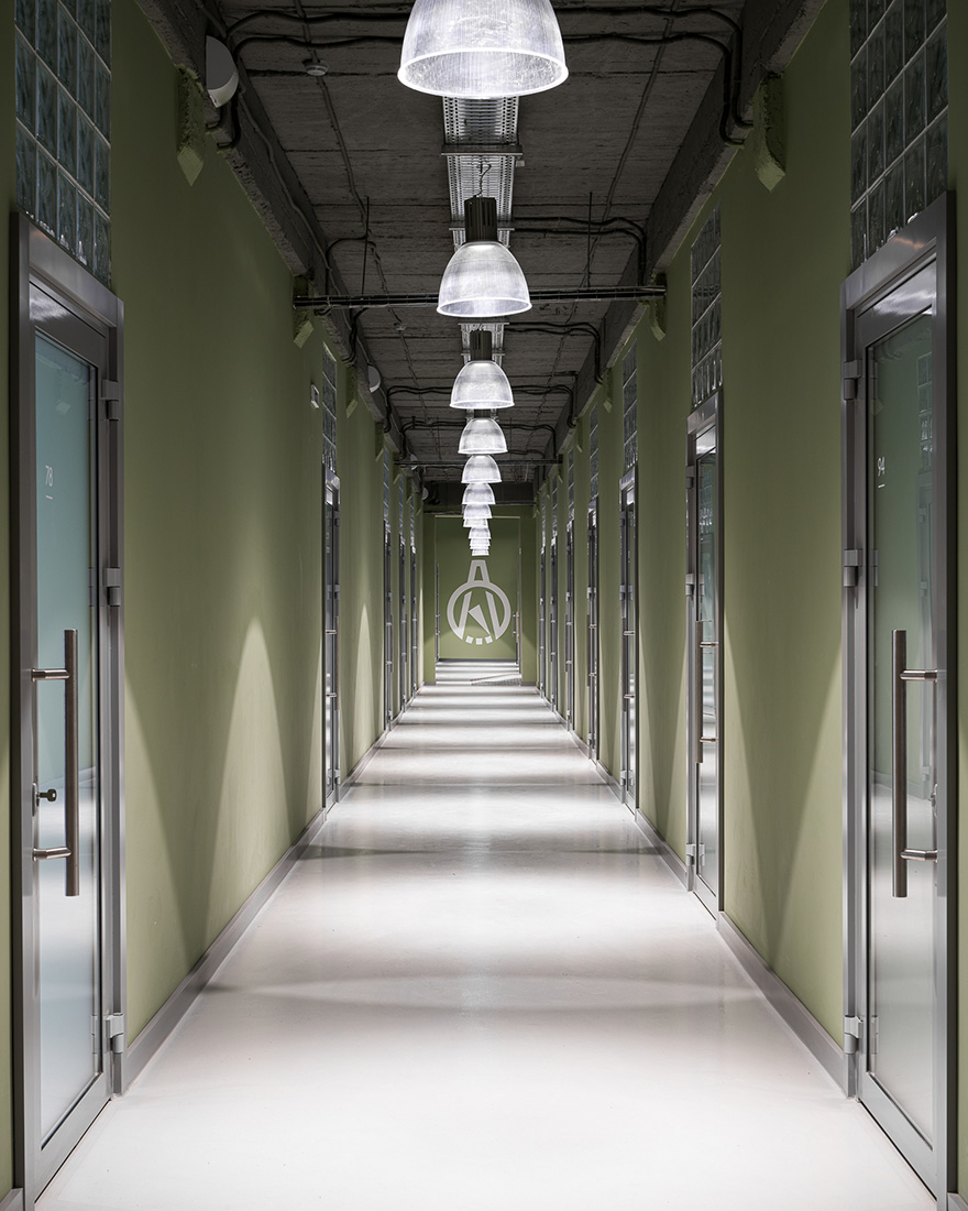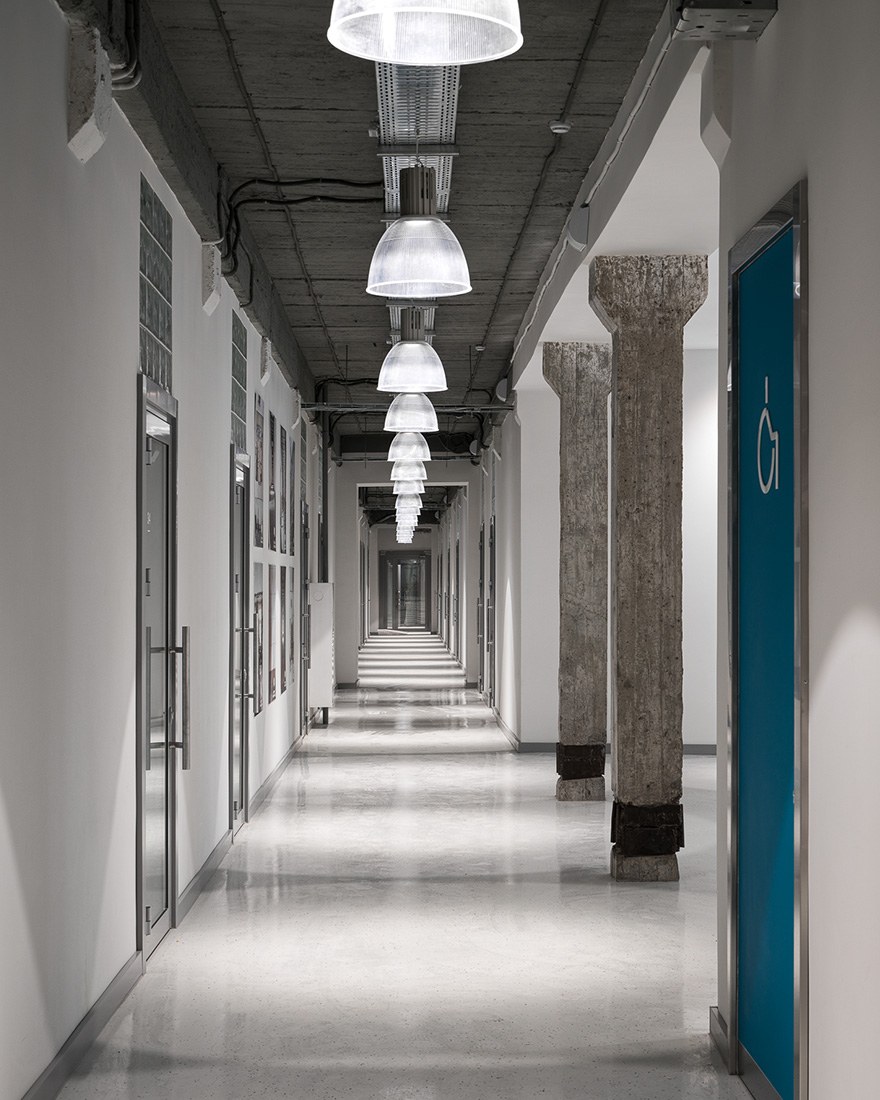 Мы адаптировали план к новым задачам: скорректировали планировку здания, расширили холл, добавили санузлы на этажах, комнату охраны, молельную и комнату матери и ребенка. Помещение с сохранившейся фреской стало столовой и настоящей достопримечательностью. Я определила свои любимые приемы и материалы из оригинальных интерьеров и использовала их в своем проекте: терраццо на полу, декоративные потолочные панели в коридорах, настенные шкафы из стеклянных блоков, отопительные решетки и даже цветную плитку со свиньями.