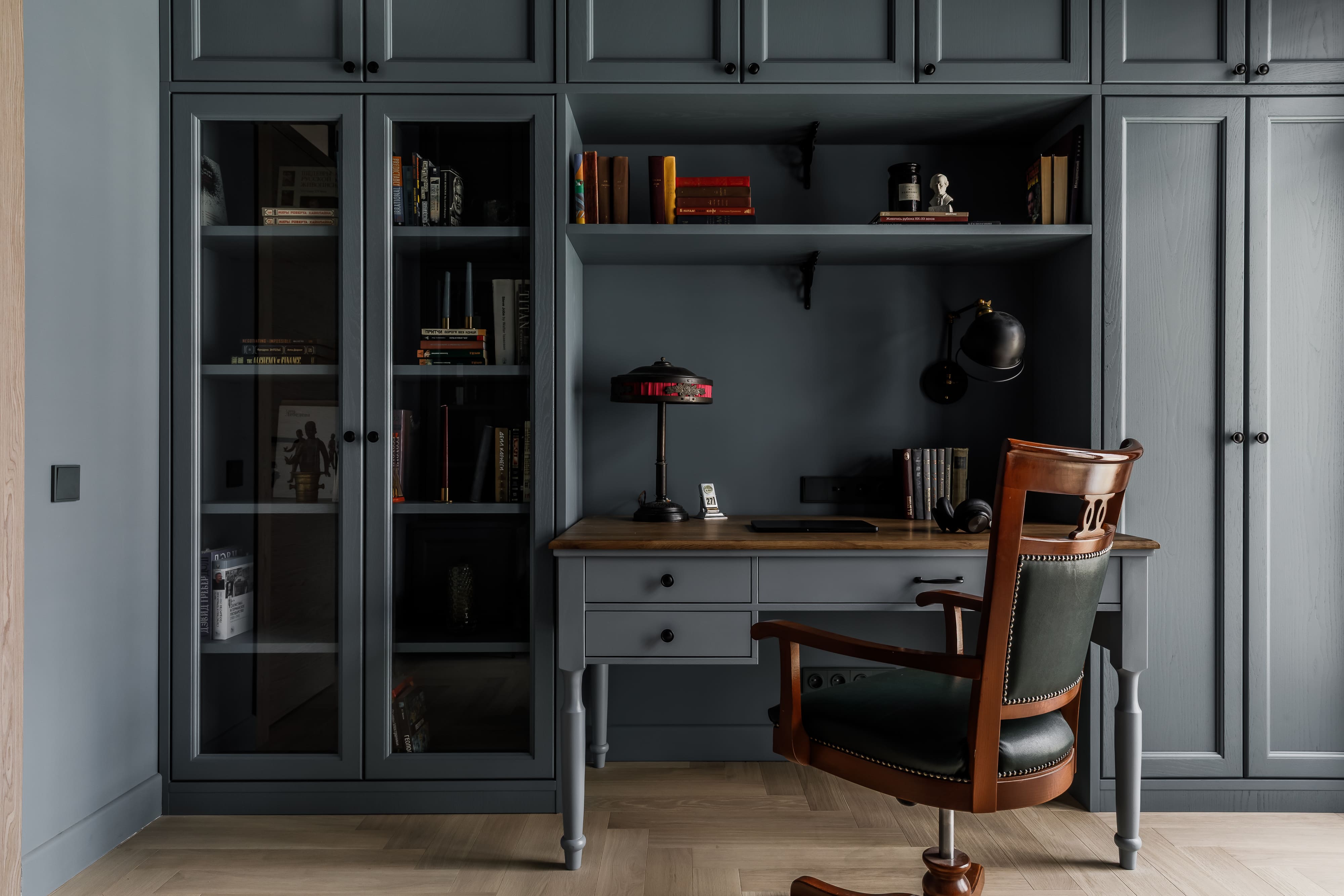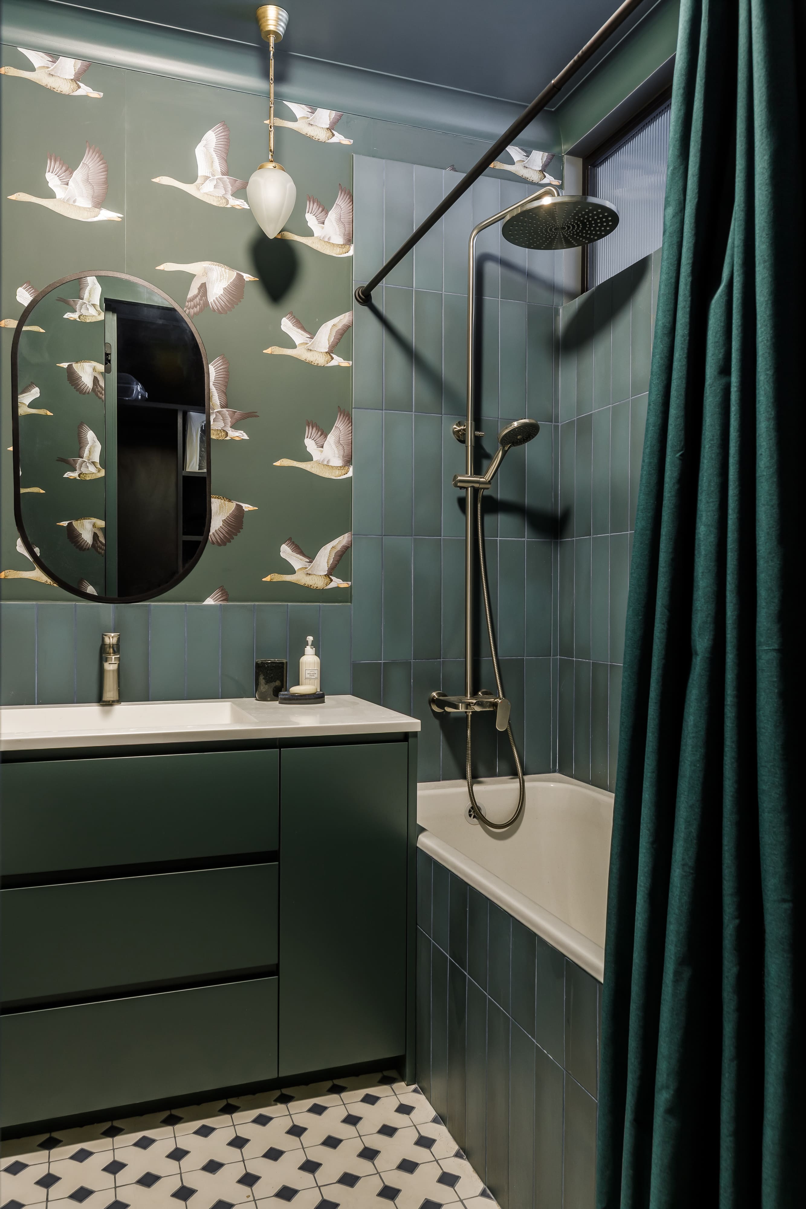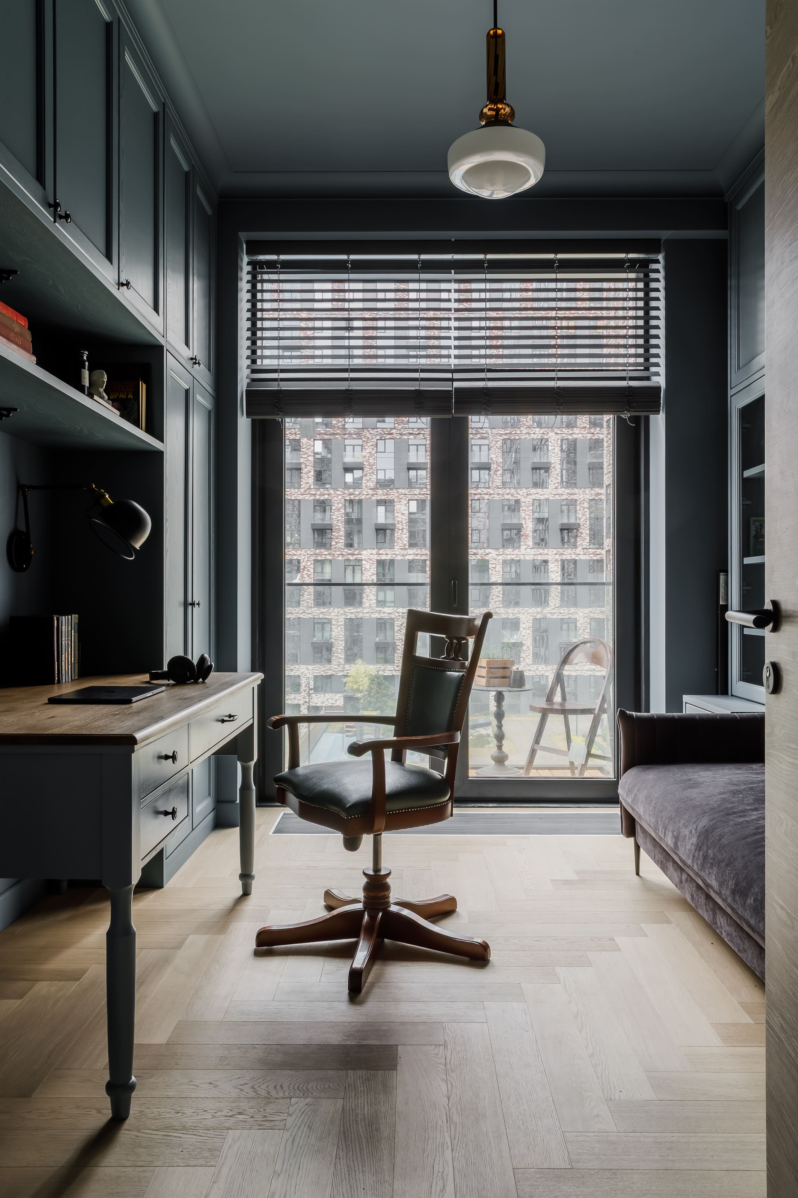 Основу интерьера сделали нейтральной: прихожую, кухню-гостиную, детскую и гостевой санузел выполнили в светлом, почти белом оттенке с зеленым подтоном. Главной особенностью стала спальня родителей, потолок которой был украшен орнаментом Уильяма Морриса. Мы также выбрали прозрачные обои для главной ванной комнаты; зона раковины подчеркнута летящими гусями на зеленом фоне. По желанию владельца весь офис, включая встроенную мебель, был выкрашен в приглушенный синий оттенок, создающий обволакивающий эффект.