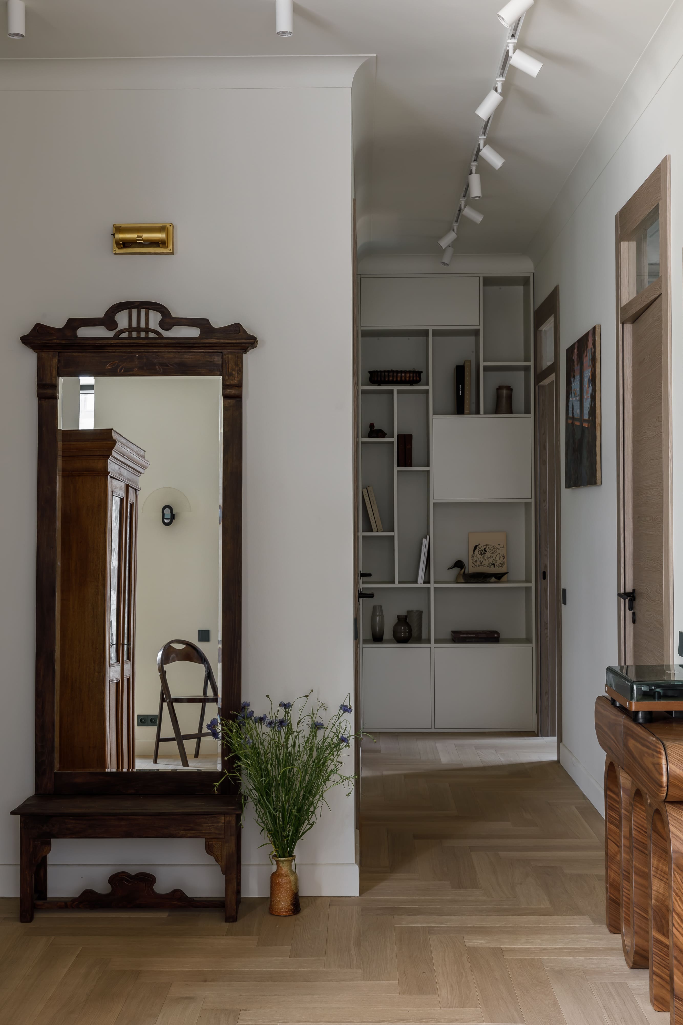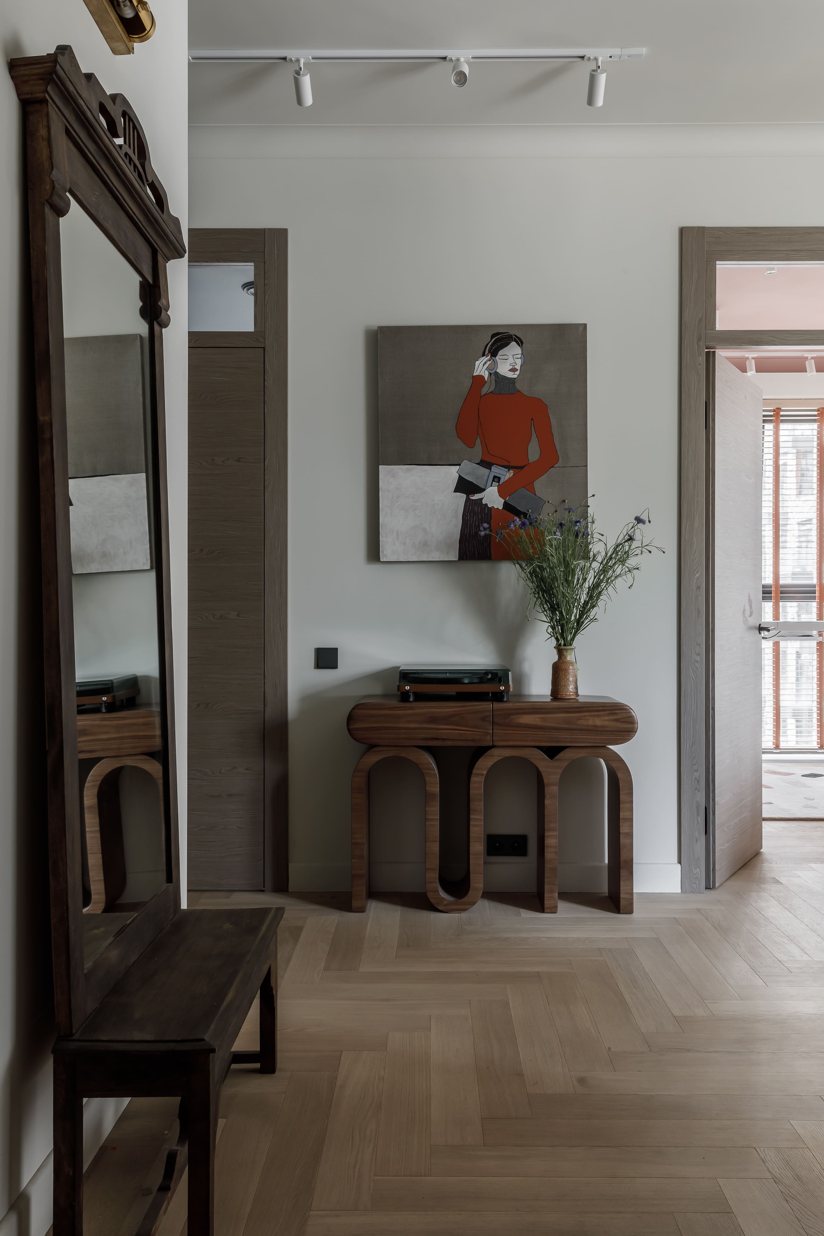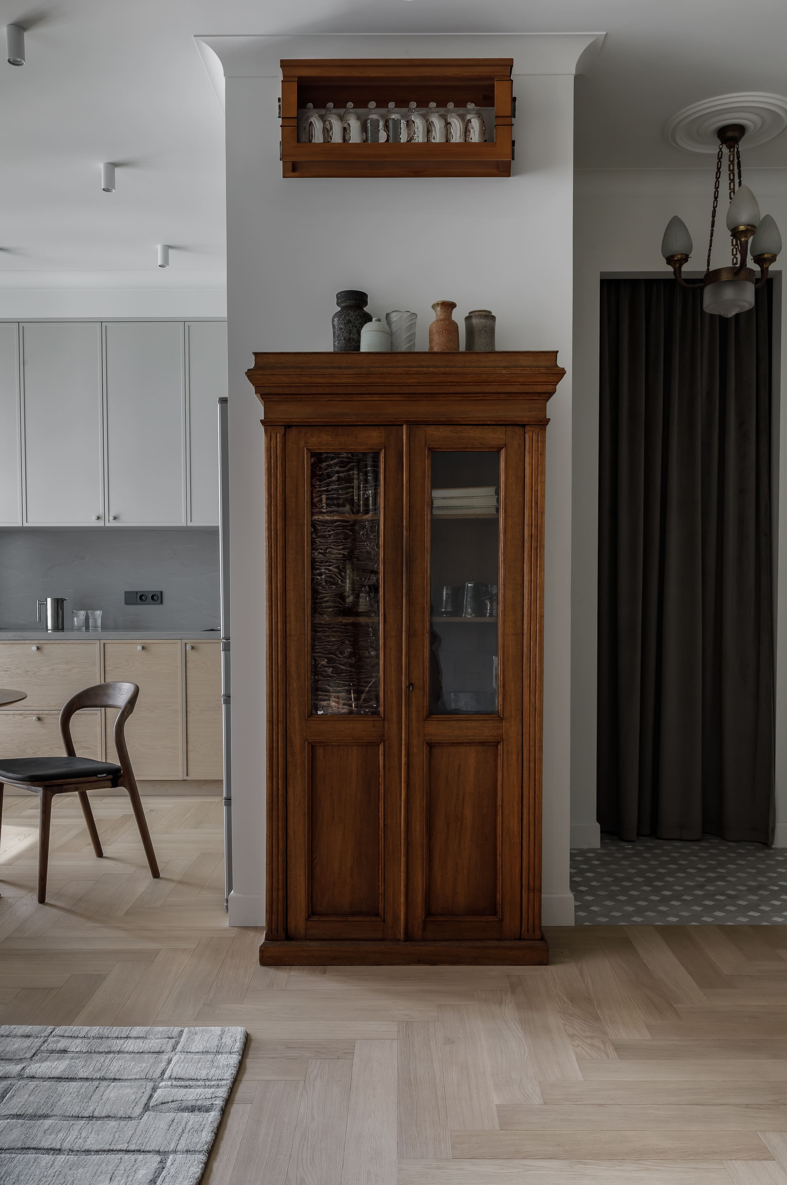 Сергей — потомственный банкир, а Анастасия — физик по образованию, но она интересуется историей искусств и с детства любит винтаж. Благодаря ей в квартире появились антикварные находки: письменный стол на изящных ножках на ножках, зеркало в массивной деревянной раме, туалетный столик, вращающееся кресло с резными деталями и большой немецкий шкаф, напомнивший хозяйке мебель в доме ее родителей в Калининграде.