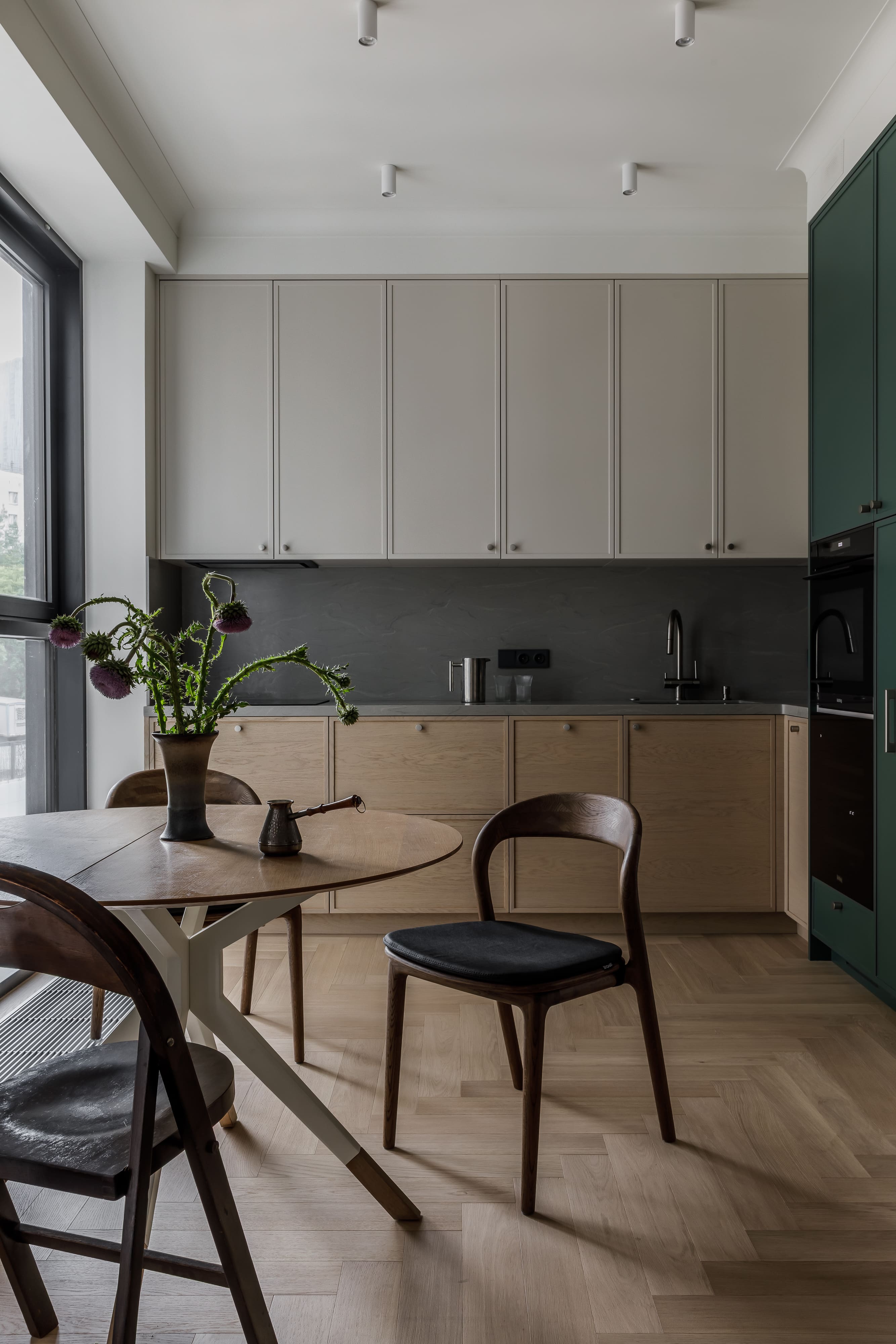 Современные интерьеры зачастую выходят за рамки определенного стиля и представляют собой эклектичное сочетание разных эпох и направлений. Эта квартира расположена в новом жилом комплексе «Уровень Причальный», вид во двор которого напоминает пейзаж из футуристического фильма. Однако дизайнеры Варвара Шалито и Валерия Нестеренко решили не углубляться в ультрасовременный минимализм и создали пространство с легкими отсылками к классике и винтажной коллекции.