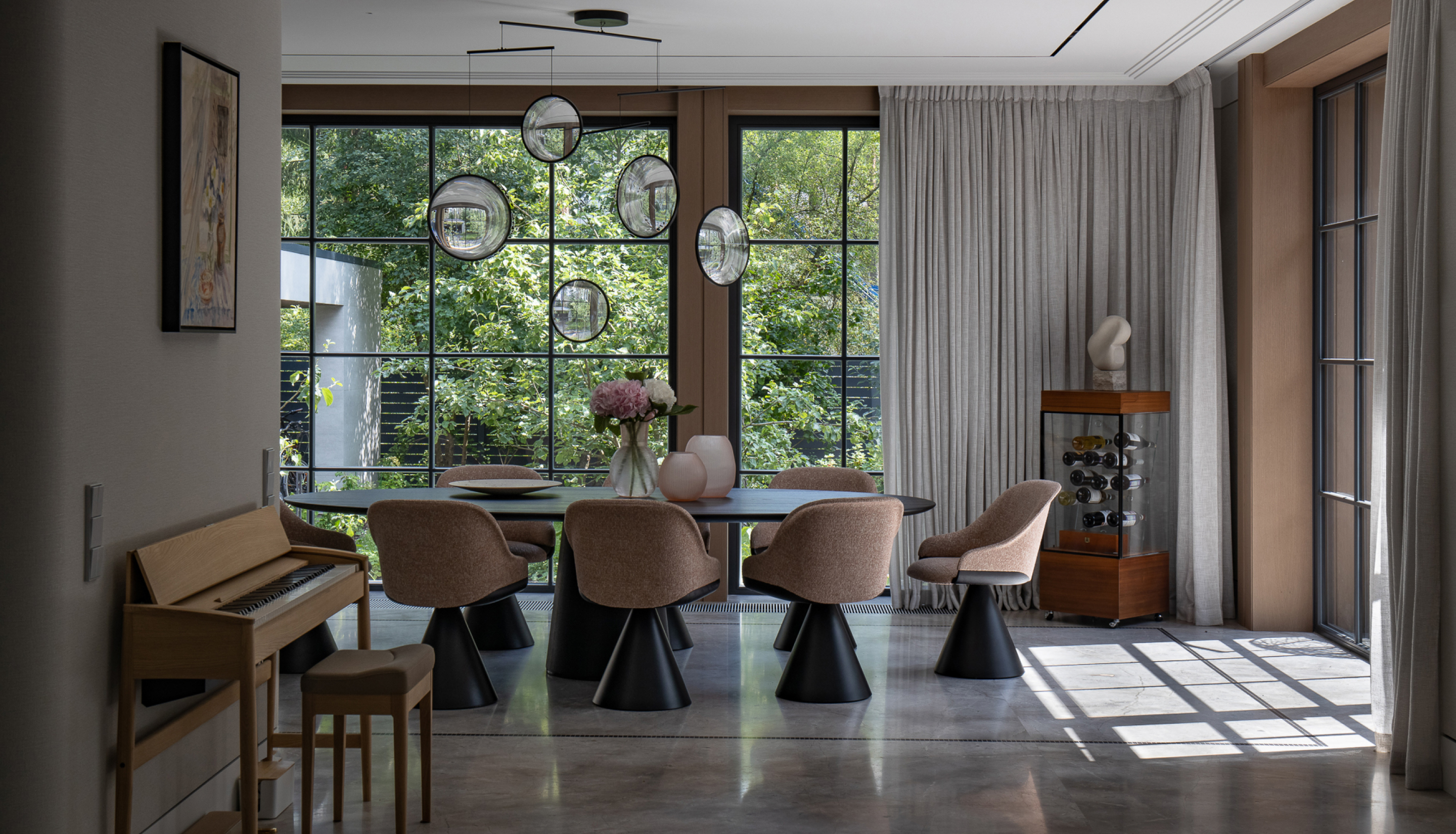 Слева от душевой было большое помещение для хранения вещей. Во встроенном шкафу стояла колонна стиральных и сушильных машин, бойлер, подсобное помещение и много места для хранения вещей. Чтобы кабинет максимально растворился в пространстве, его фасады покрасили в тон стен.