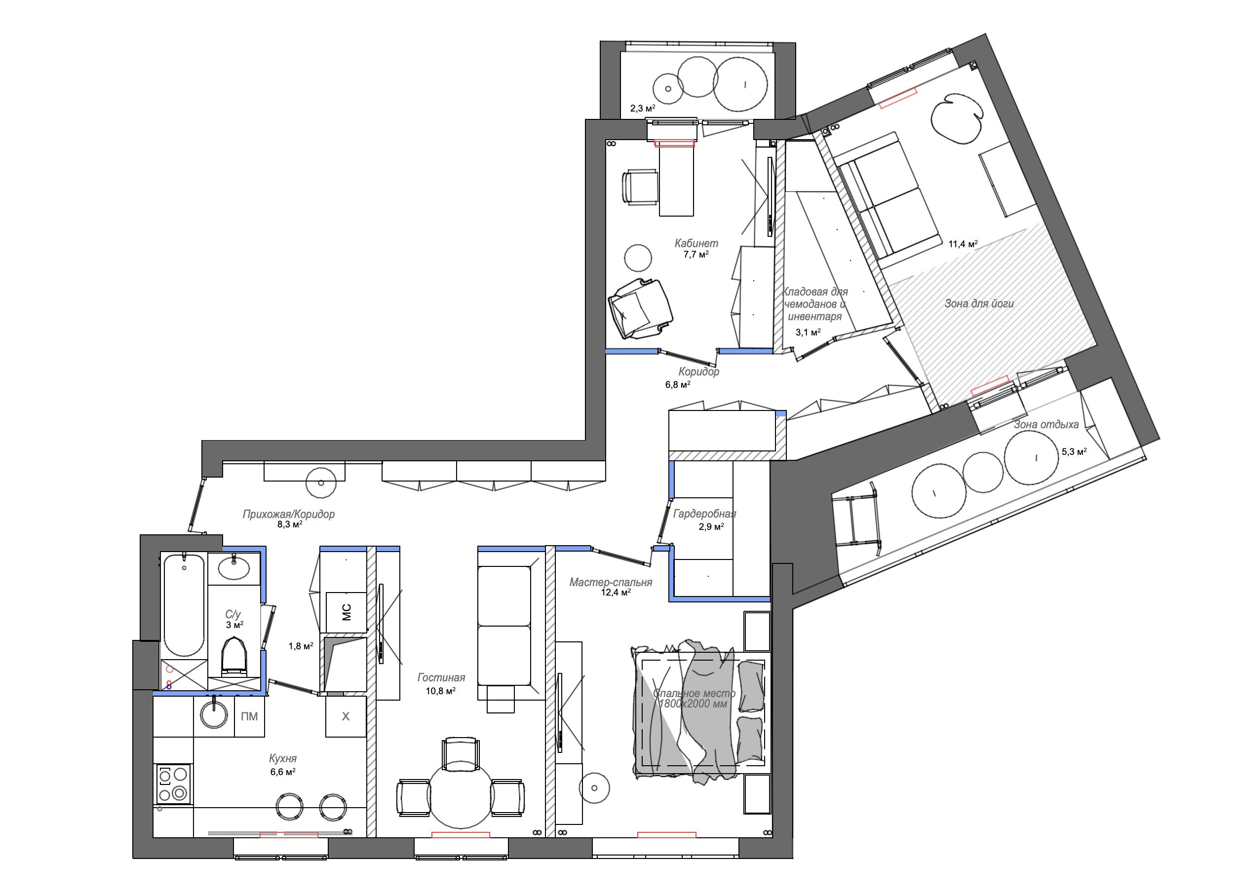 «Мы провели небольшой редизайн: убрали стену между прихожей и двумя комнатами. Одну из них переоборудовали в гостиную, а вторую — в кабинет со стеклянной перегородкой, которая добавила света в самую темную комнату квартиры. Мы сделали прихожую многофункциональной, разместив там большой шкаф и подсобное помещение, спрятанное за шторой. Отдельное помещение для хранения отведено для чемоданов и мототехники».