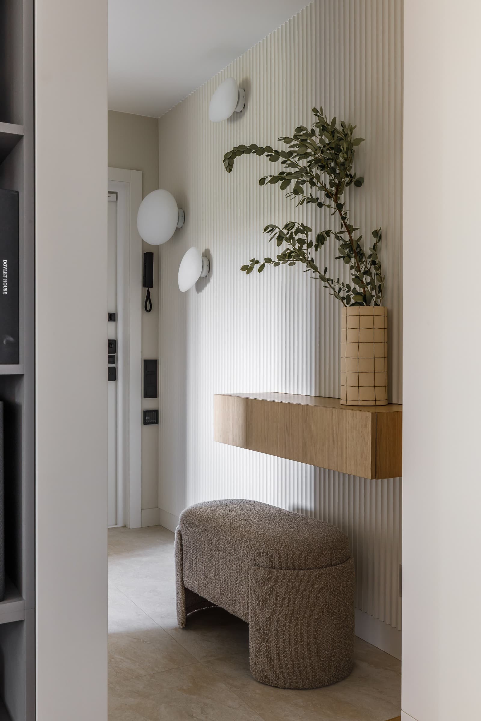 «Когда клиенты рассказали нам о своих пожеланиях, у меня сразу сложился образ их будущего дома: легкий, обволакивающий интерьер в южной атмосфере, но с тонко внесенным оттенком брутальности – чтобы он легко читался, но не утяжелял пространство. Важно было создать функциональную и гармоничную квартиру, где можно вместе завтракать, принимать гостей, работать и проводить онлайн-конференции, но при этом обойтись без глобальной перепланировки, требующей длительных одобрение.»