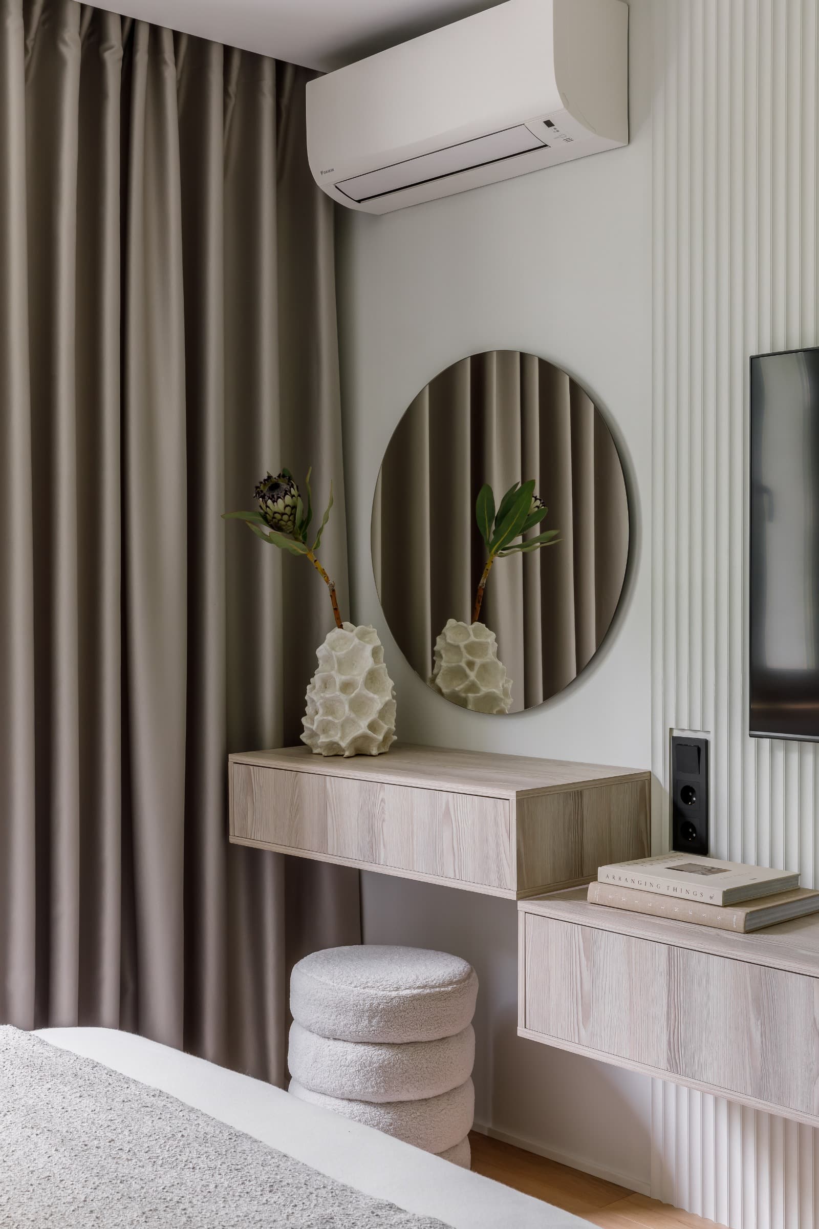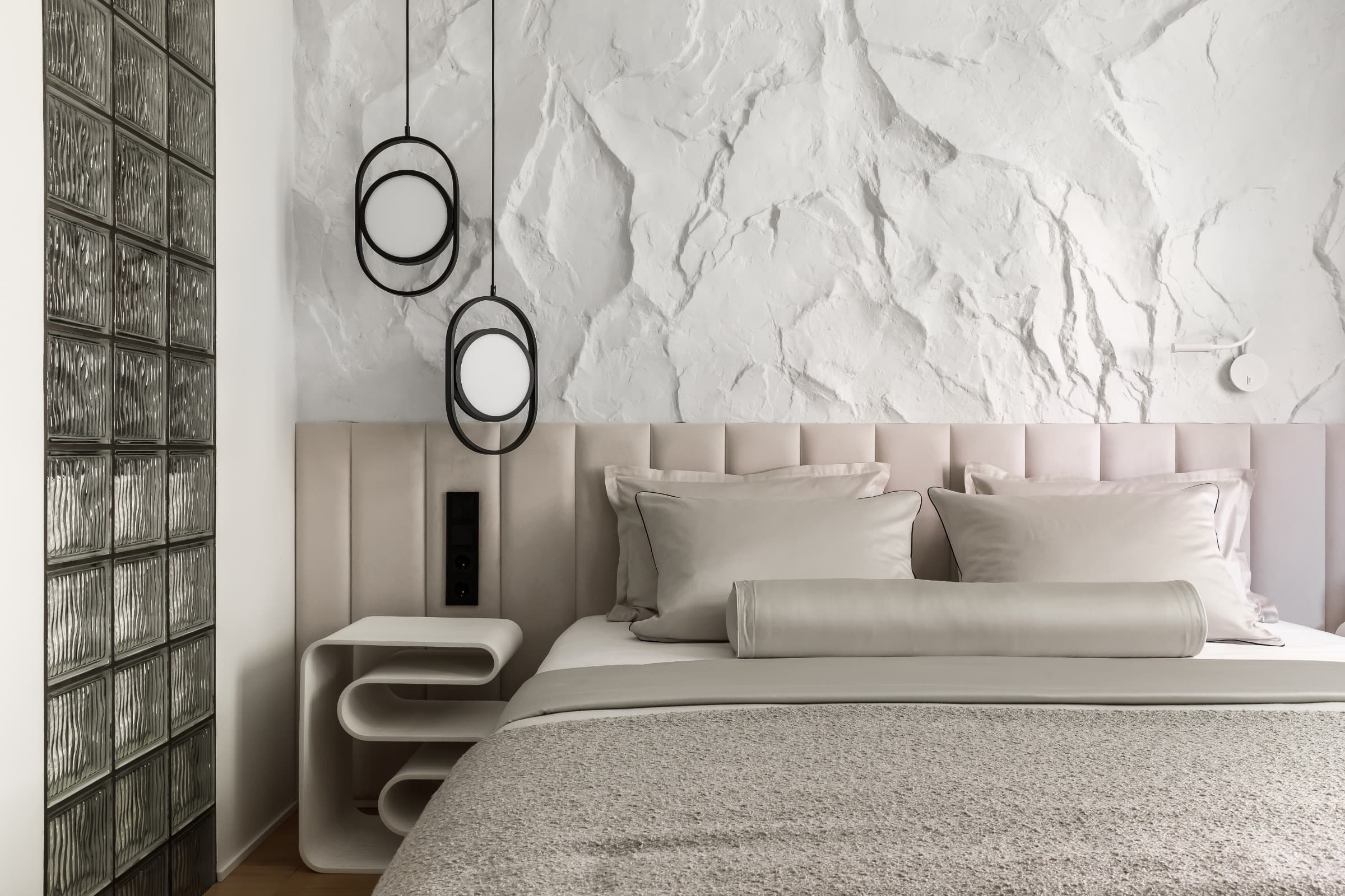 «Поскольку дом был построен в советское время, мне хотелось сохранить внутри дух того времени, поэтому я использовал стеклоблоки, которые лаконично вписываются в эстетику мягкого минимализма. Удачным решением стало сочетание грубых фактур с мягкими тканями, панелями из шпона и теплыми тонами. Например, декоративный «камень» в спальне не кажется холодным за счет окружающих теплых материалов. В гостиной и кухне светлая незавершенная штукатурка – это светлая незавершенная штукатурка. использован. сбалансирован деревом и текстилем, а густая зелень за окном дополняет эту природную палитру».