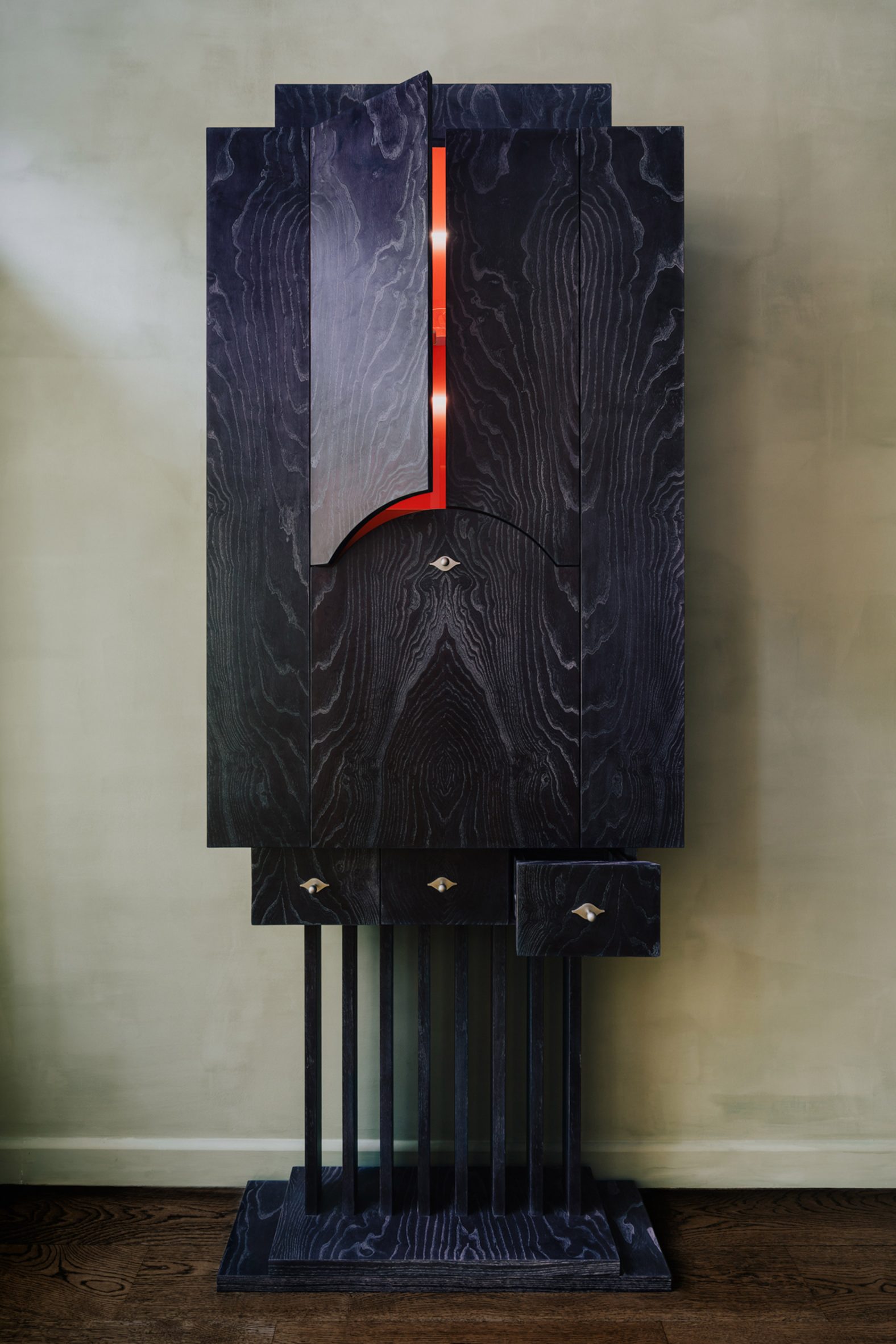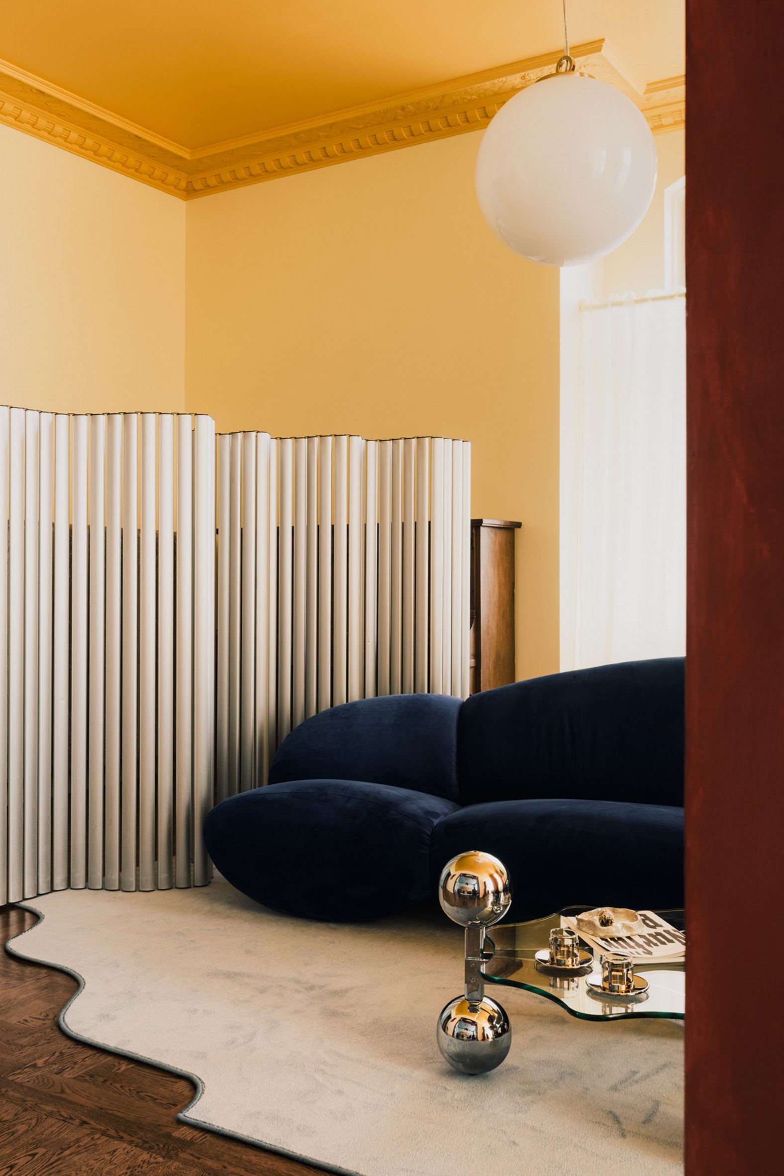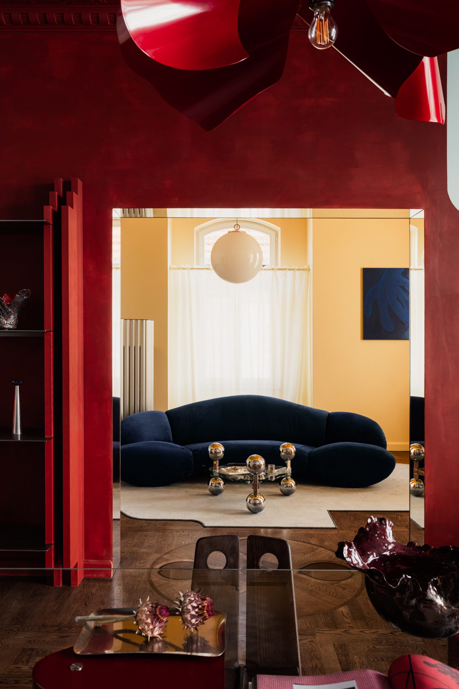 В центре гостиной стоит бархатный темно-синий диван и массивный металлический стол, а стены выкрашены в модный желтый оттенок. Большая часть мебели в квартире была разработана COI: от красочных полок, столов и ламп до изящных аксессуаров, в том числе забавного украшения стен в форме глаз. Остальная мебель в квартире – винтажные предметы 1960-х и 1970-х годов – была выбрана так, чтобы «естественно сочетаться с авторскими решениями». «Мне нравится этот микс», — добавляет дизайнер. «Он привносит в интерьер ощущение вневременной жизни. Шелк, бархат и плюш поглощают звук и свет, создавая ощущение спокойствия, а стекло добавляет уязвимости и отражает свет. Вместе эти материалы создают тонкий баланс между структурой и мягкостью, между контролем и свободой».