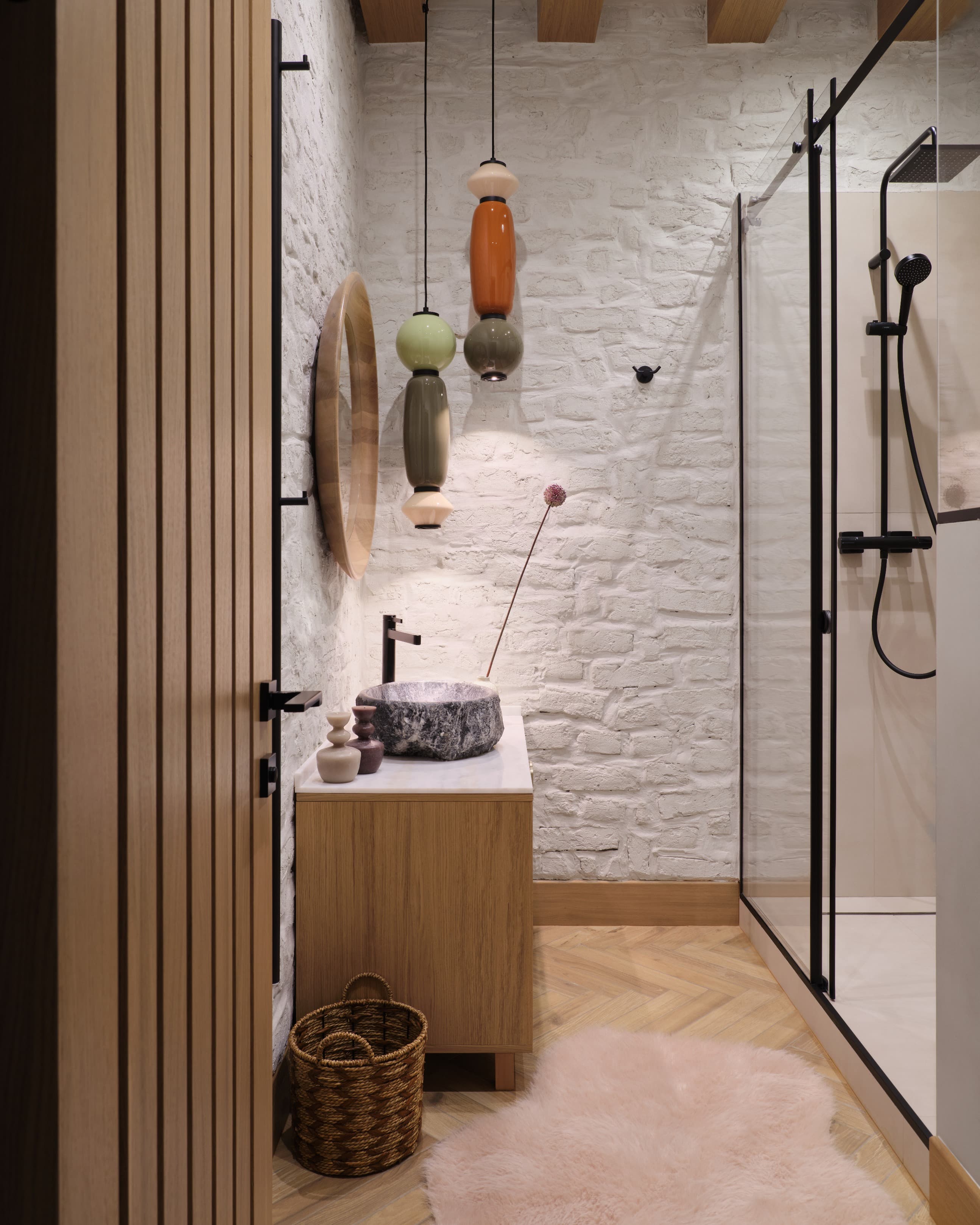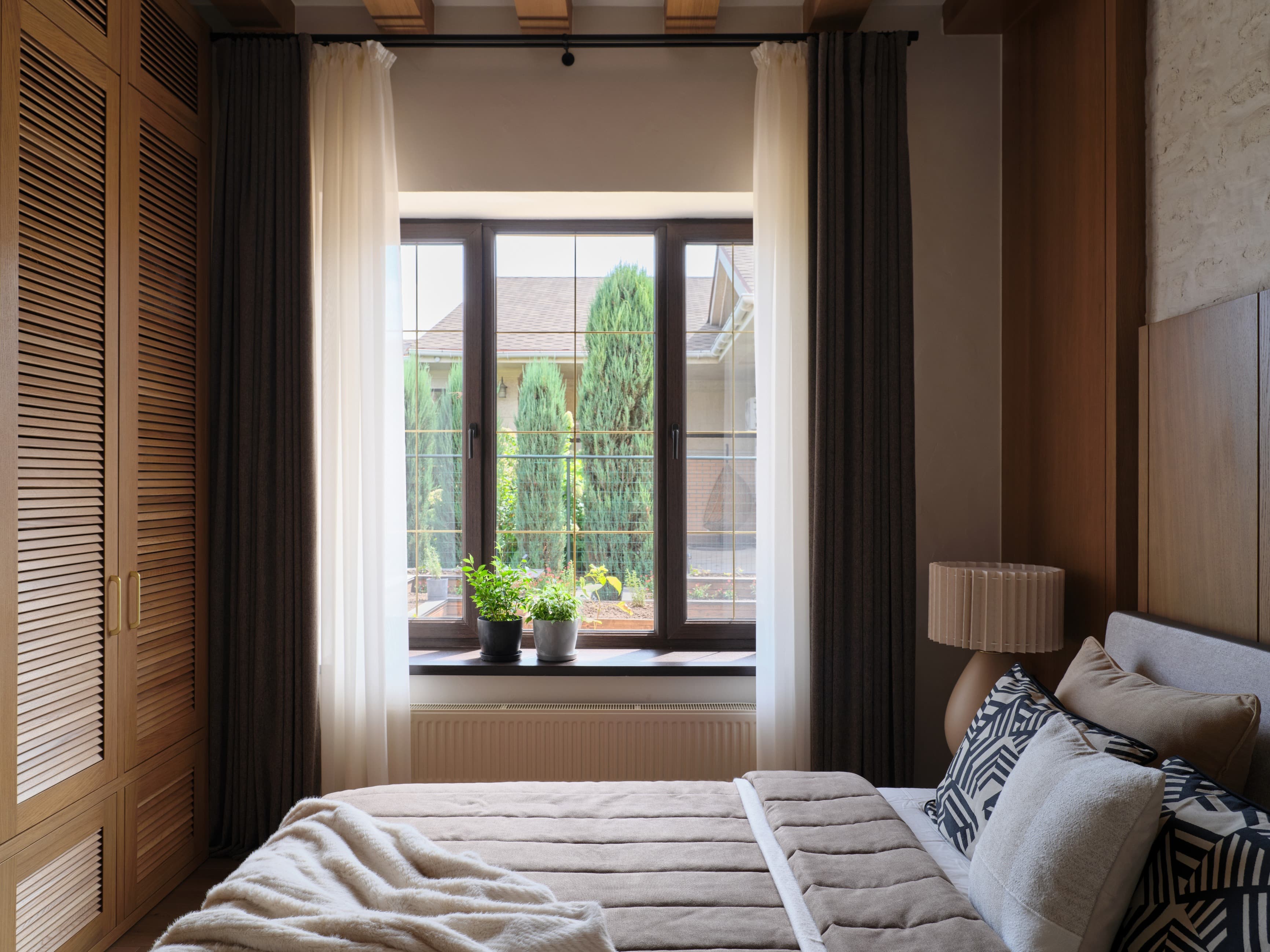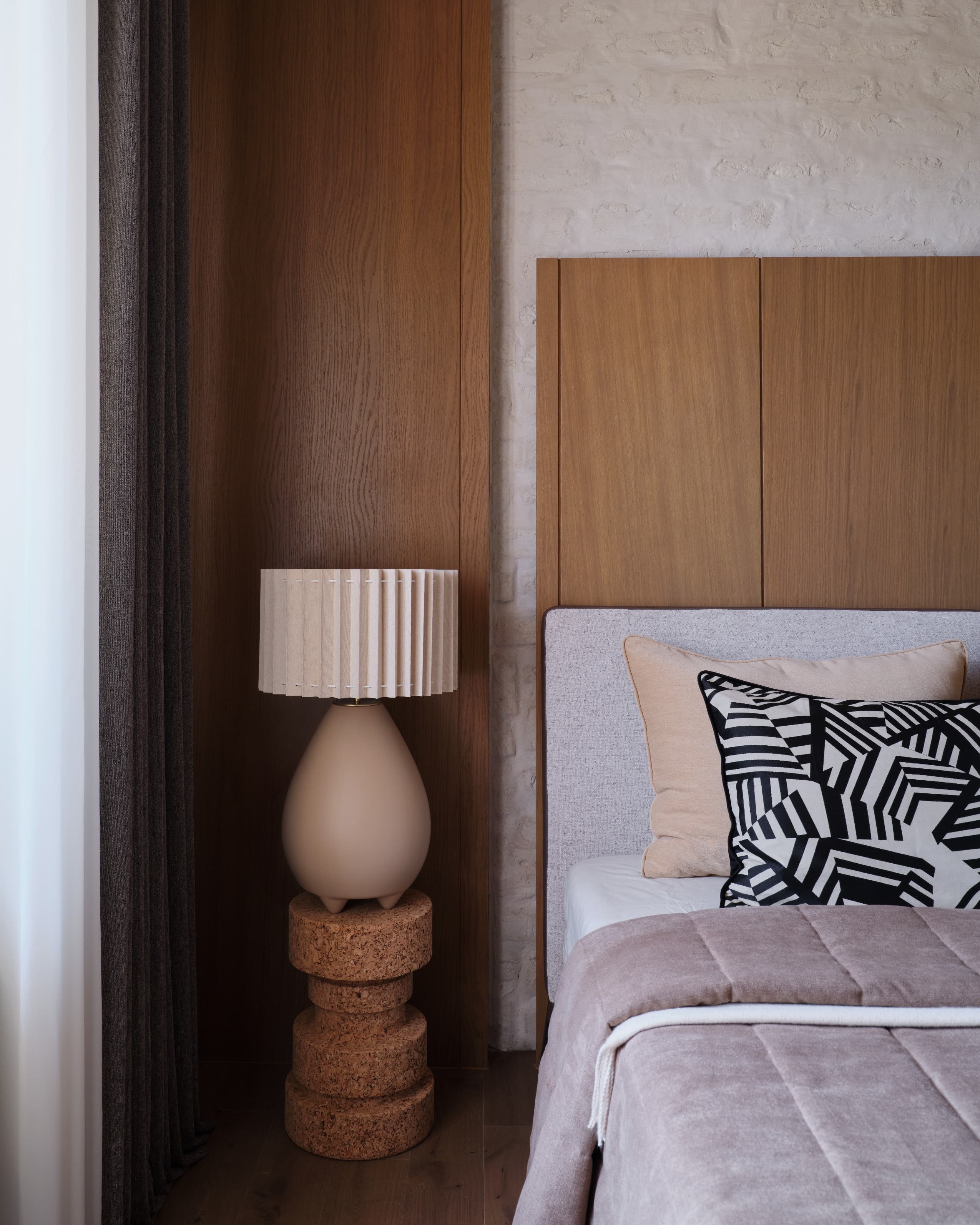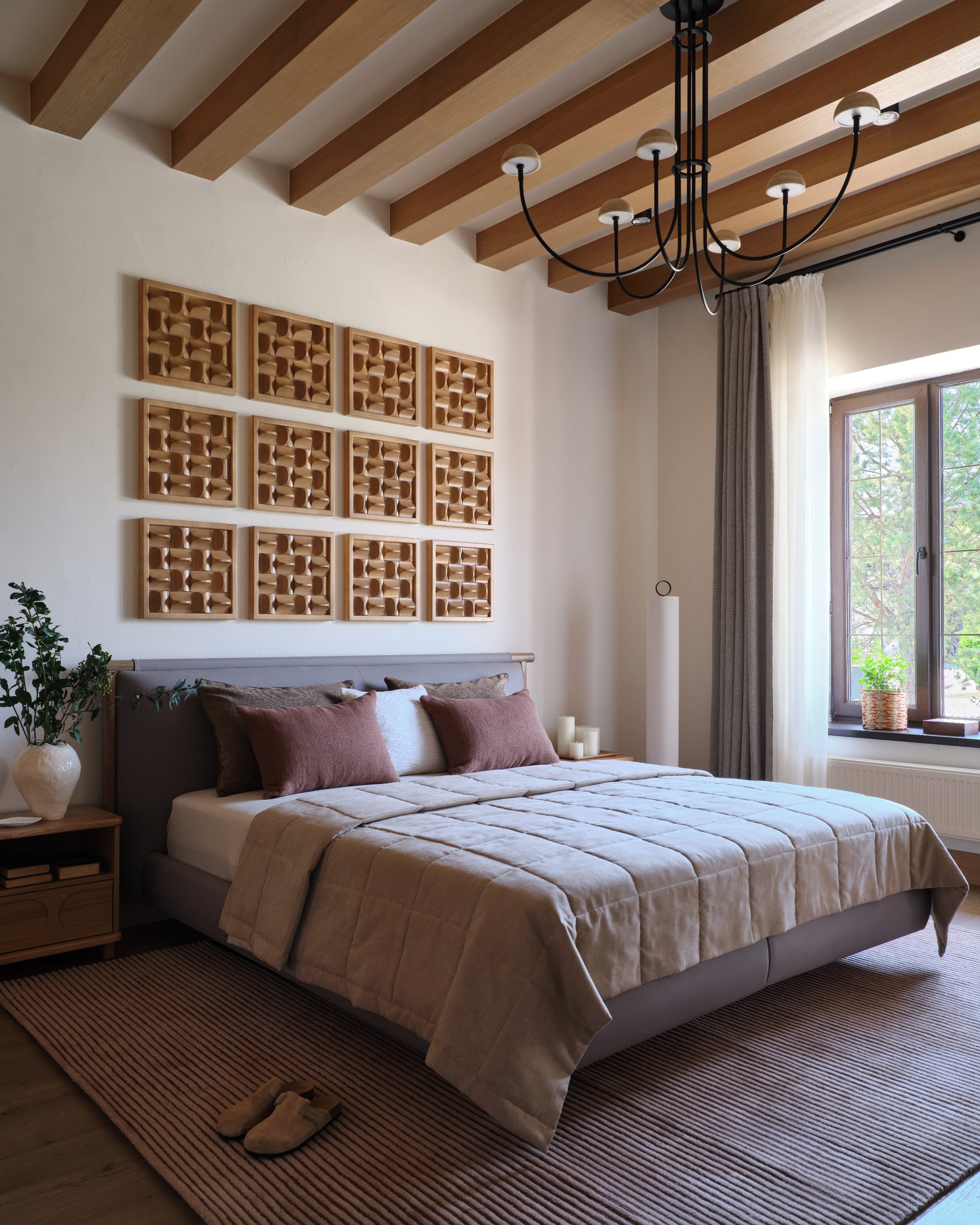 «Атмосферу спальни определяет потолок с выступающими деревянными балками. Этот прием не только визуально приподнимает пространство, отсылая к эстетике шале, но и добавляет ему архитектурной глубины. Центральным элементом композиции стала выразительная инсталляция модульных деревянных панелей над изголовьем кровати. Ритмичный рисунок привносит в интерьер динамичность и тактильность. В одной из ванных комнат находится арт-объект в виде подвесного светильника с разноцветными шторами и раковиной из грубого камня. что придает пространству богемный шарм».