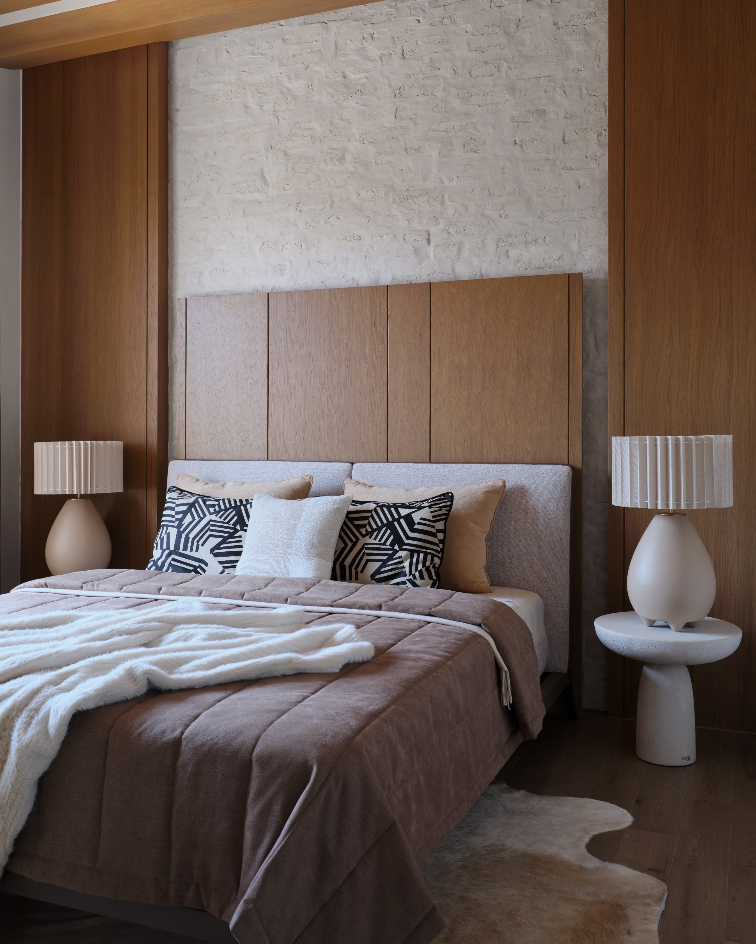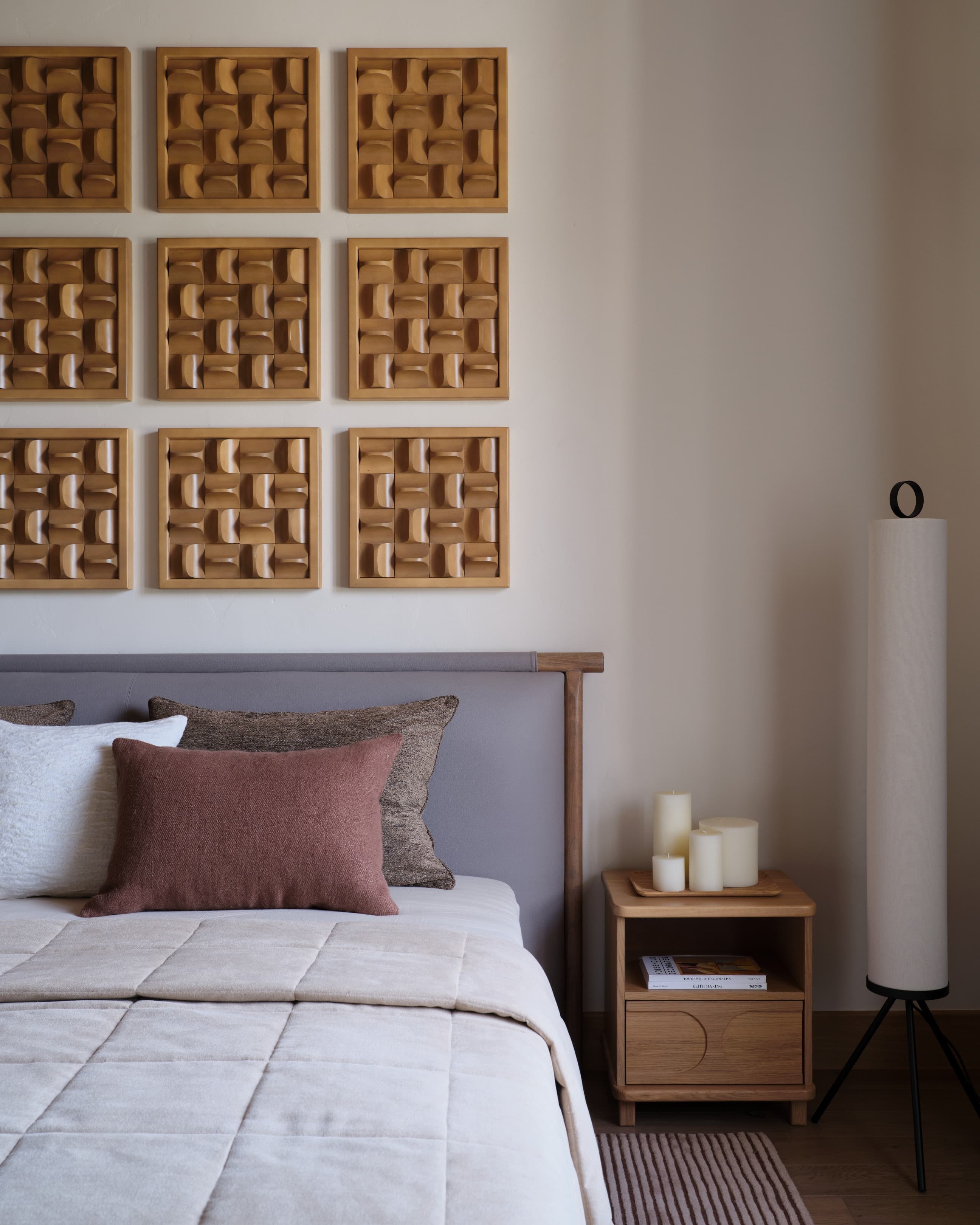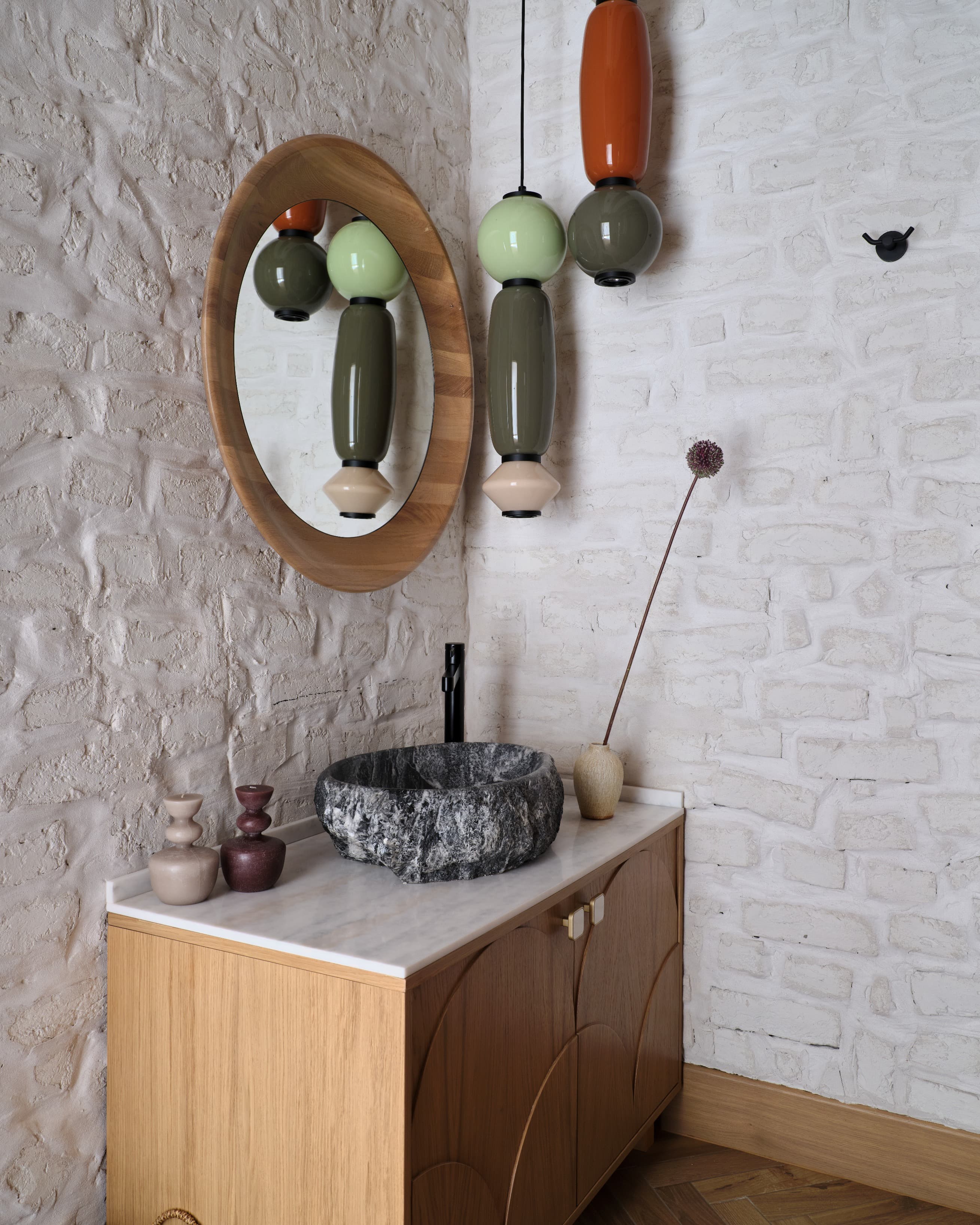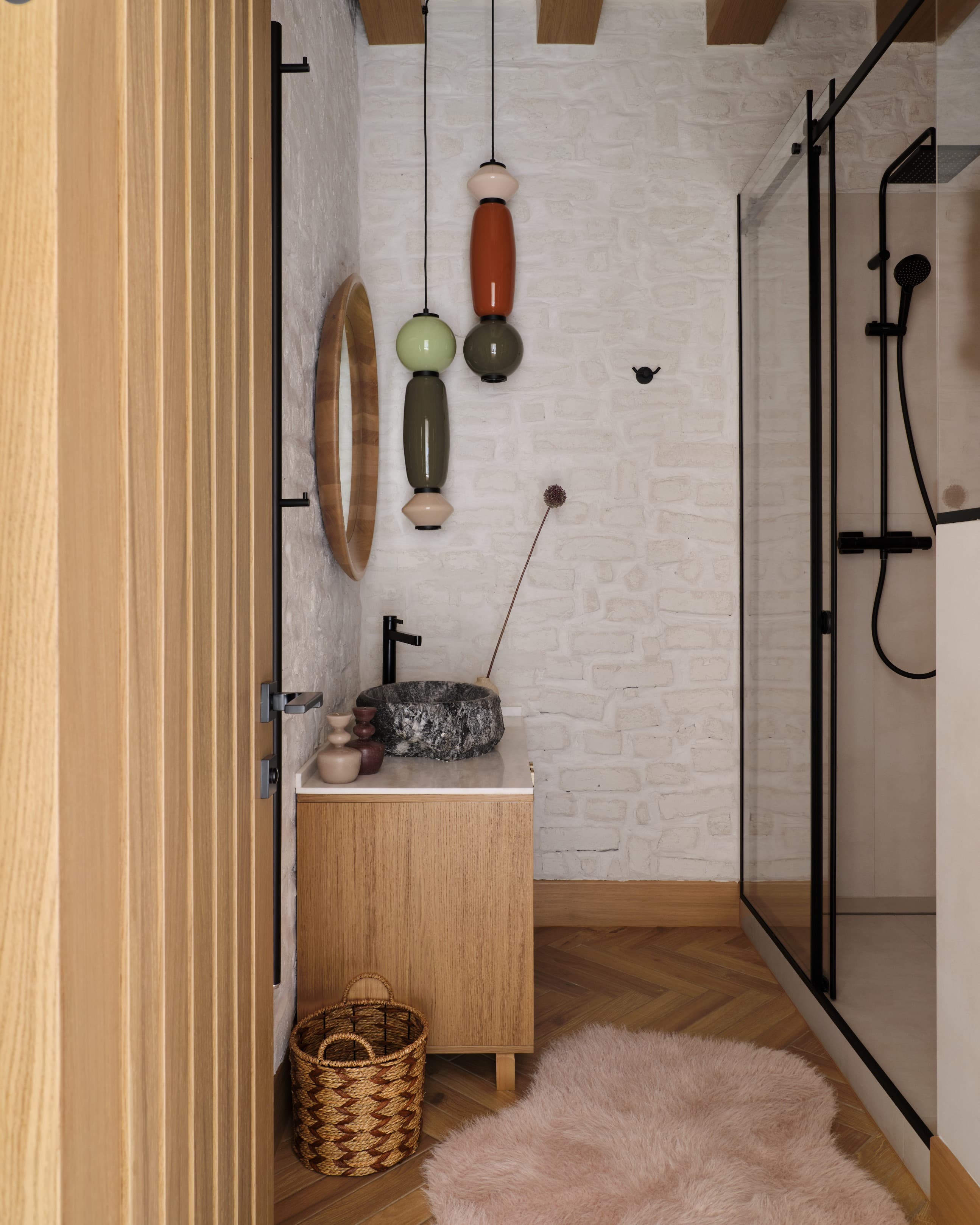 «Атмосферу спальни определяет потолок с выступающими деревянными балками. Этот прием не только визуально приподнимает пространство, отсылая к эстетике шале, но и добавляет ему архитектурной глубины. Центральным элементом композиции стала выразительная инсталляция модульных деревянных панелей над изголовьем кровати. Ритмичный рисунок привносит в интерьер динамичность и тактильность. В одной из ванных комнат находится арт-объект в виде подвесного светильника с разноцветными шторами и раковиной из грубого камня. что придает пространству богемный шарм».