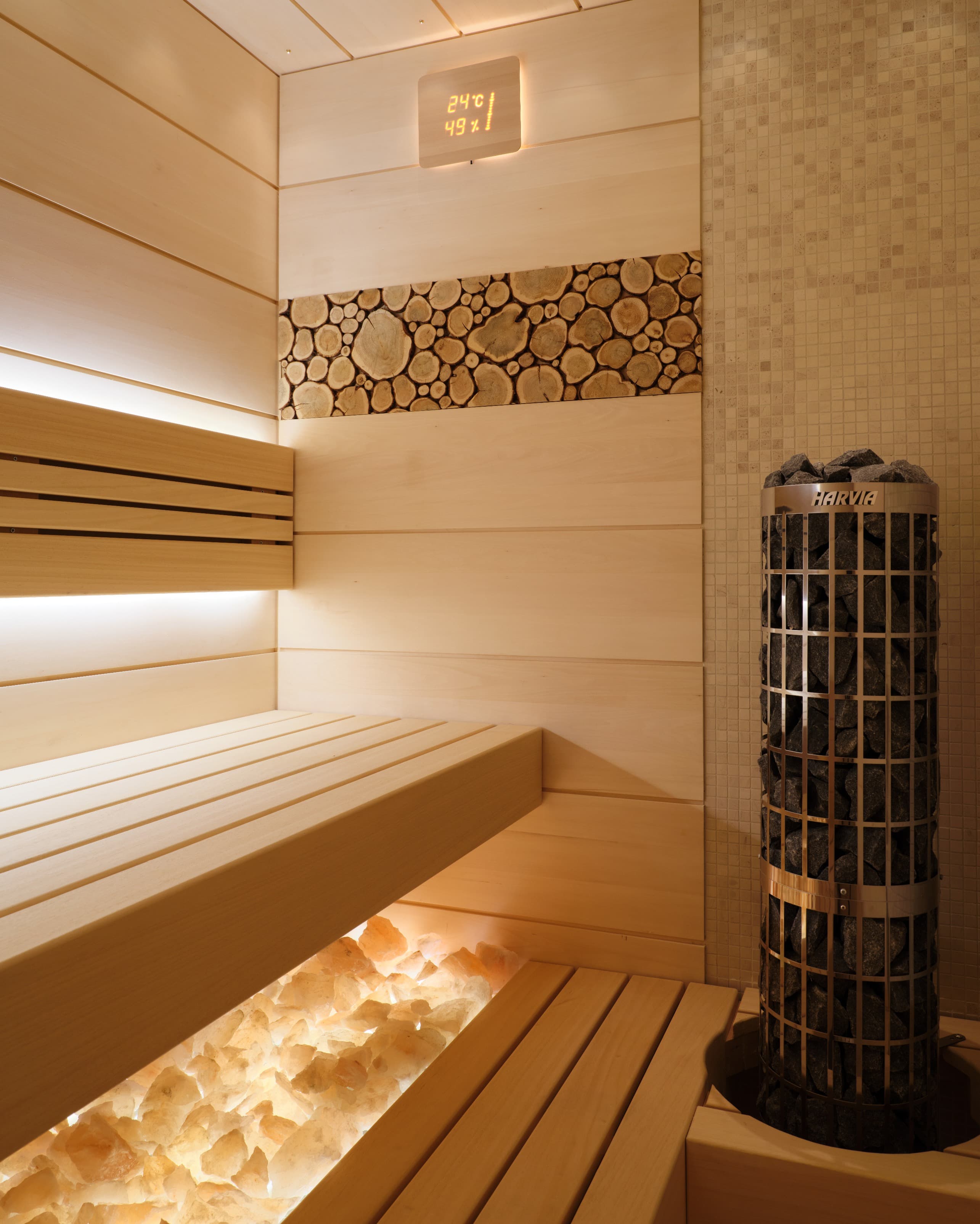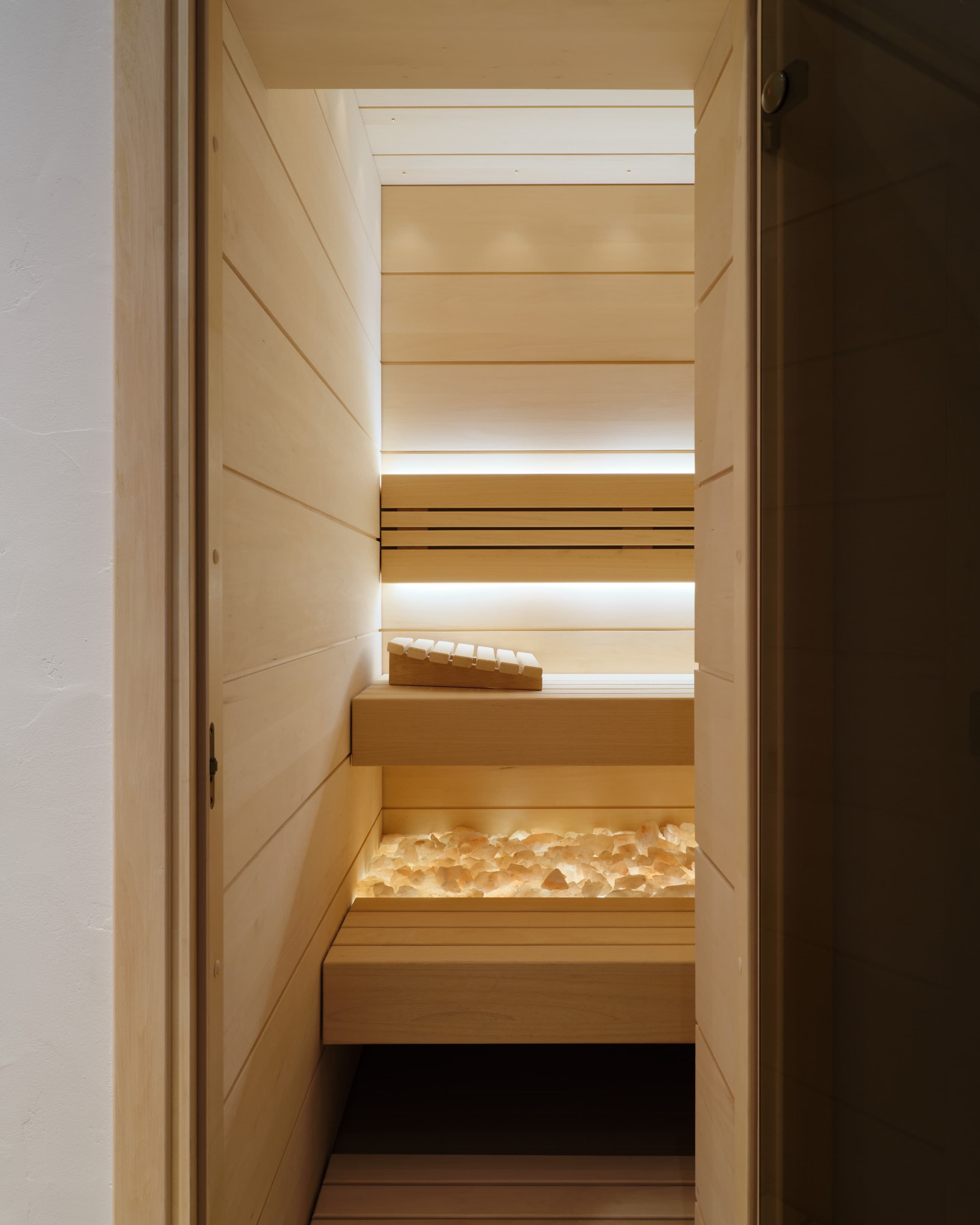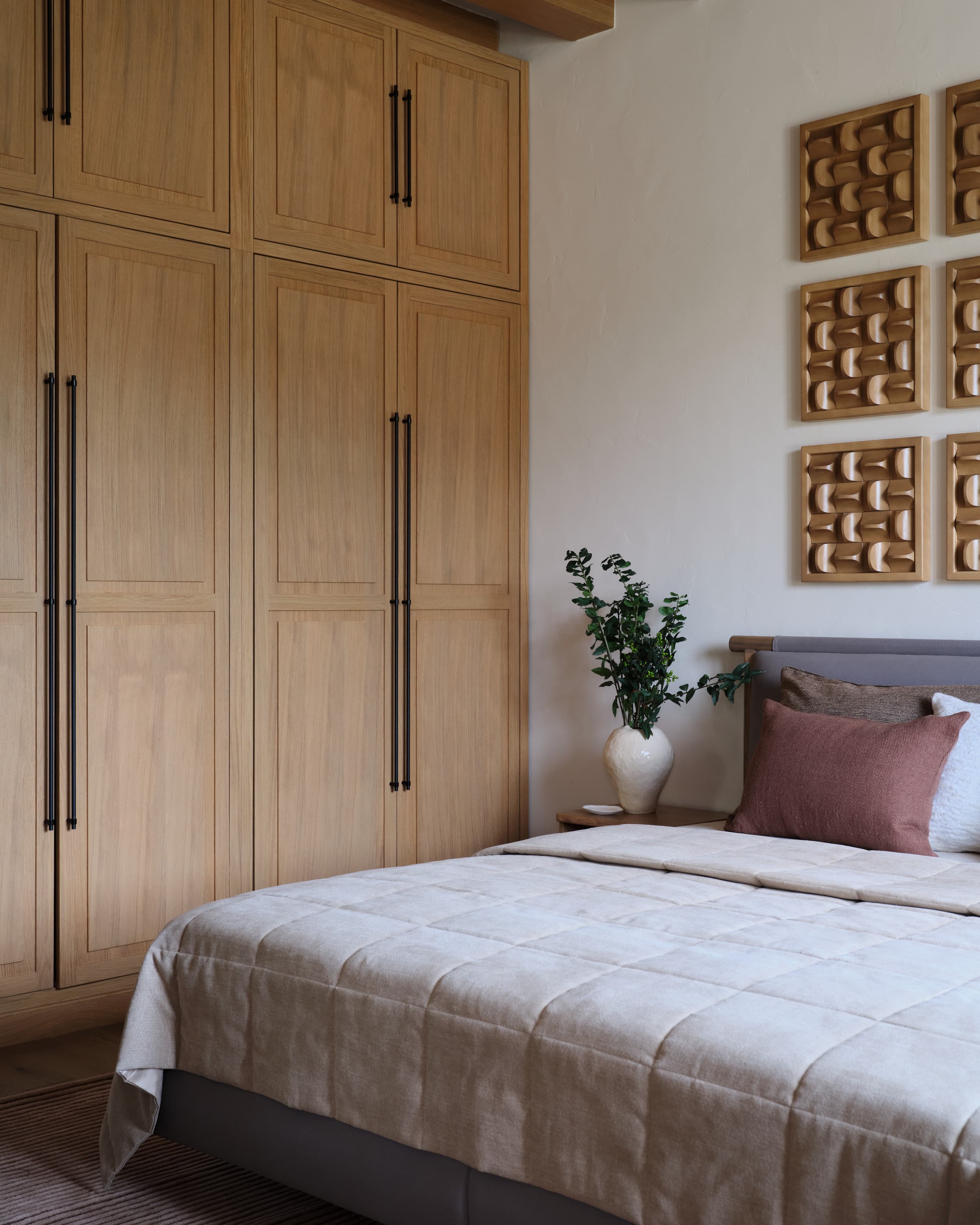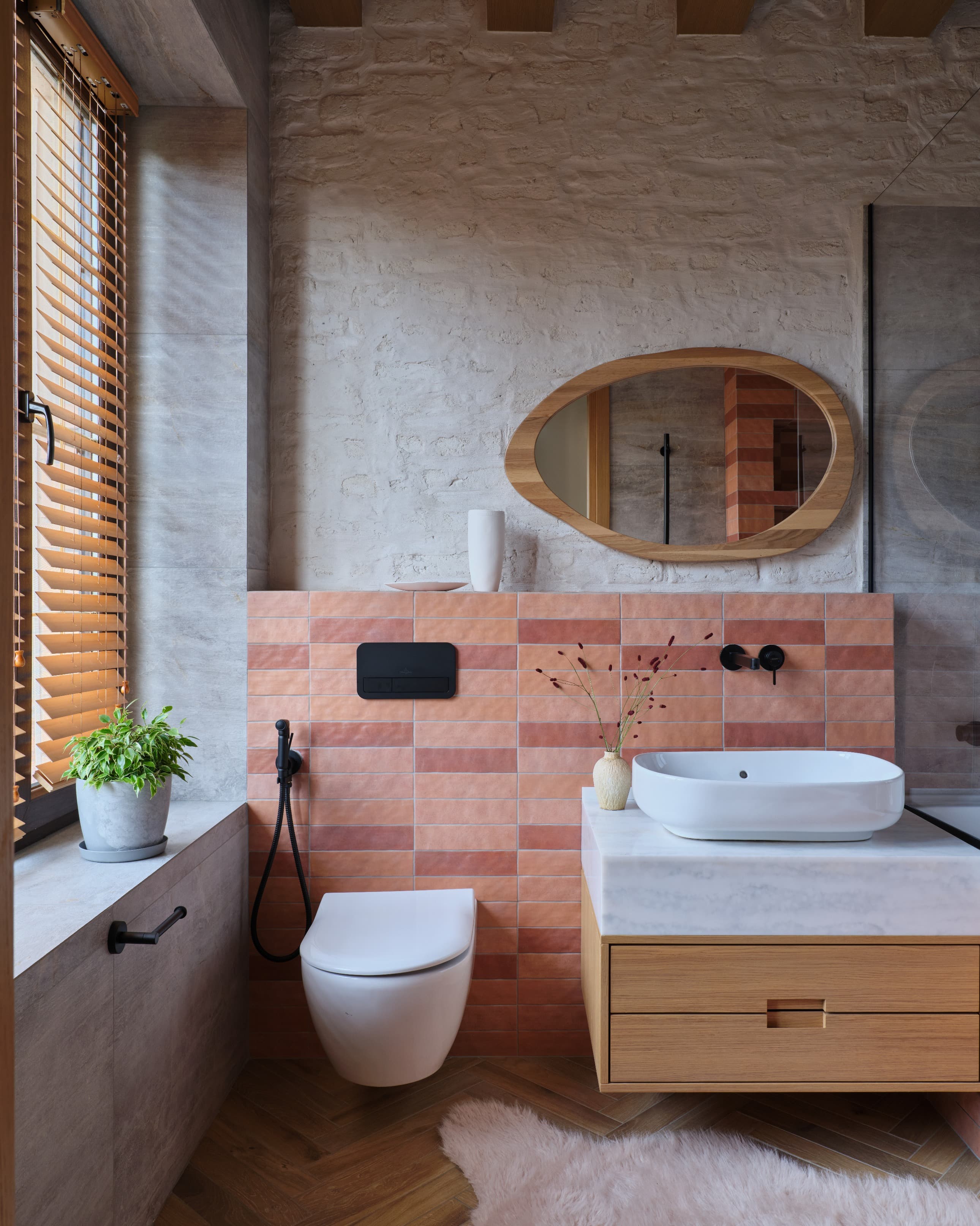 «Атмосферу спальни определяет потолок с выступающими деревянными балками. Этот прием не только визуально приподнимает пространство, отсылая к эстетике шале, но и добавляет ему архитектурной глубины. Центральным элементом композиции стала выразительная инсталляция модульных деревянных панелей над изголовьем кровати. Ритмичный рисунок привносит в интерьер динамичность и тактильность. В одной из ванных комнат находится арт-объект в виде подвесного светильника с разноцветными шторами и раковиной из грубого камня. что придает пространству богемный шарм».