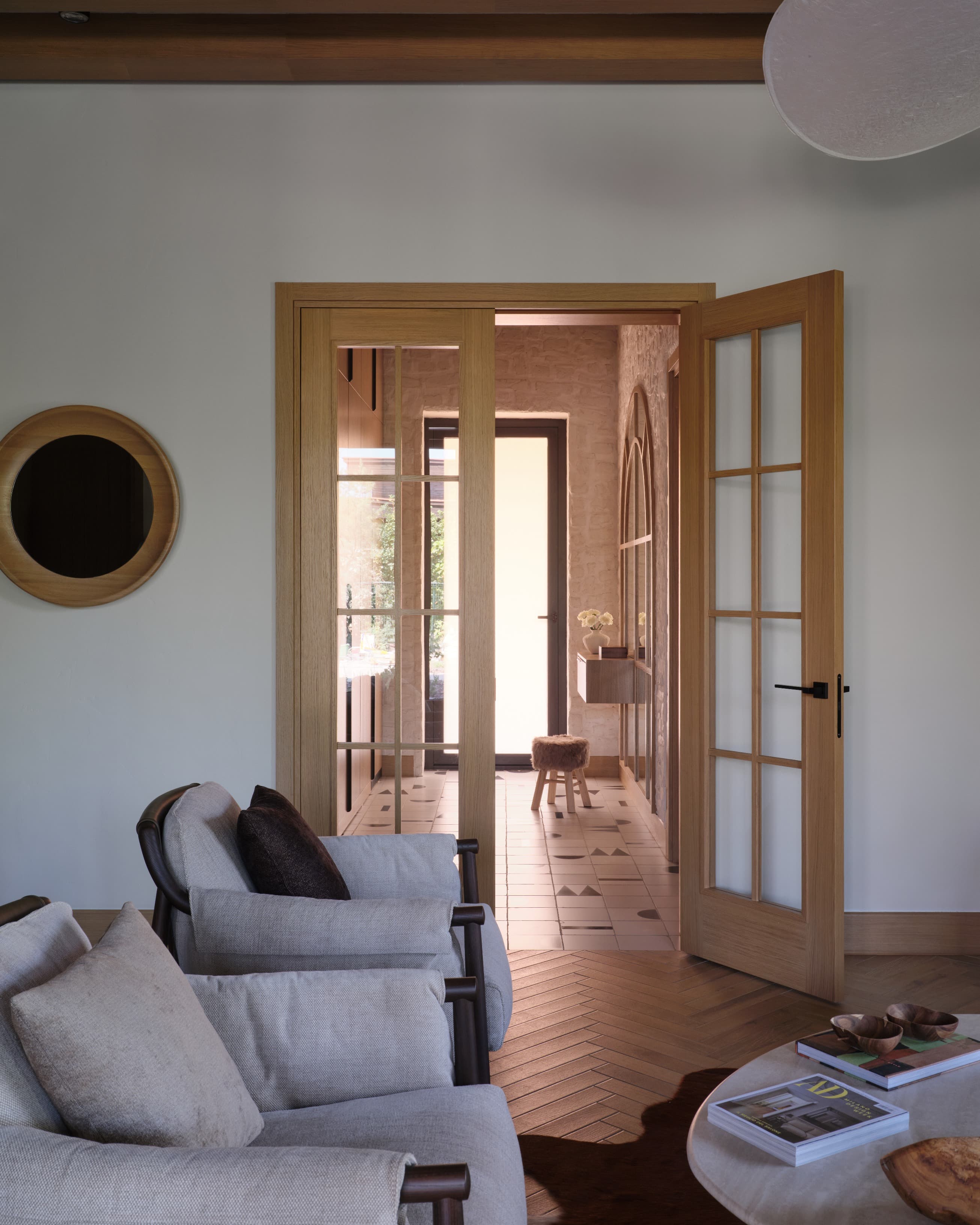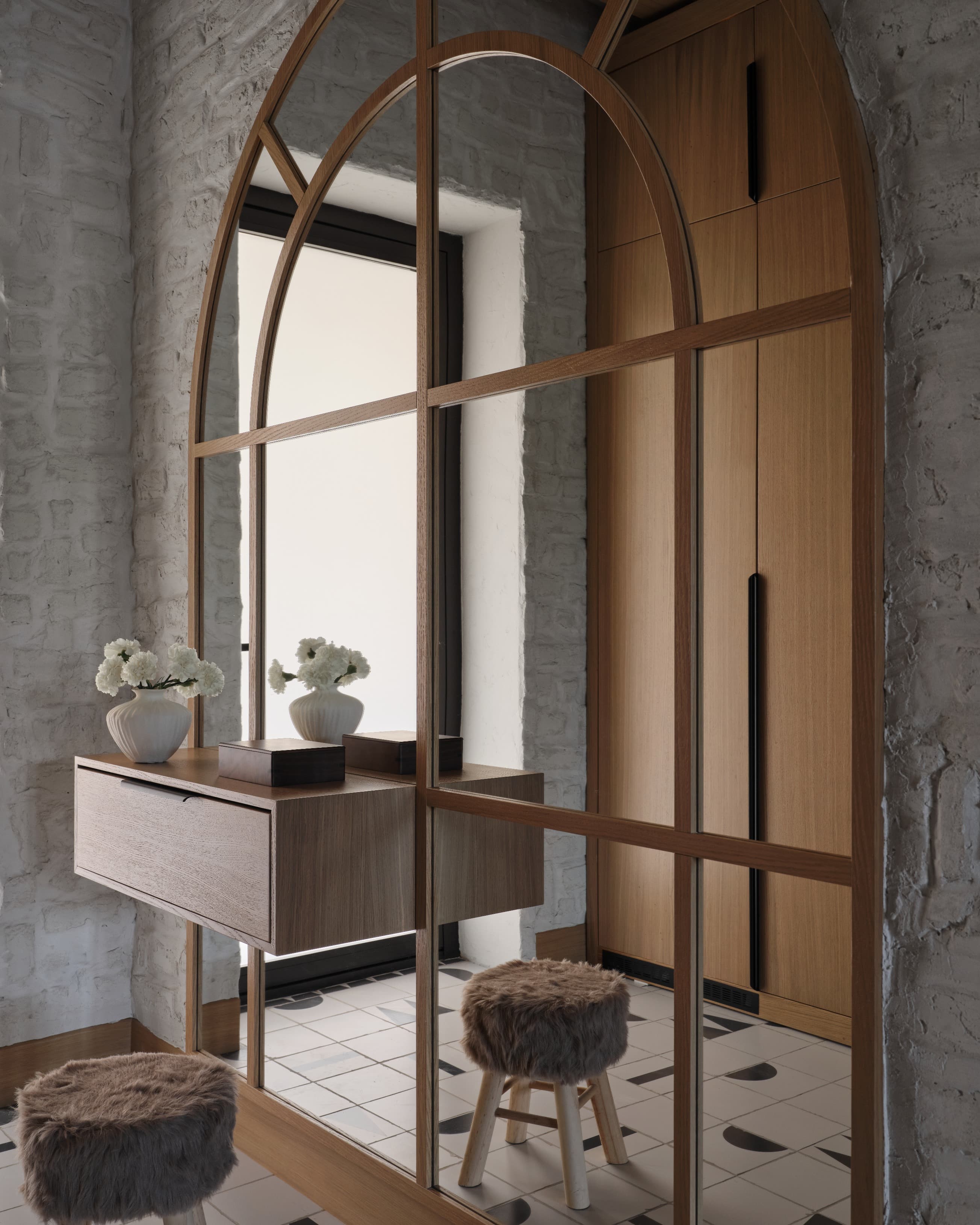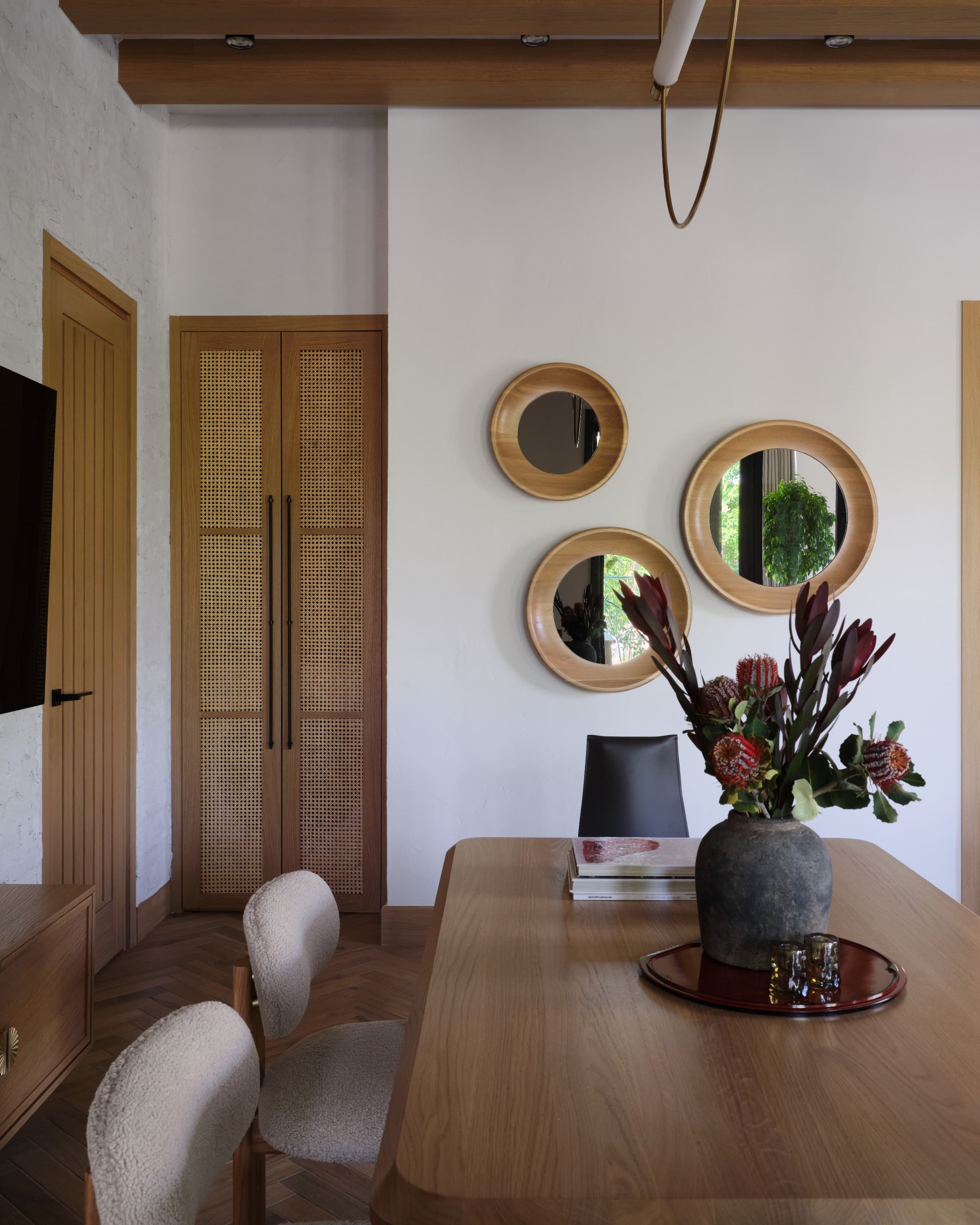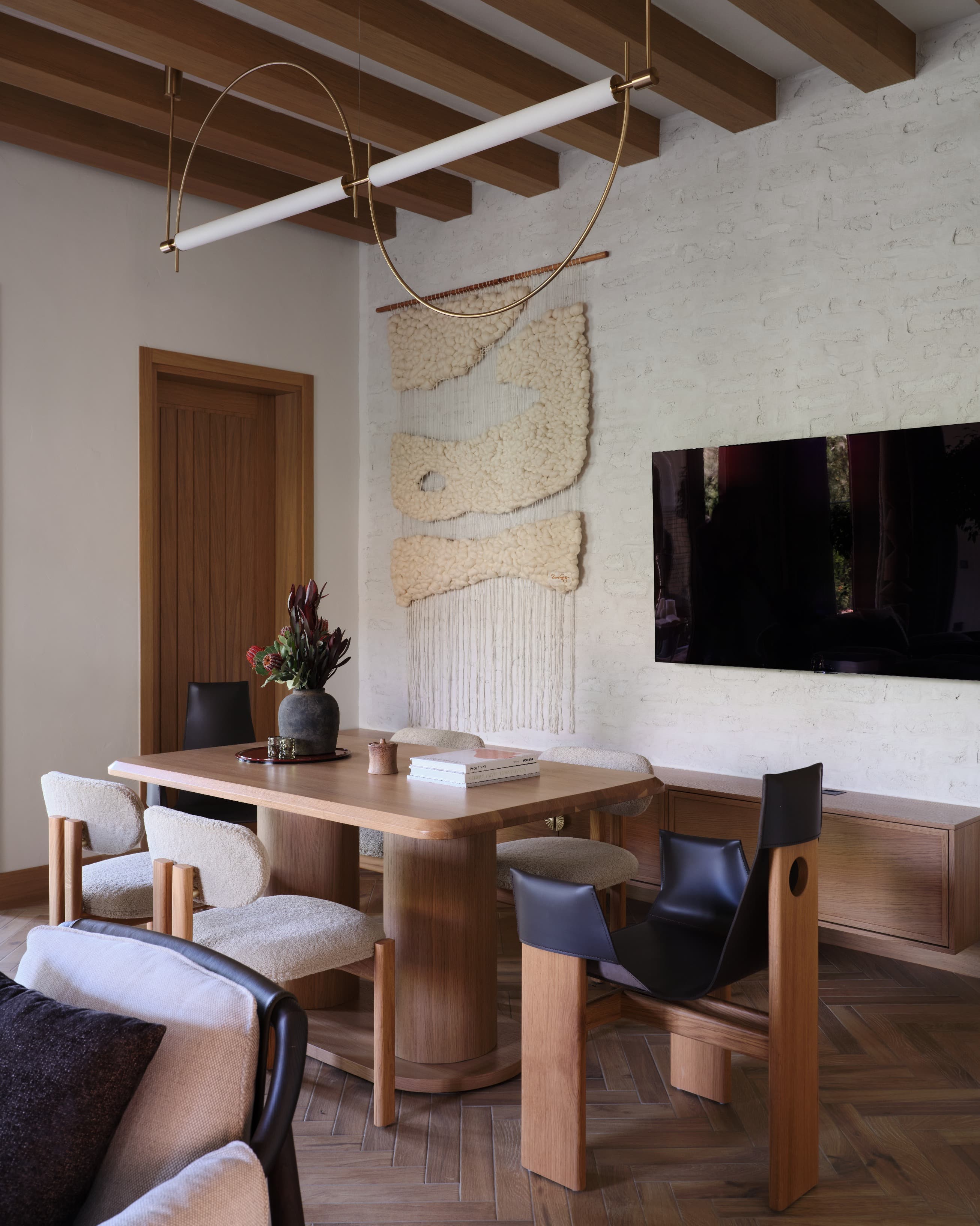 «Каминная зона обставлена модульной мебелью мягких круглых форм. В столовой преобладает натуральное дерево, от открытых потолочных балок до дверных проемов и обеденного стола. Главный акцент здесь — стулья с контрастной обивкой: легкие, мягкие ткани сочетаются с яркими геометрическими кожаными спинками, создавая визуальную многослойность. Композиция из круглых зеркал на стене смягчает углы и отражает свет, гармонично отражая плавные формы мебели».