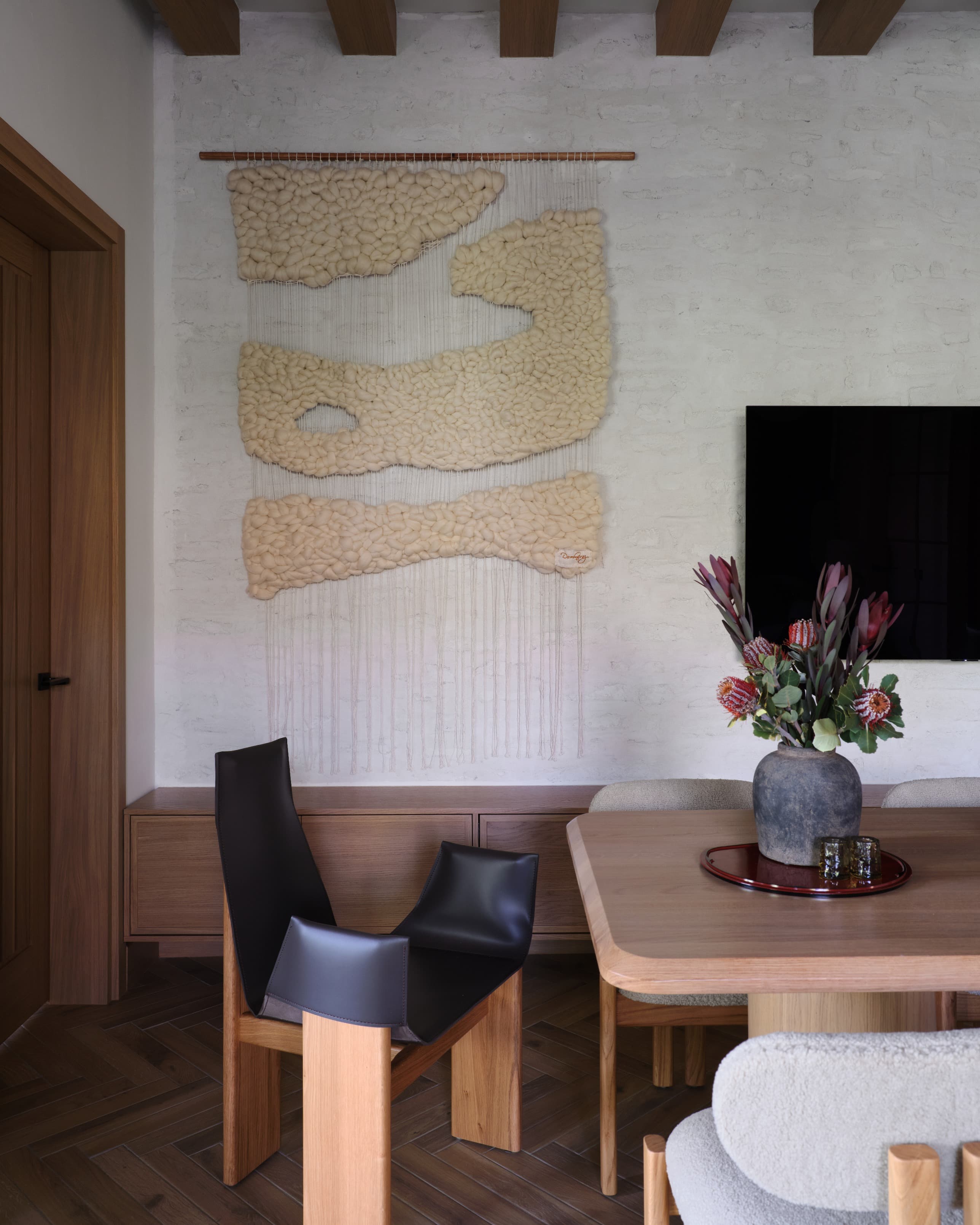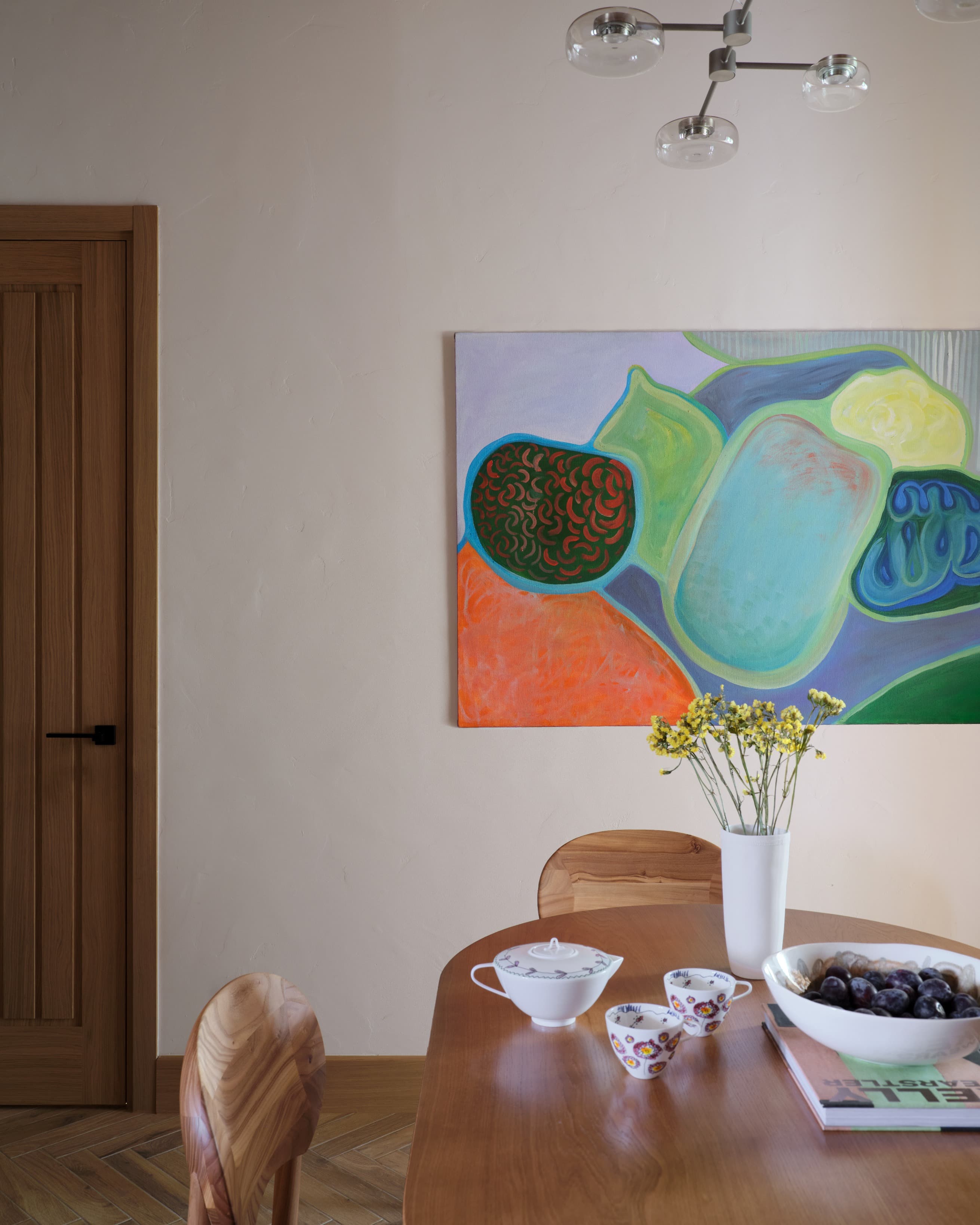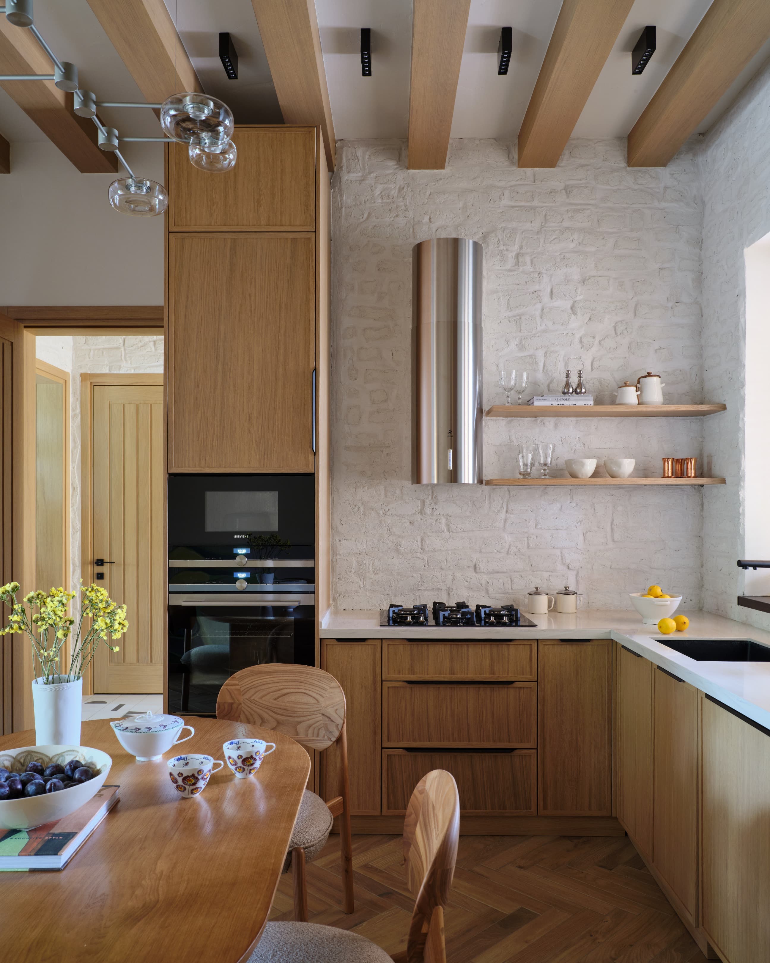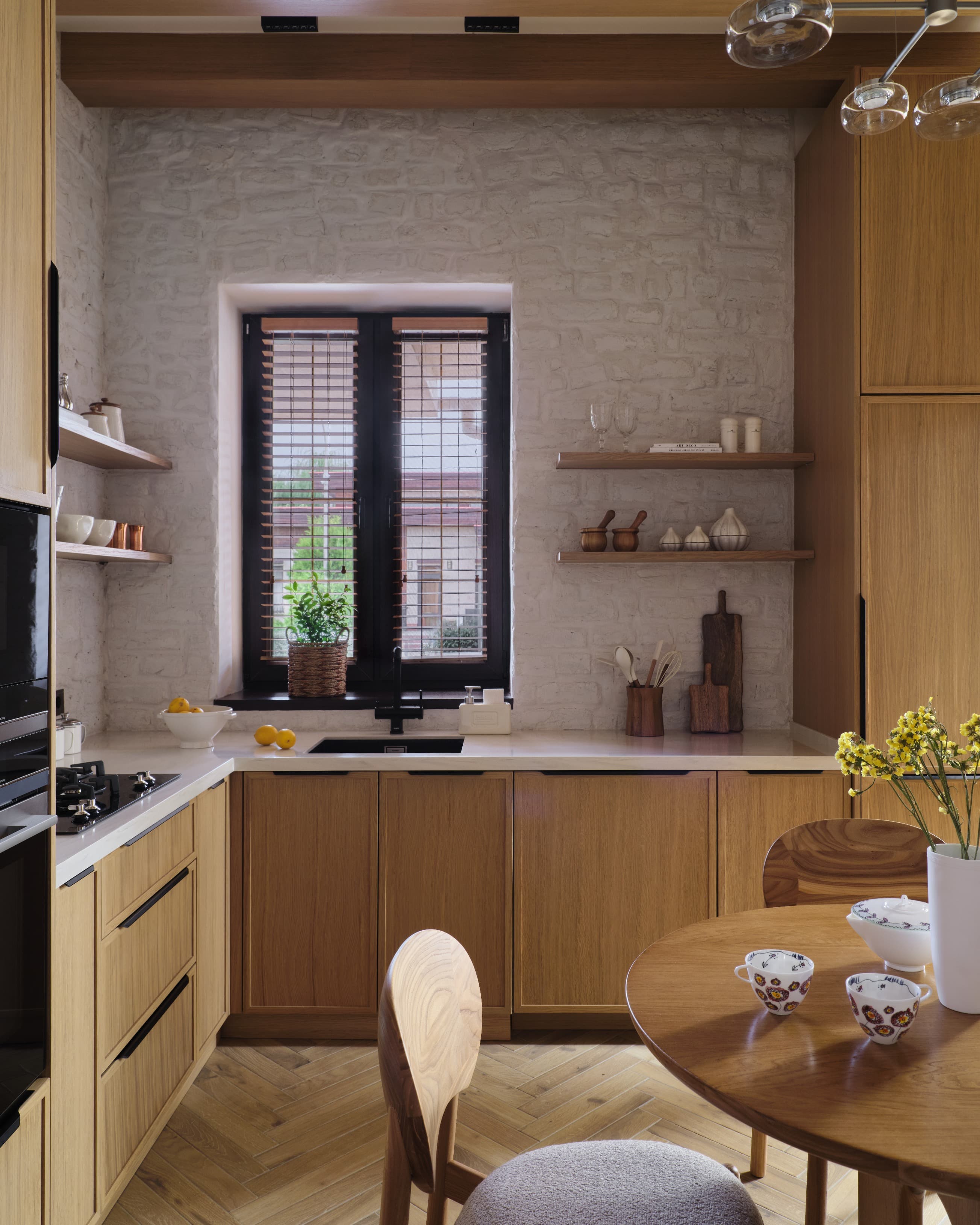 «Главным вдохновением для дизайна кухни, наполненной уютом и теплом, послужил предмет коллекционирования ХХ века: работа дизайнера Жанно Петерса. Рабочее пространство продумано до мелочей: мы установили встроенную технику, удобные выдвижные системы и открытые полки, на которых можно разместить специи и красивые аксессуары. Для обеденной зоны мы выбрали овальный деревянный стол и элегантные стулья с мягкими сиденьями местного производства – создавая уютное место для семейного завтрака и уютные ужины».