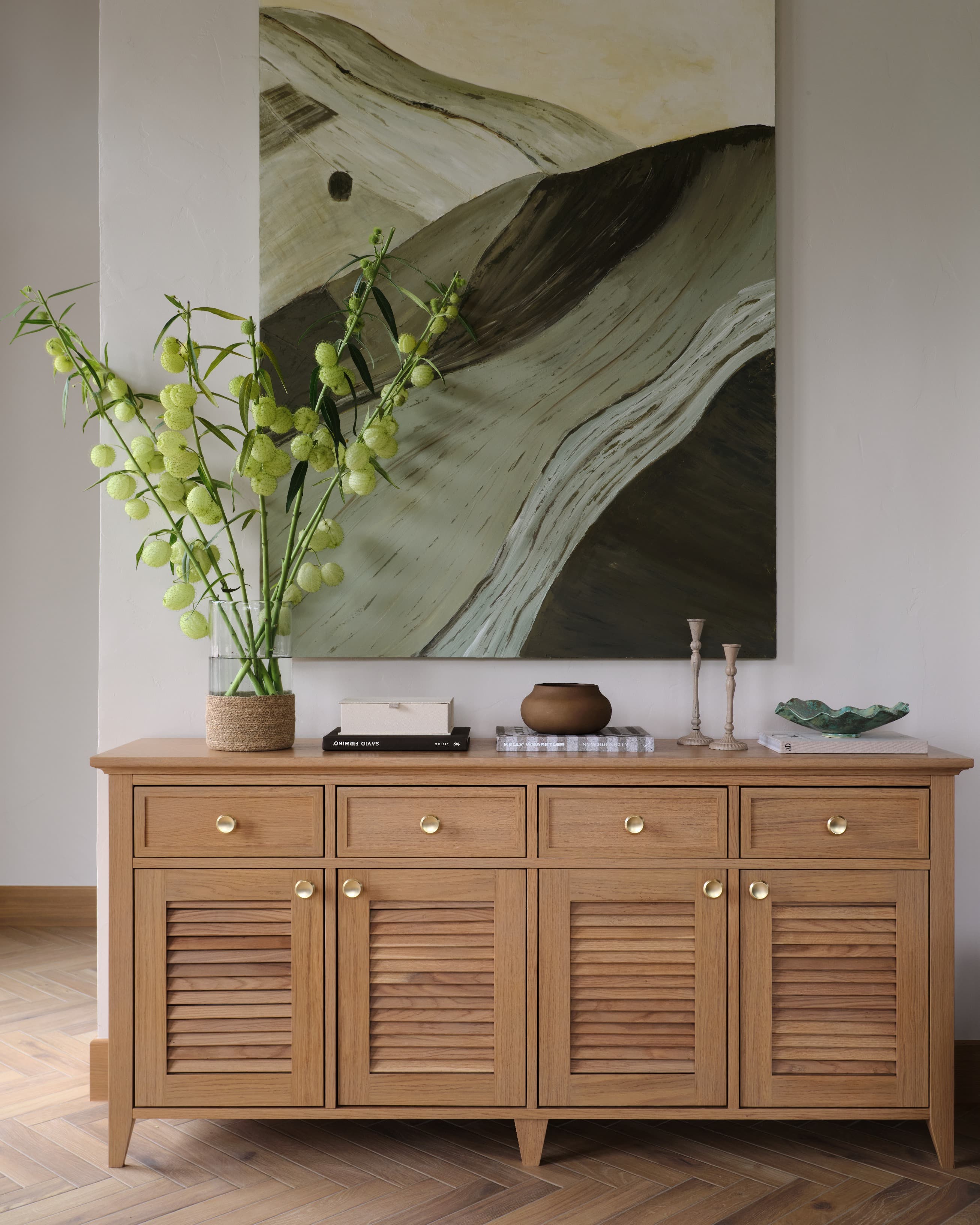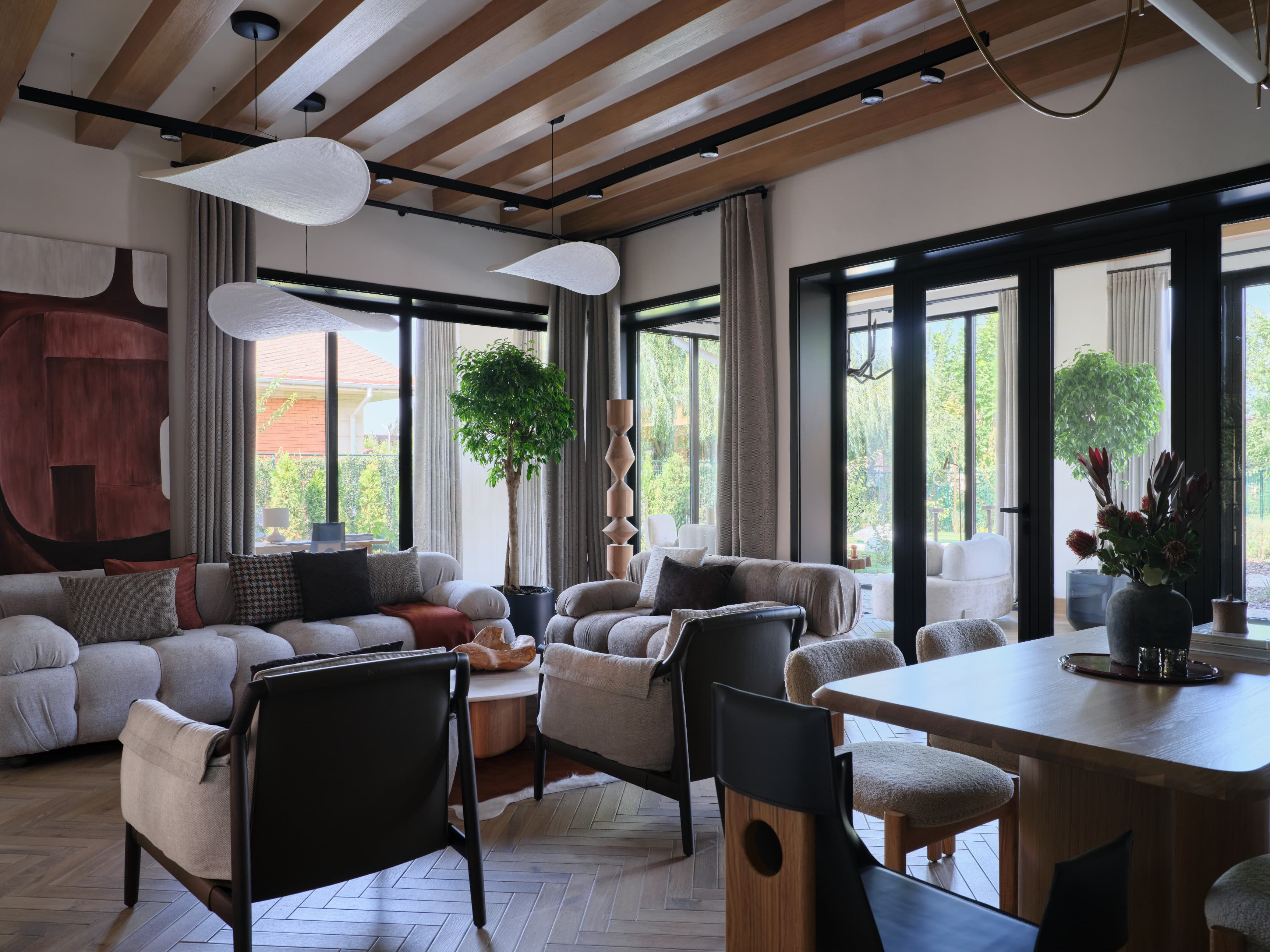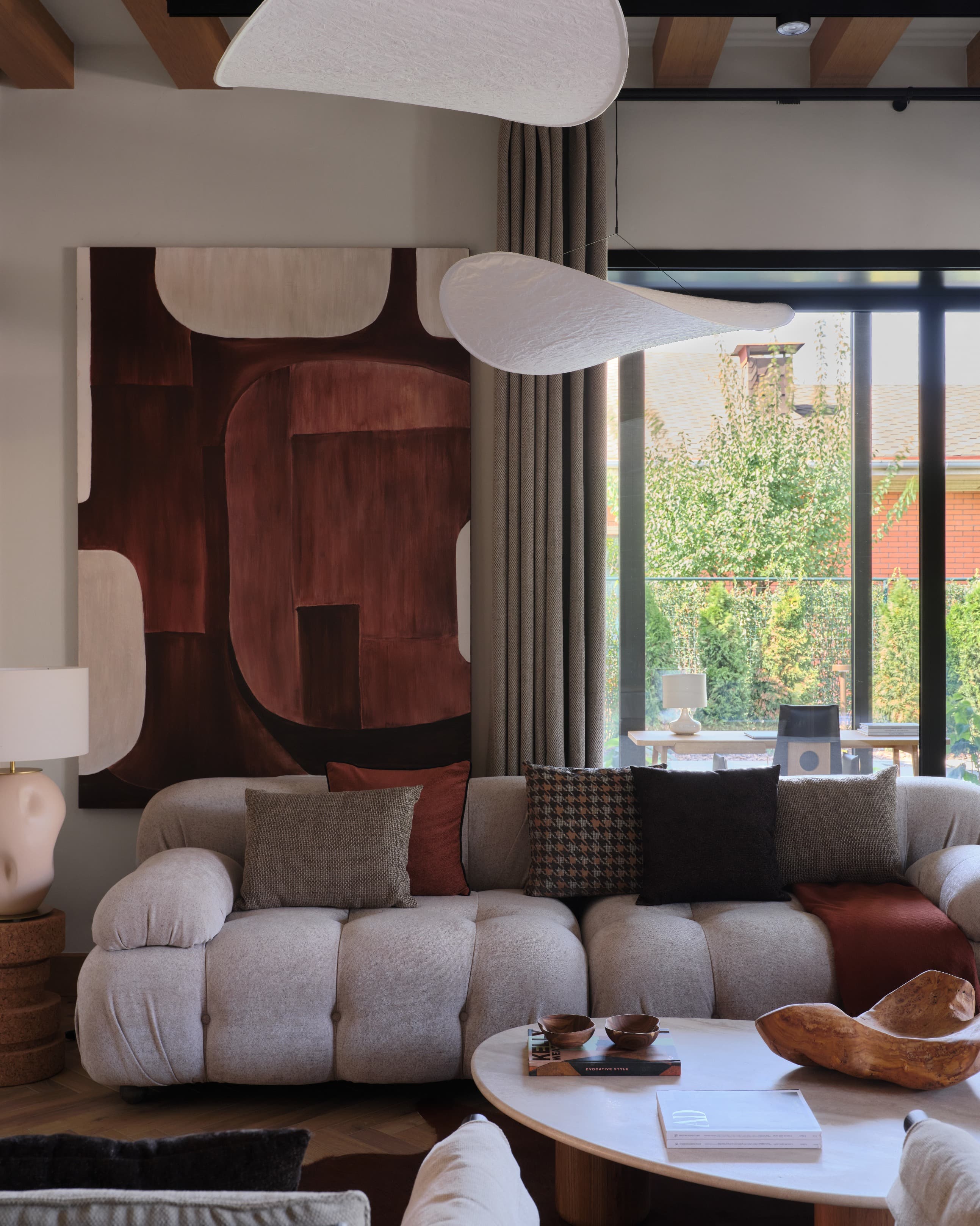 «В гостиной мы постарались соединить натуральные фактуры – теплые деревянные балки и стеновые панели – и грубые, но невероятно тактильные ткани на мягкой мебели. Центральным акцентом комнаты стал журнальный столик с мраморной столешницей и уникальная деревянная ваза. Особое внимание мы уделили освещению: свет светильников, напоминающий невесомые облака, создает мягкую, обволакивающую, почти медитативную атмосферу. А большая абстрактная картина в терракотовых тонах стала душой интерьера: она привносит динамизм, страсть и глубокая эстетика».