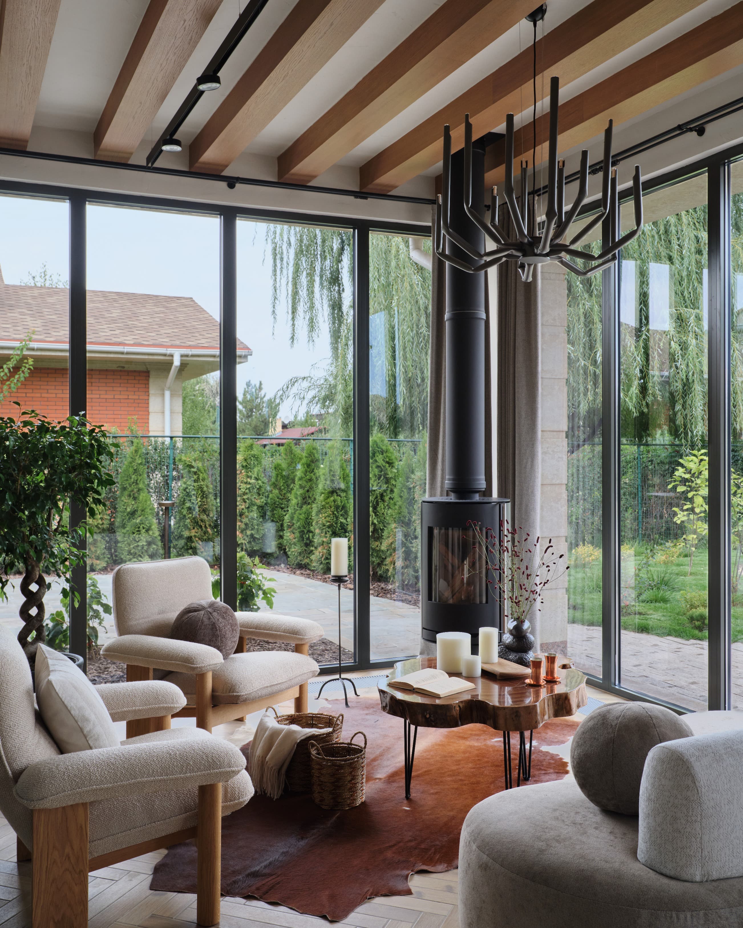 «Одно из самых выразительных архитектурных решений — совпадение уровня пола с линией фундамента», — говорит автор проекта. «Это создает ощущение, что природа буквально вторгается в дом. Когда я работал над проектом, я был в Европе и хотел привнести в проект немного старой европейской эстетики. Поэтому в отделке был использован состаренный белый кирпич – такой же, какой традиционно используется в классических европейских коттеджах. Этот элемент оказался самым сложным в реализации: вместе с декораторами мы почти девять месяцев работали над созданием идеального образца, позволяющего добиться желаемого оттенка, фактуры и эффекта естественного старения».
