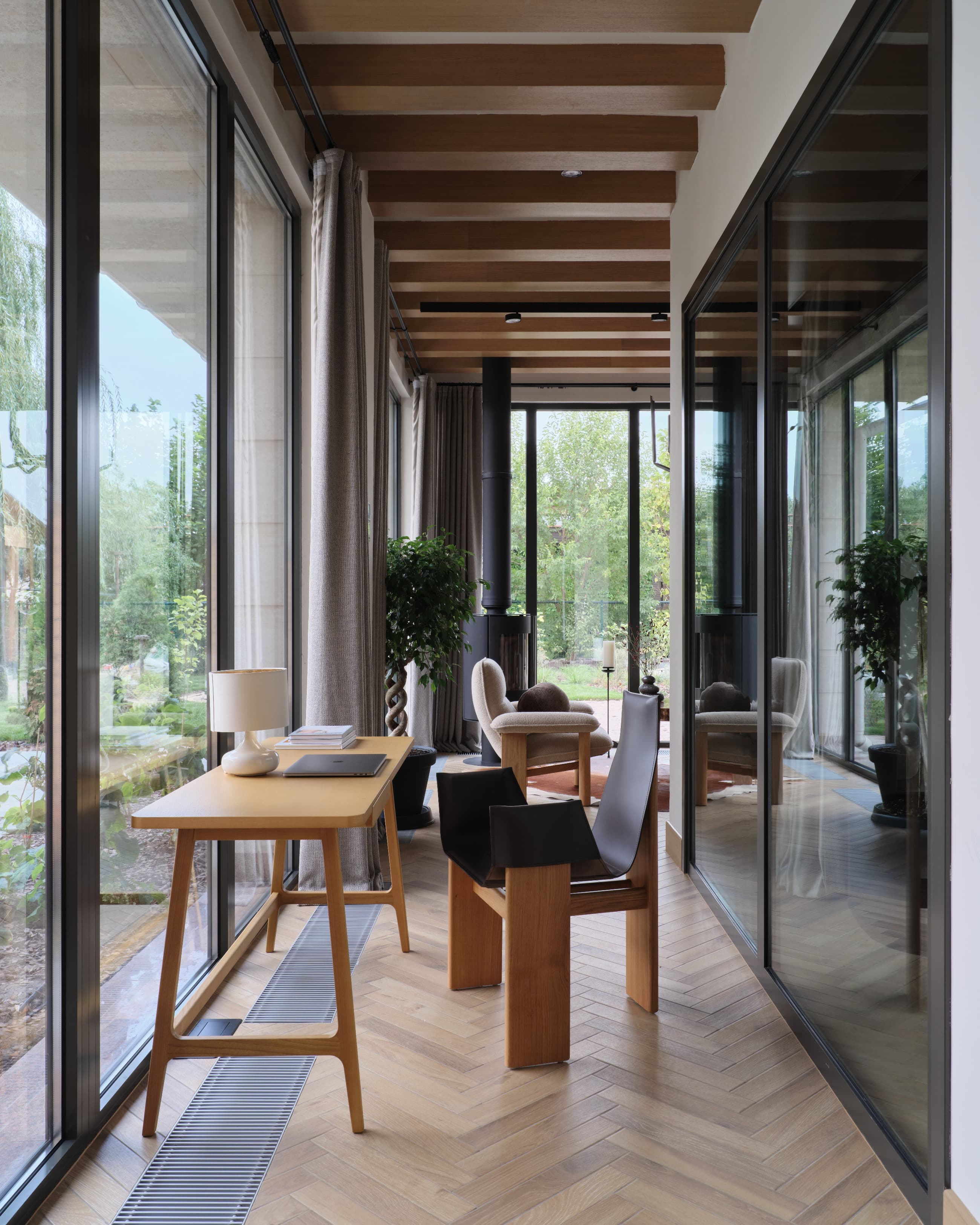 «Рабочее пространство создано специально для отца заказчика. Светлое дерево и панорамные окна создают ощущение простора и связи с природой — идеальные условия для сосредоточенной и продуктивной работы. Вид на сад наполняет пространство вдохновением и помогает отвлечься во время коротких перерывов».